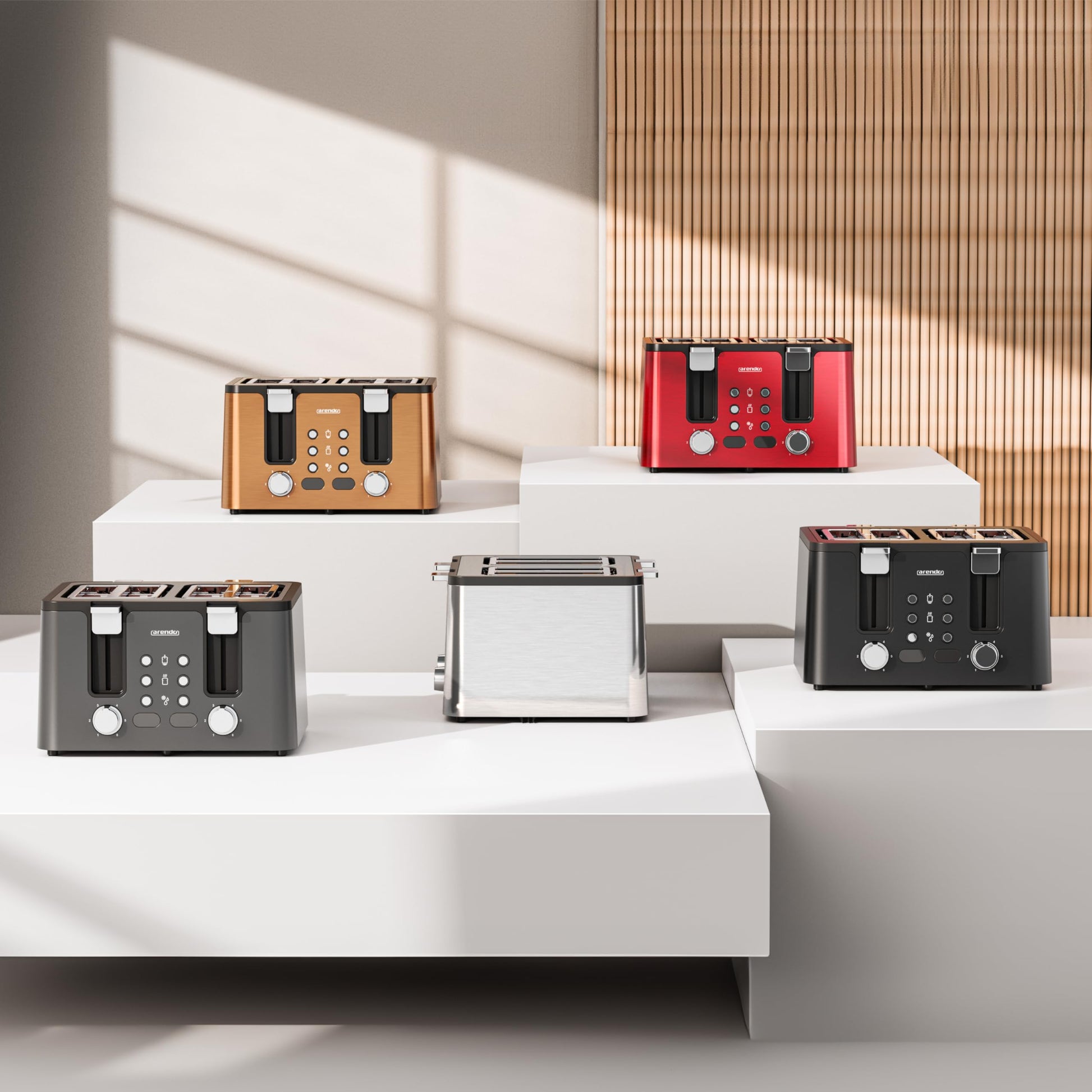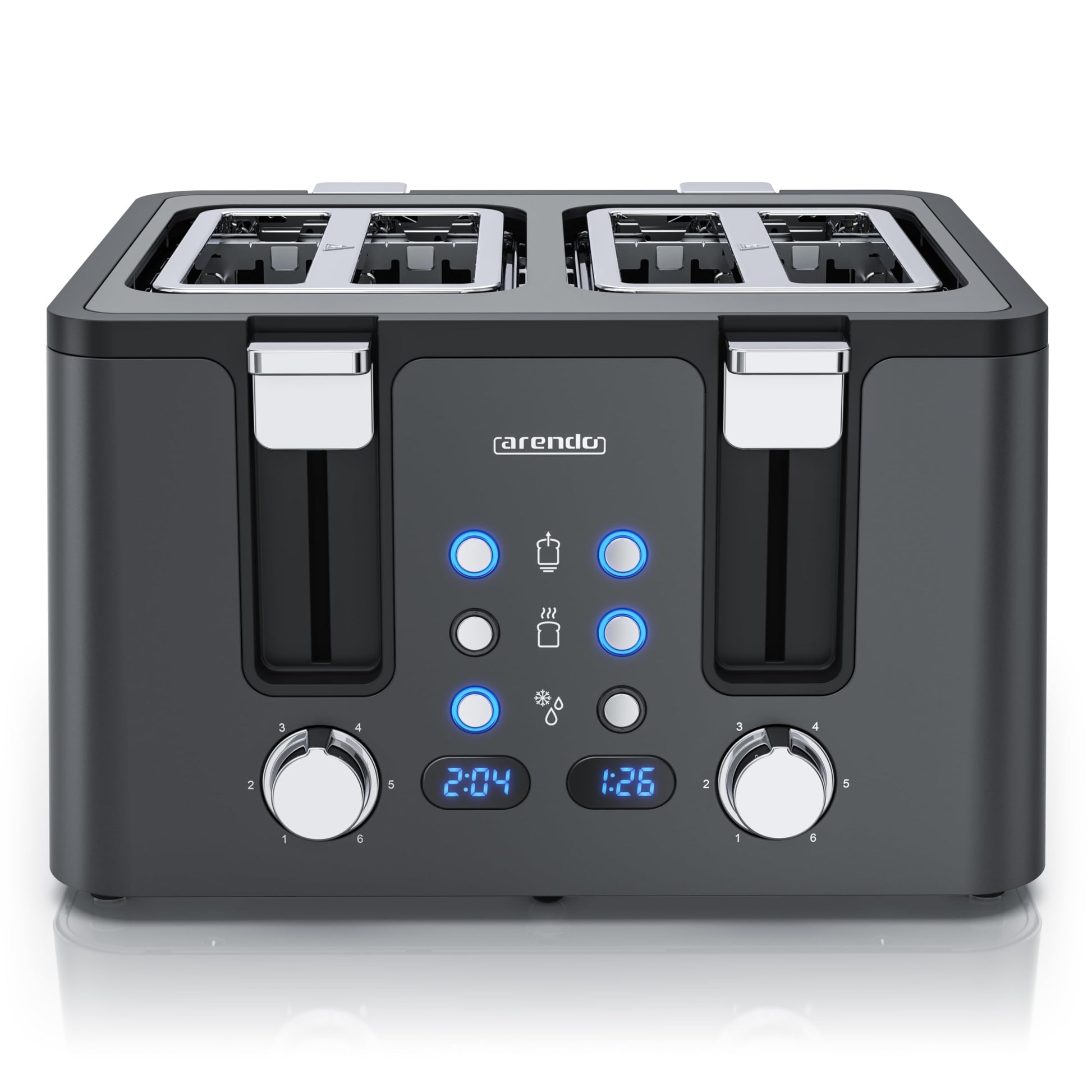 Arendo - 4-Slice Stainless Steel Toaster - with Bun Attachment - 4 Slots - LED Display Countdown Timer - Double-Wall Housing - Defrost Function - Crumb Tray - 6 Browning Levels - Cool Grey Design