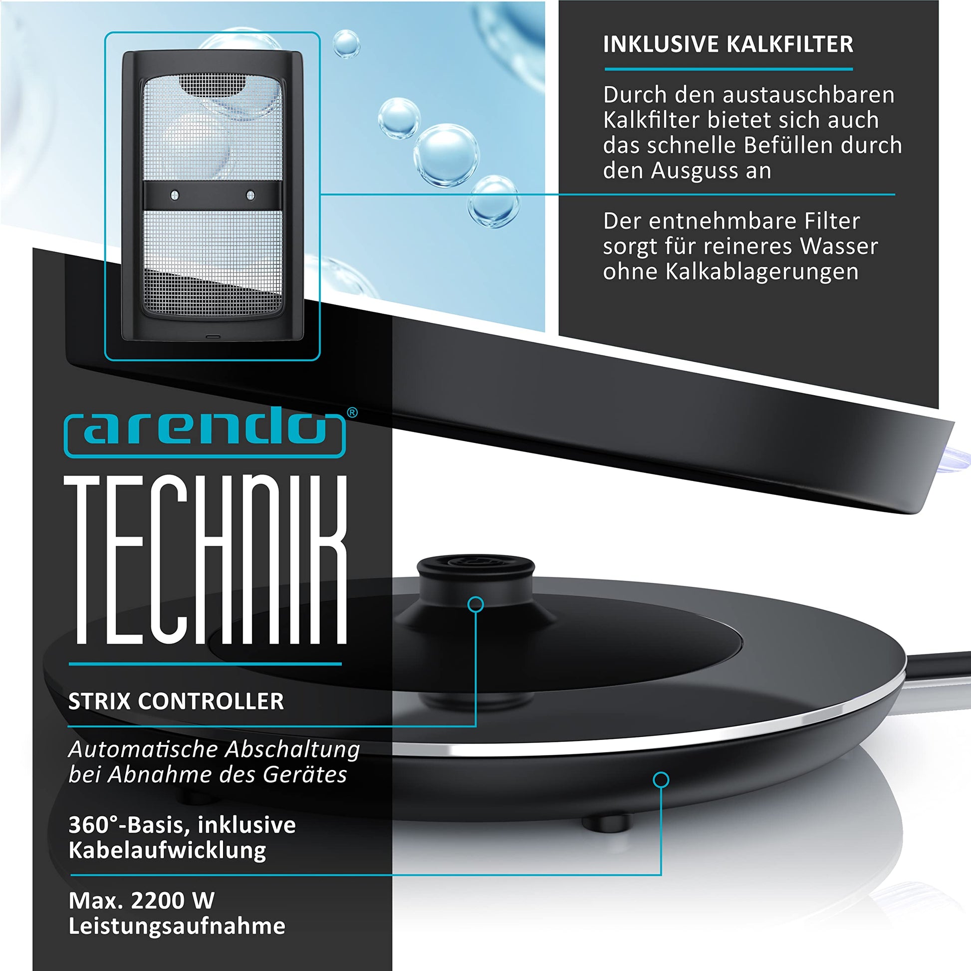 "ARENDO STAINLESS STEEL KETTLE in copper retro look. Classic on the outside, modern on the inside. The hidden stainless steel heating element allows for a smooth bottom design, perfect for easy cleaning. The integrated limescale filter ensures pure water and great taste. With 2200 watts and 1.7 liters capacity, the kettle is ideal for filling large pots. The easy-to-read water level indicator with quantity marking makes this effortless."
