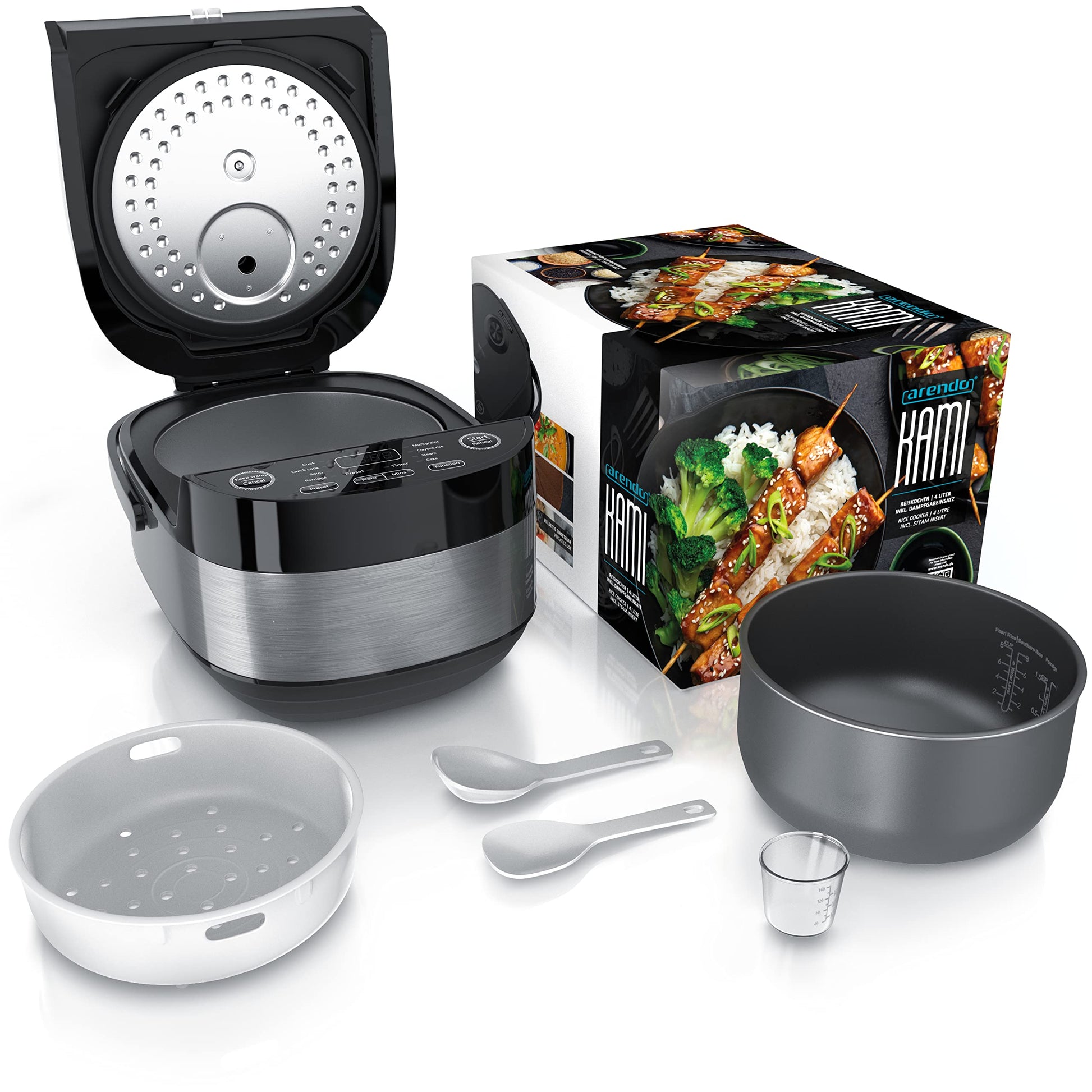 ["PREMIUM RICE COOKER AND IDEAL KITCHEN HELPER. The Arendo KAMI prepares your rice perfectly: Whether white or red rice, brown rice or sushi. And besides: With this multifunctional device, you can cook delicious soups, steam vegetables, and bake cakes. With 4 liters capacity and steaming insert. | 305648",