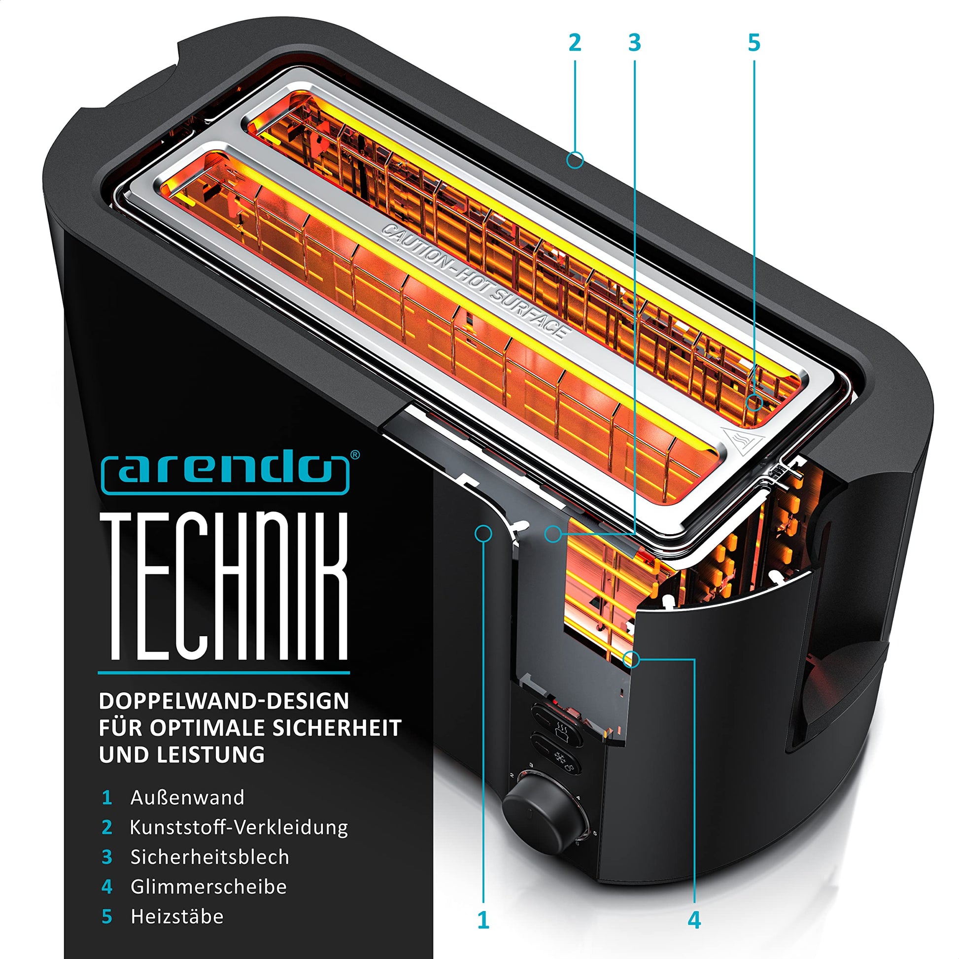 ["MASSIVE CONSTRUCTION, MODERN FEATURES: The Arendo MANHA offers a stainless steel housing and comes with top equipment such as LCD countdown display, defrost and reheat function, and integrated bun warmer. The powerful 1500 W device can toast four slices of bread in one go with its two long slots, perfect for a family breakfast. Ideal for weekend mornings. | GS - Certified Safety. | 305655","TOASTING MADE EASY: Thanks to the LCD display with countdown timer, you'll know exactly how long the current toasting process will take. The chosen toasting level is also displayed for your convenience.","LIGHTLY BROWNED, CRISPY OR CRUNCHY: Adjust the browning level easily with six settings. For optimal toasting results, we recommend levels 1-4 for toasts and sandwiches. The bread centering feature ensures even browning on both sides of the bread.","PRODUCT FEATURES: 4-slice long slot toaster 1500 W / Defrost and reheat function / 3 control buttons (Reheat/ Cancel/Defrost) with blue LED indicators | Browning control dial 1-6 | Display with countdown timer and chosen toasting level | Integrated bun warmer | Crumb tray | Cord wrap | Anti-slip feet | Double wall housing","TECHNICAL DETAILS: Dimensions (without bun attachment): H x L x W: 19.5 cm x 38 cm x 18.5 cm | Power cord length: 87 cm / Cord diameter: 6.1 mm | Weight: approx. 2 kg | Material: mostly stainless steel, minimal plastic | Package includes: Arendo MANHA 4-slice stainless steel long slot toaster with bun warmer + User manual"]