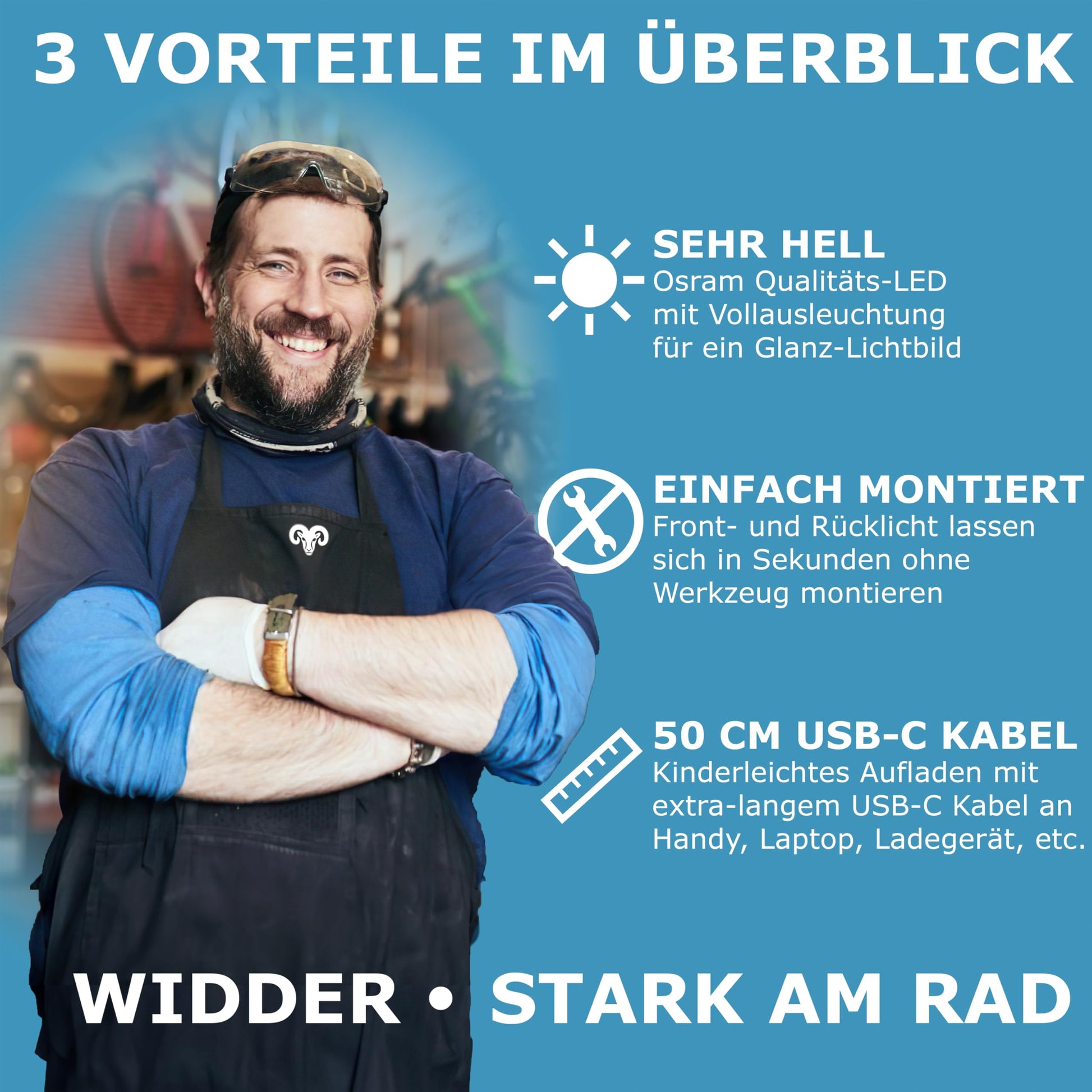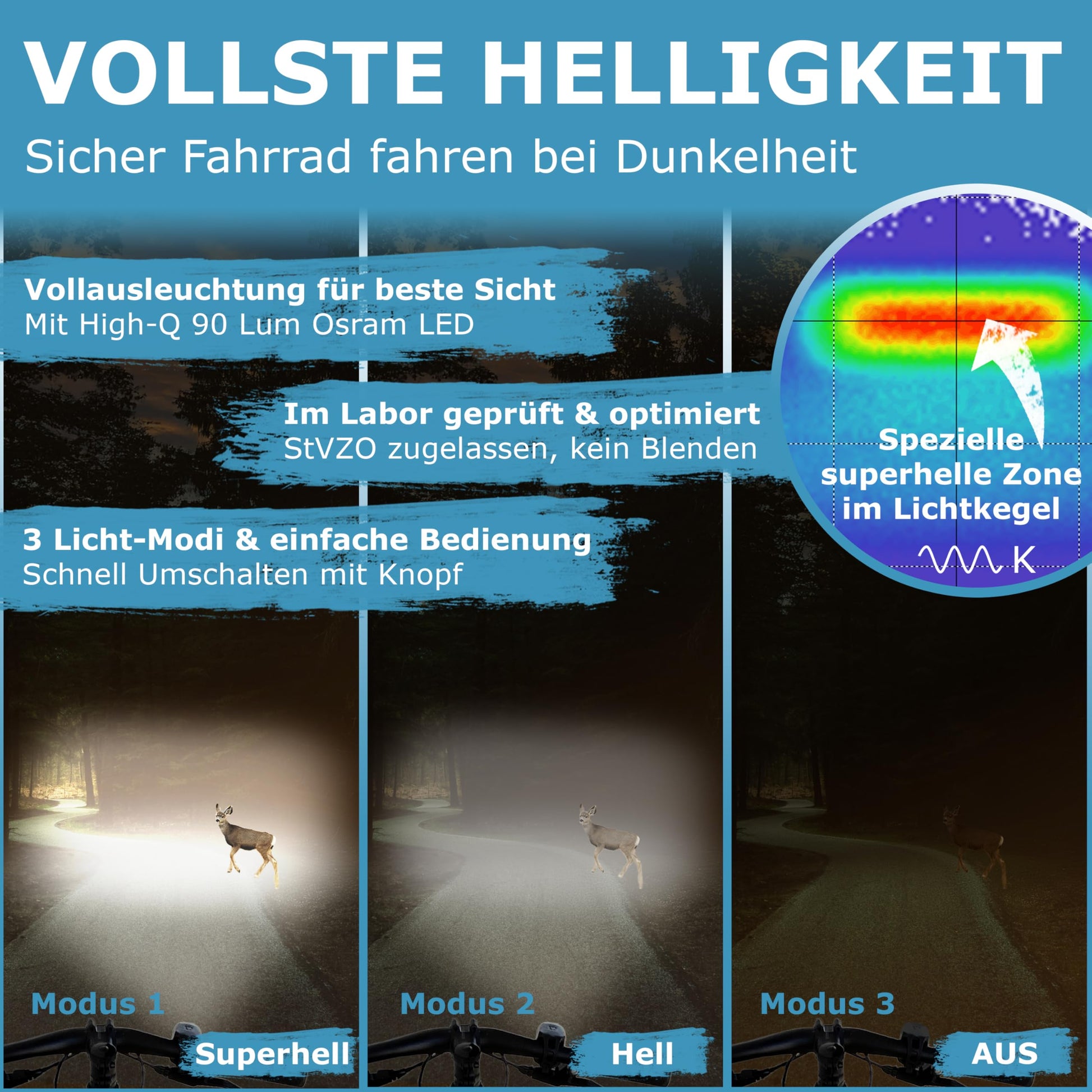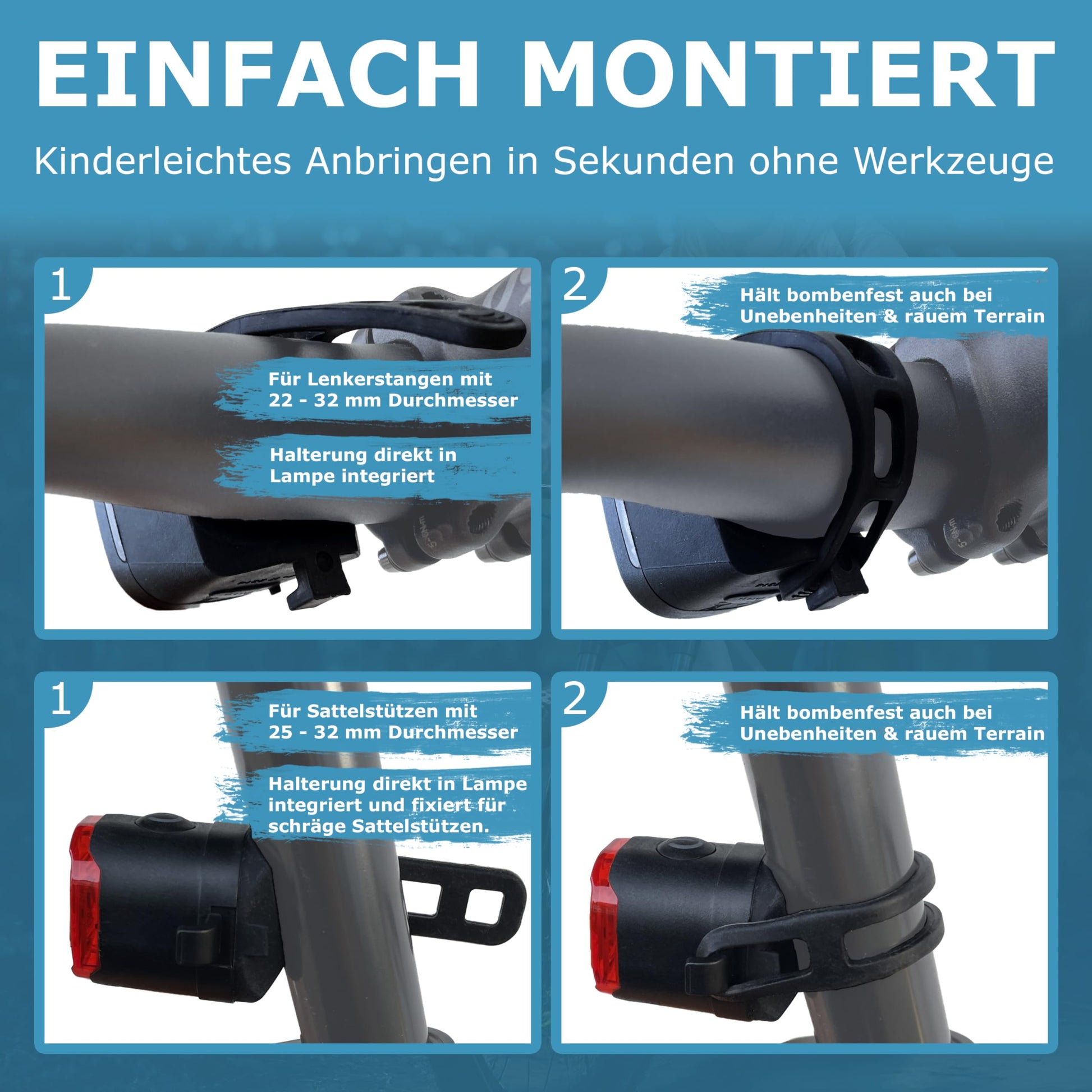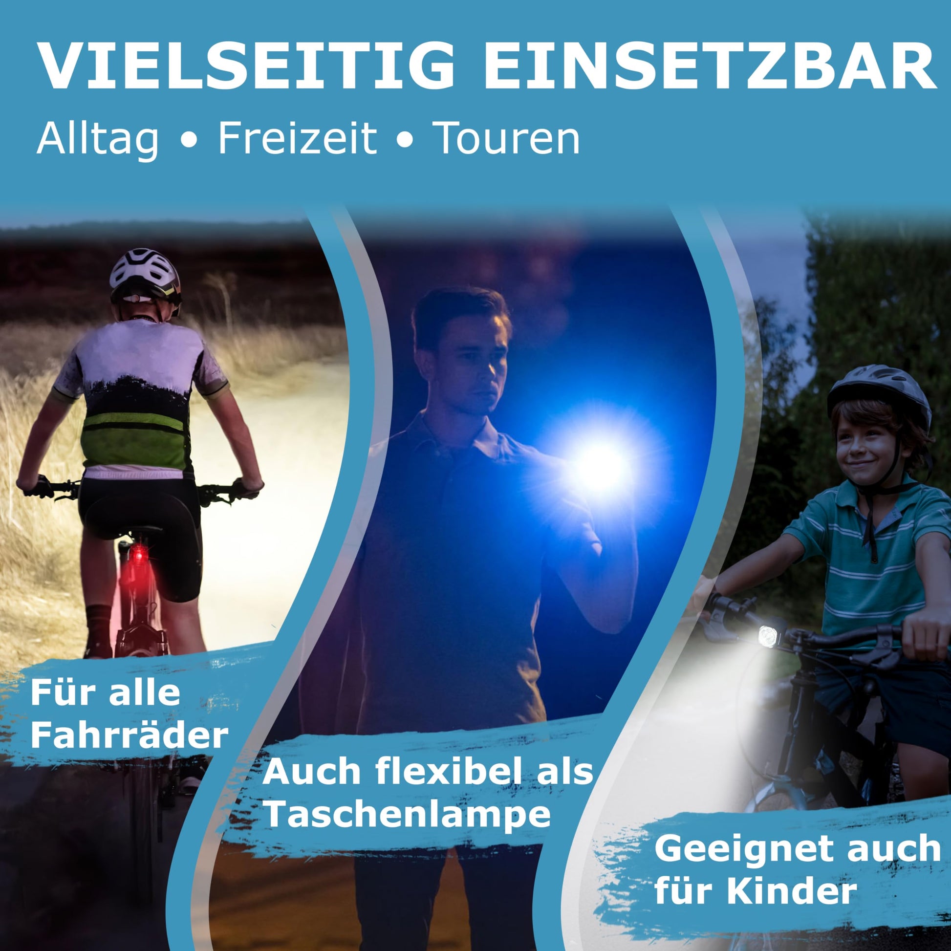 ["VERY BRIGHT & VERY SAFE - The front light with a HQ 90 Lum LED and the rear light ensure optimal visibility in darkness and bad weather. Both lights are StVZO approved and provide glare-free bicycle lighting, a bicycle light set for the best visibility & safety", "COMPACT & LIGHTWEIGHT - With only 48 g (front light) and 26 g (rear light), the lighting set is small & handy, without compromising on the brightness of the bike lamp. Fits easily in pockets and backpacks - ideal for on the go", "EASY TOOL-FREE INSTALLATION - Thanks to weather-resistant silicone mounts, the lights can be attached and removed in seconds. Suitable for handlebars and seat posts of various sizes. Ideal for a variety of bicycles, road bike light, gravel bike light, MTB light & bicycle light children's bike and E scooter light", "MULTIFUNCTIONAL & VERSATILE - Not only as a bicycle light set, but also as a flashlight, stroller light, balance bike, kids' bike, scooter & walking aid light", "EXTRA-LONG USB-CABLE & LONG-LASTING BATTERY - The USB-C rechargeable fast-charging battery provides up to 3.5 hours (front light) and 6 hours (bicycle rear light) of illumination. Both lights are made of durable materials for long-lasting performance & durability. Convenient and quick charging with the extra 50 cm long USB Type-C charging cable, no more fumbling around because the charging cable is too short", "CUSTOMER SERVICE MADE IN GERMANY - When it matters, we are here for you: fast, uncomplicated, and professional. It's no wonder our customers trust in the quality of our bicycle products"]