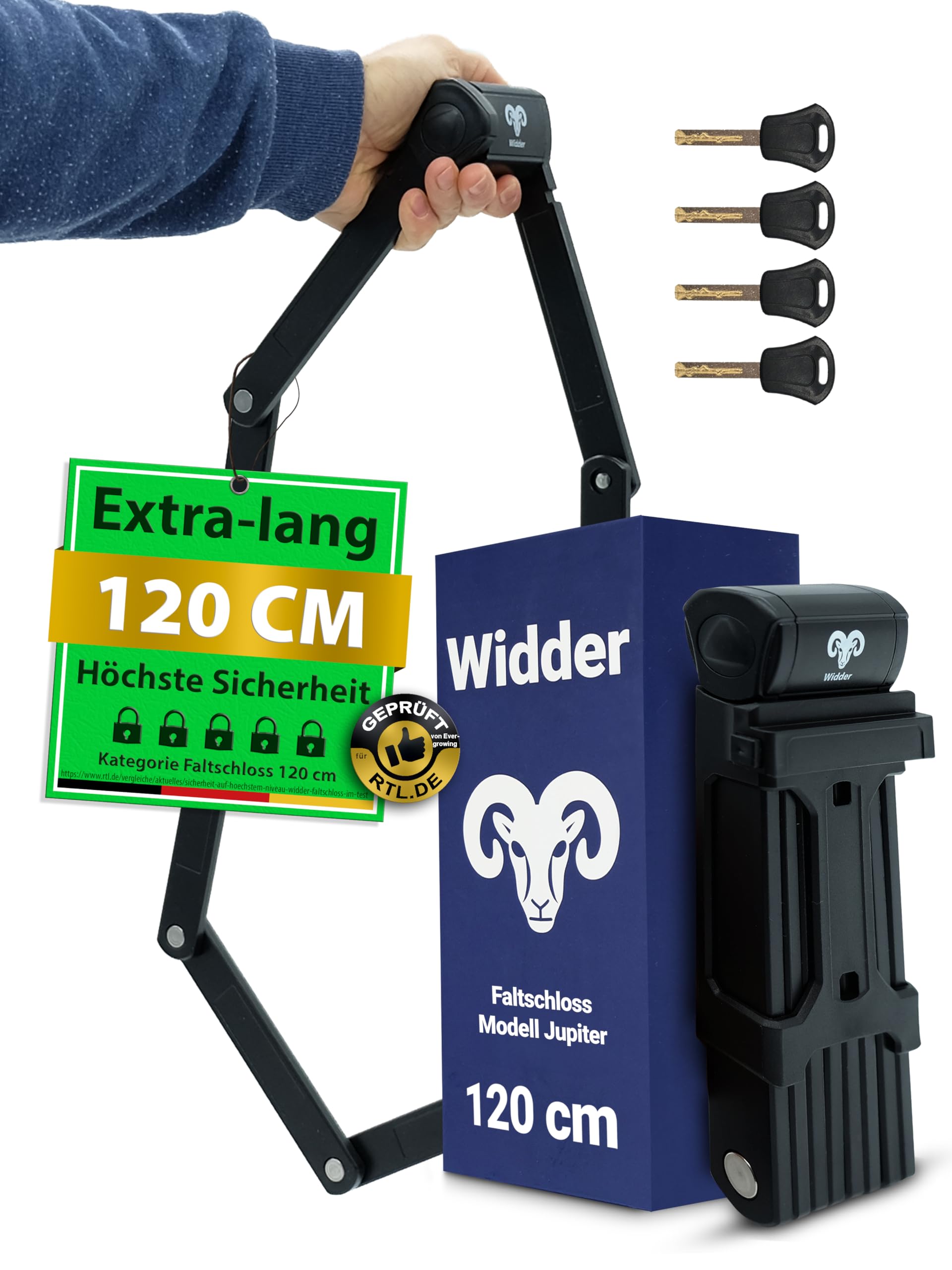 "STRONG ON THE WHEEL - Highest theft protection against bolt cutters, saws & hammers thanks to the special steel core in the link lock. Unlike other bicycle folding locks, the Widder folding lock of the Jupiter type offers extra bicycle theft protection. The foldable links are 25 x 8 mm wide - Power that works.