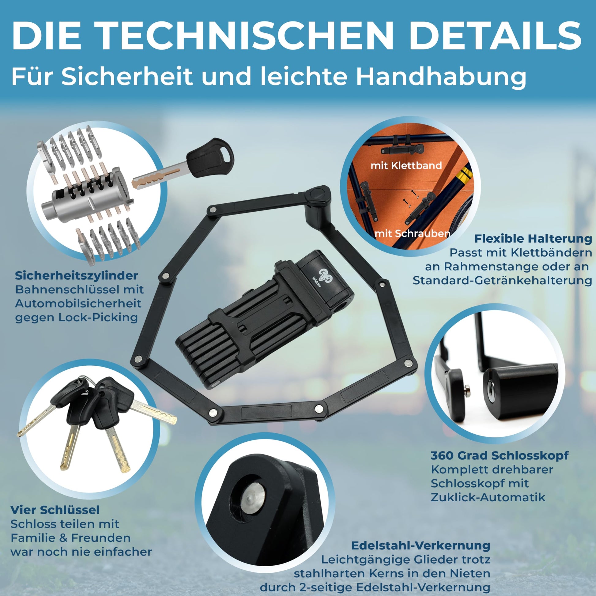 THE BEST BIKE LOCK IN THE WORLD? - Of course, we are familiar with these advertising promises as well. Bicycle lock security must always be balanced with weight and ease of use, especially with a folding lock. Therefore, we can say for our bike folding lock: theft-proof with optimized handling and maximum length."