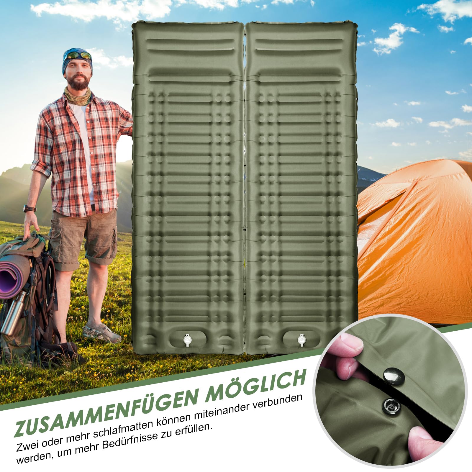 ["【Thicker & Wider for Maximum Comfort】Are you still looking for a comfortable, spacious, and airtight self-inflating sleeping pad? Our sleeping mat is thicker and wider than comparable models, inflated to 78.7 x 26.8 x 4.7 inches. It protects against damp ground and hard stones, allowing you to sleep warm and comfortable all night long.","【Ultralight & Compact – Perfect for Outdoor】At only 2.2 pounds and a packed size of 11 x 5.9 inches, the ultralight sleeping pad effortlessly fits into any backpack. The generous 78.7 x 26.8 x 4.7 inch size offers high comfort – making this outdoor sleeping pad the ideal tent mattress for camping, trekking, festivals, hiking.","【Improved Built-In Pump】To shorten the inflation time of the camping sleeping pad, we optimized the pump: A high-quality sponge with a larger surface area and better elasticity ensures that the mat is fully inflated in just 1 minute. After removing the air plug, it deflates completely in less than 1 minute.","【Side Button Design】For more flexibility in outdoor use, you can connect two inflatable sleeping pads to create a double bed with the side buttons! Perfect for camping, hiking, and outdoor adventures – without tipping over or running out of space.","【Waterproof & Tear-Resistant】The integrated pillow of the inflatable mattress is made for extreme adventures. The extra thick, non-toxic 40D nylon is puncture-resistant, waterproof, and tear-resistant. Thanks to sealed lamination technology and TPU coating, the self-inflating air mattress offers reliable protection under demanding conditions and is a perfect match for tents, sleeping bags, and camping cots."]
