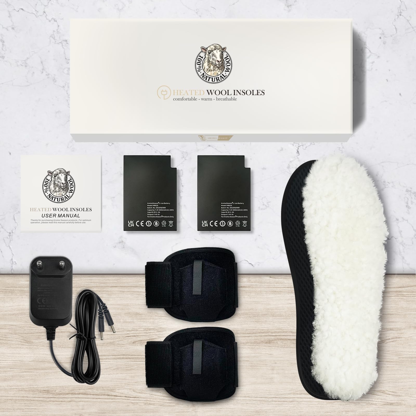 AROMA SEASON Heated insoles with sheep wool battery | Warm heated feet for skiing, snowboarding, hiking, fishing | High heating and battery performance | Shoe sole (Beige, Black, 39 EU)