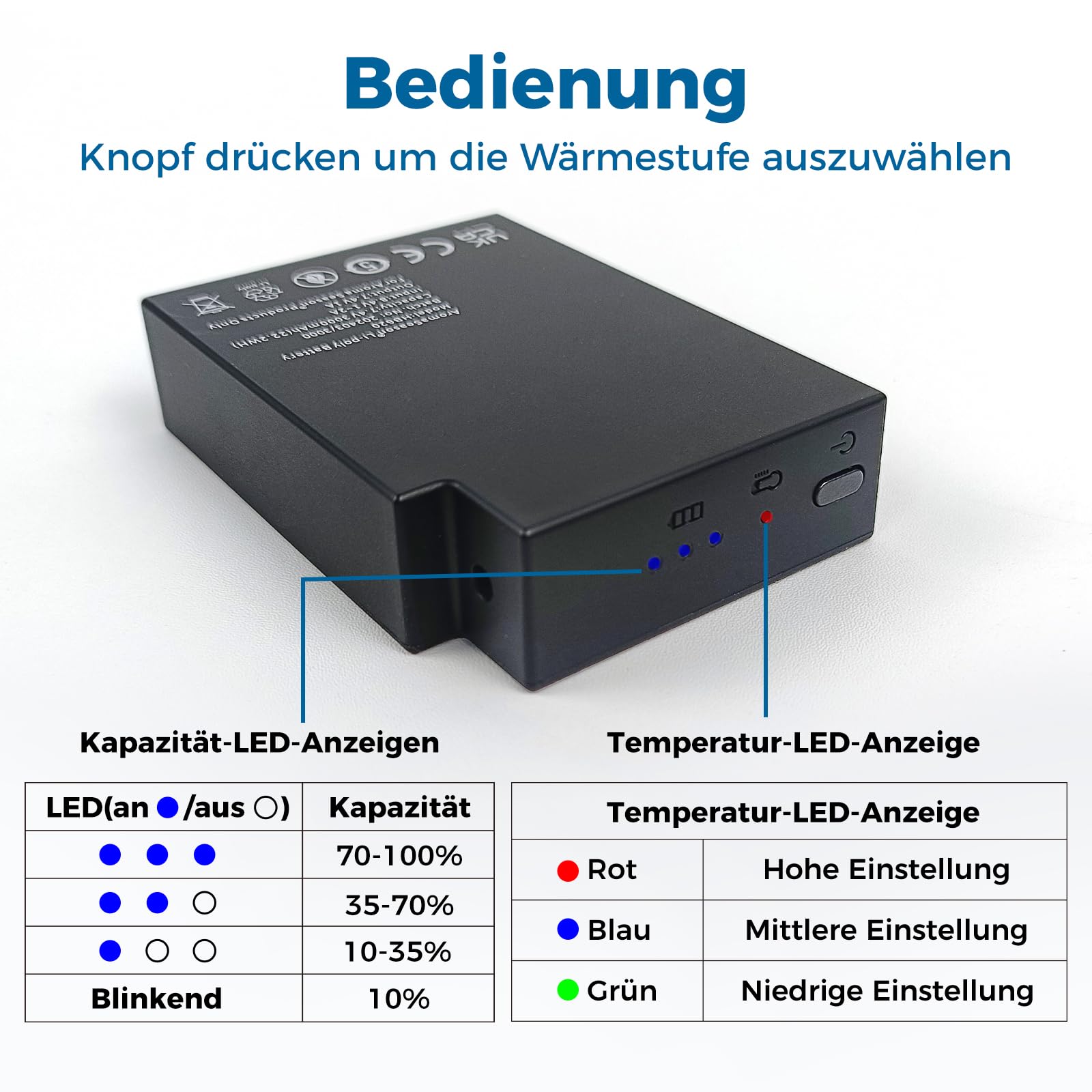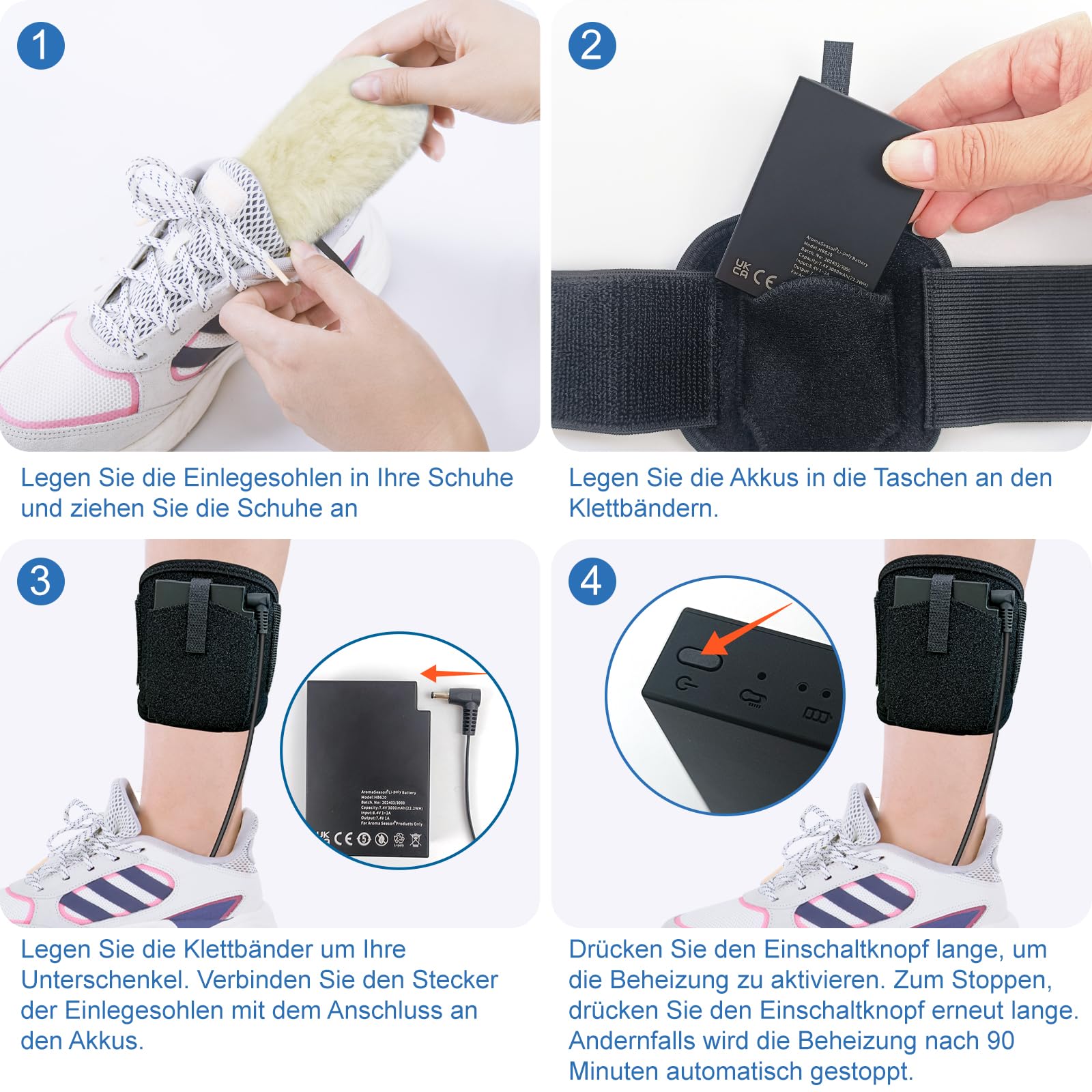 "✿WARM ALL DAY LONG -- Both insoles are heated electrically via a 3000 mAh lithium-ion battery, providing up to 10 hours of comfortable warmth per day. The extra-large heating elements cover the entire foot from heel to toes. The heat can be easily adjusted in 3 different levels. Additional batteries available under ASIN B08L4ZX4Y7!