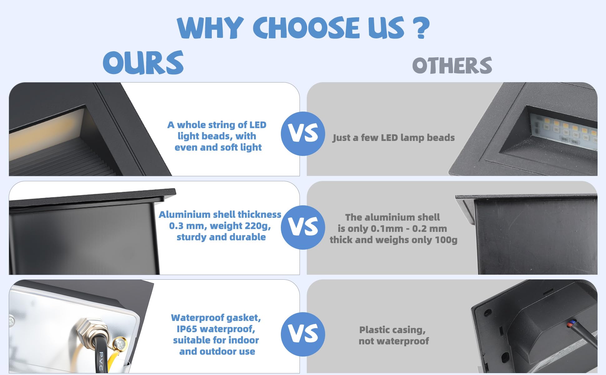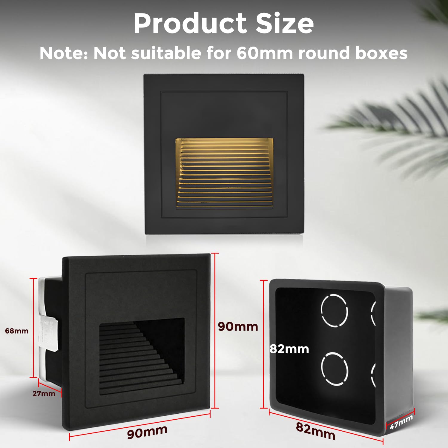 ["✨【IP65 waterproof Good Quality】Black aluminum housing, 3000K warm white, aluminum square stair light, IP65 waterproof, suitable for indoor and outdoor use. (💓IP65 can prevent splashing water and is suitable for outdoor use, but cannot be installed directly under water)","✨【Aluminum Die-casting Technology】With aluminum die-casting technology, modern and simple, AC85-265V, can be directly connected to 230V without transformer.","✨【Product Dimensions】90*90*32mm, Installation dimensions: 86mm*86mm*50mm (unfortunately does not fit a 60 mm round box. To avoid a wrong purchase, please confirm the dimensions before buying)","✨【Application】IP65 waterproof, suitable for indoor and outdoor use such as garden, patio, stairs, and steps. Great choice as a ground recessed light, orientation light, and decorative light.","✨【Package Contents】8 x LED Stair Light Black 3000K, 8 x Mounting Boxes"]