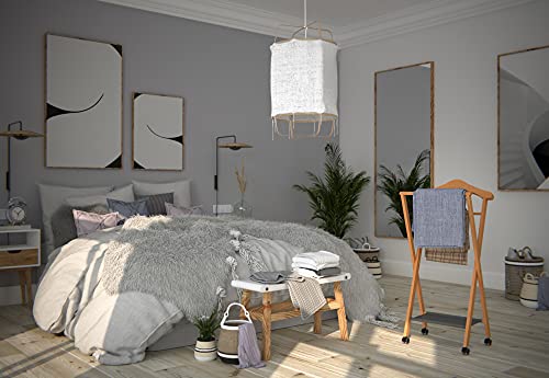 ["Made of solid beech wood, simple, foldable, and functional valet stand." "Includes a clothes hanger and a pants rail, swiveling rubber wheels for easy repositioning." "When closed, it only takes up 5 cm of space, bottom shelf made of textilene." "Getting dressed in the morning will now be even more pleasant thanks to our valet stand; here one can find their clothes ready for the next use." "Product pre-assembled - Dimensions: OPEN: 46 x H105 x 38 cm. CLOSED: H108 X 46 x 9 cm." "ORIGINAL MADE IN ITALY, exclusively from ARREDAMENTI ITALY GROUP SRL"]