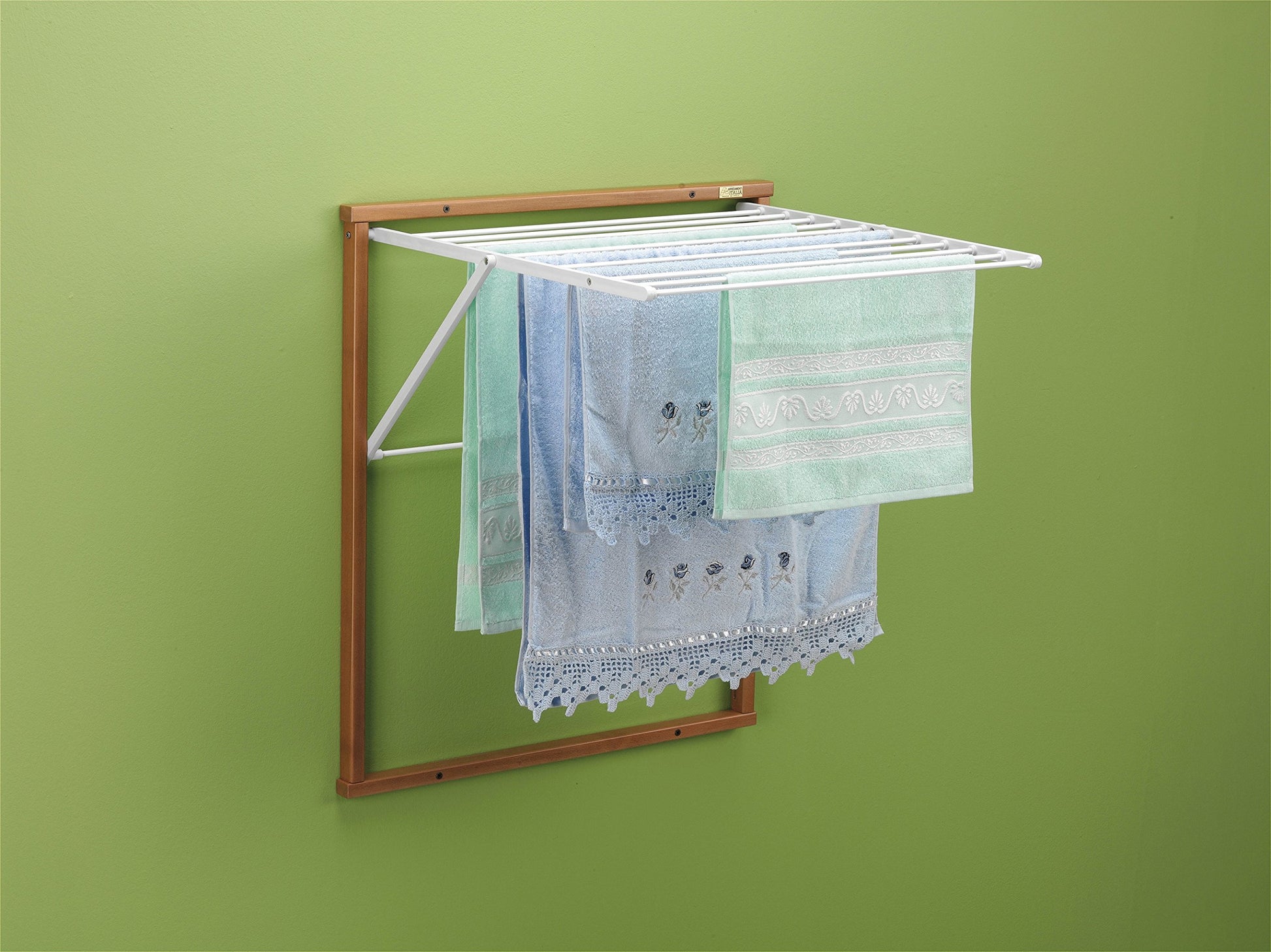 ["Solid wood frame, independent nylon wings that can be opened by the 'easy open' system.","Powder-coated aluminum rods, with 21.3 ft clothesline.","Ideal for small spaces, wall mounting dowels included.","Product pre-assembled - Dimensions: OPEN: 24.8 x 27.2 x 31.5 inches. CLOSED: 1.2 x 27.2 x 31.5 inches.","ORIGINAL MADE IN ITALY, exclusively by ARREDAMENTI ITALY GROUP SRL"]