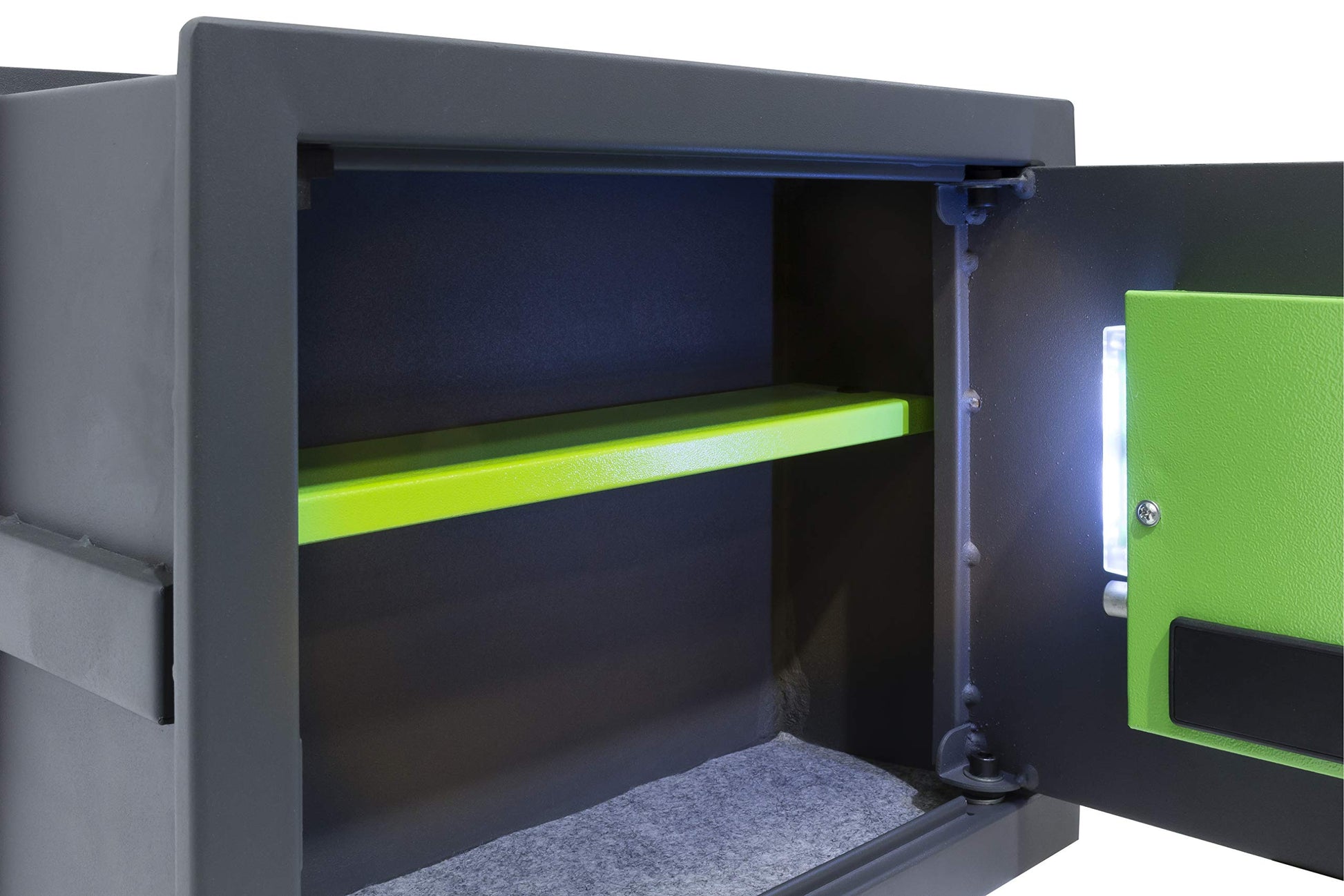 LIGHTING: Interior lighting (activated when safe is opened) and illuminated control panel (indicating the need for battery replacement). Included: safe, instruction manual, 2 emergency keys, and 4x 1.5V batteries."