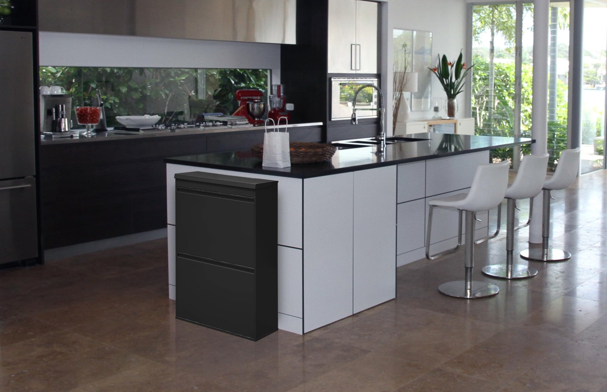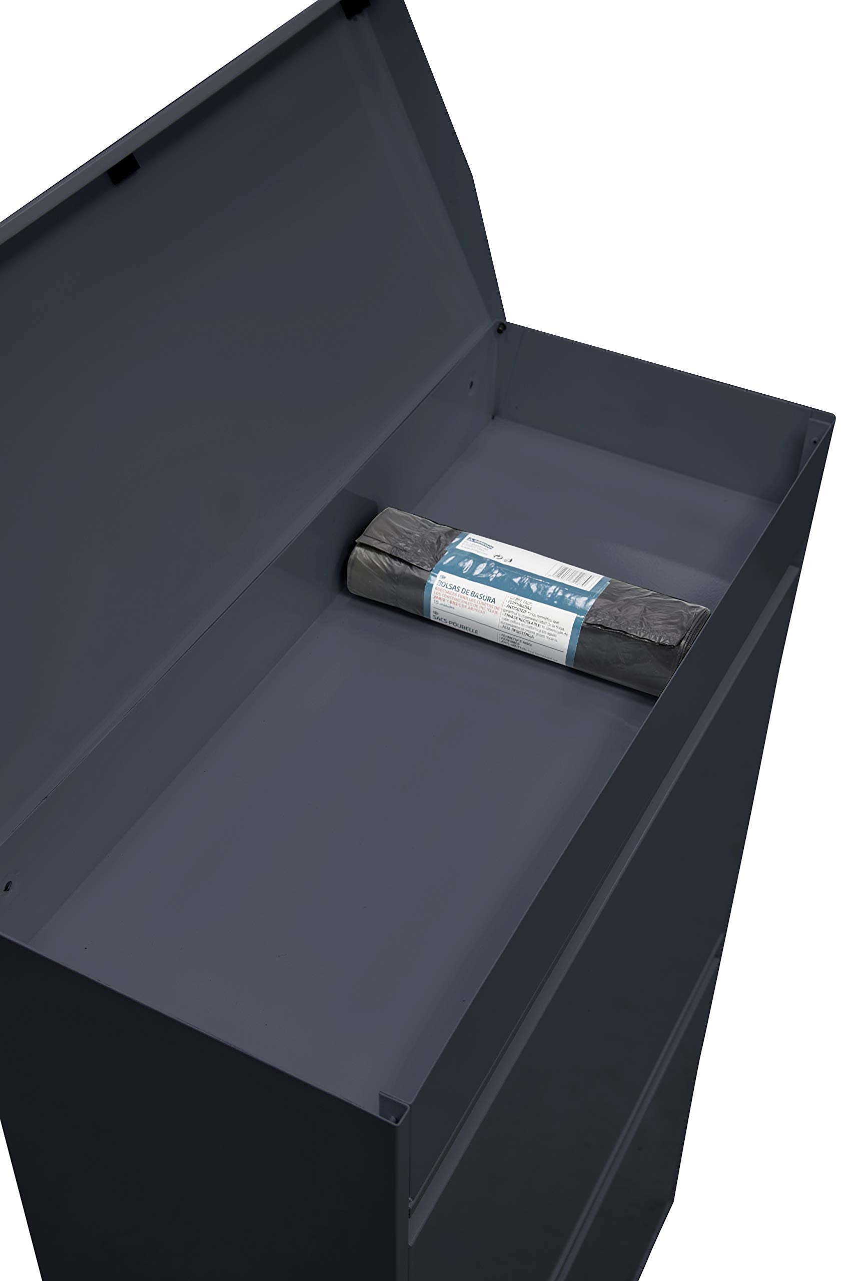 "RECYCLING MADE EASY: Developed for convenient and simple waste separation. With independent compartments and tilt opening each for 2 bins. The inner bins remain hidden inside the compartments, thus avoiding bad odors.","REMOVABLE INNER BINS: Includes 4 removable inner bins each with a capacity of 17 liters. Ideal for trash bags of 20 or 30 liters (most commonly used). Easy to remove and clean thanks to the metal handle.","STORAGE BOX: The storage box is perfect for storing trash bags and bags, and for separating small items such as batteries, coffee capsules, etc. Sold separately: trash bag dispenser CR14-B and box insert CR24-B","FOR INDOOR USE: Resistant, made of steel. Suitable for indoor use. Thanks to its design, it fits in any room. Since it is slim, a lot of space is saved. Dimensions: 97.5 x 58.6 x 24.4 cm (HxWxD). No assembly required.","STAND OR HANG: The garbage can, thanks to its great stability, can be placed directly on the floor. If you want to hang it, there are 4 pre-drilled holes (screws included)."