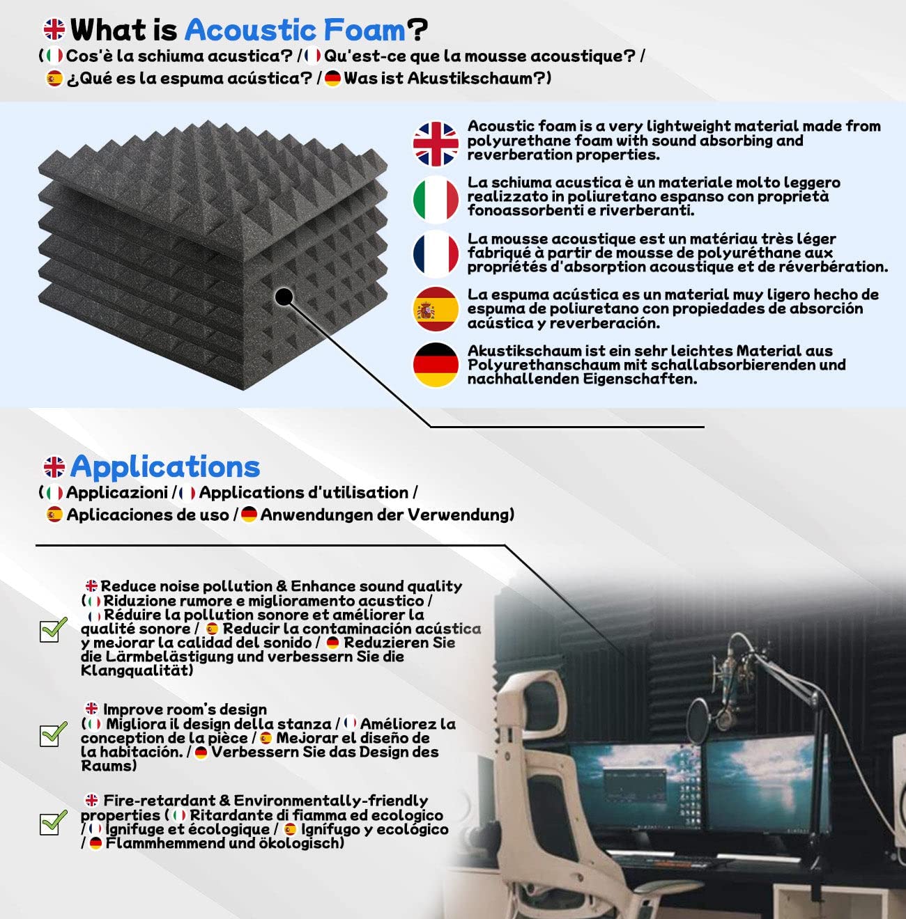"MULTI-USE: Pyramid / wedge foam is great for absorbing unwanted noise, reducing echo, and evenly reflecting sound when recording in the studio (professional microphone, musical instrument, cheap microphone), while a movie is being shown in the cinema, rehearsal room, offices, and all those spaces where you want to avoid strong noise distortion.",
