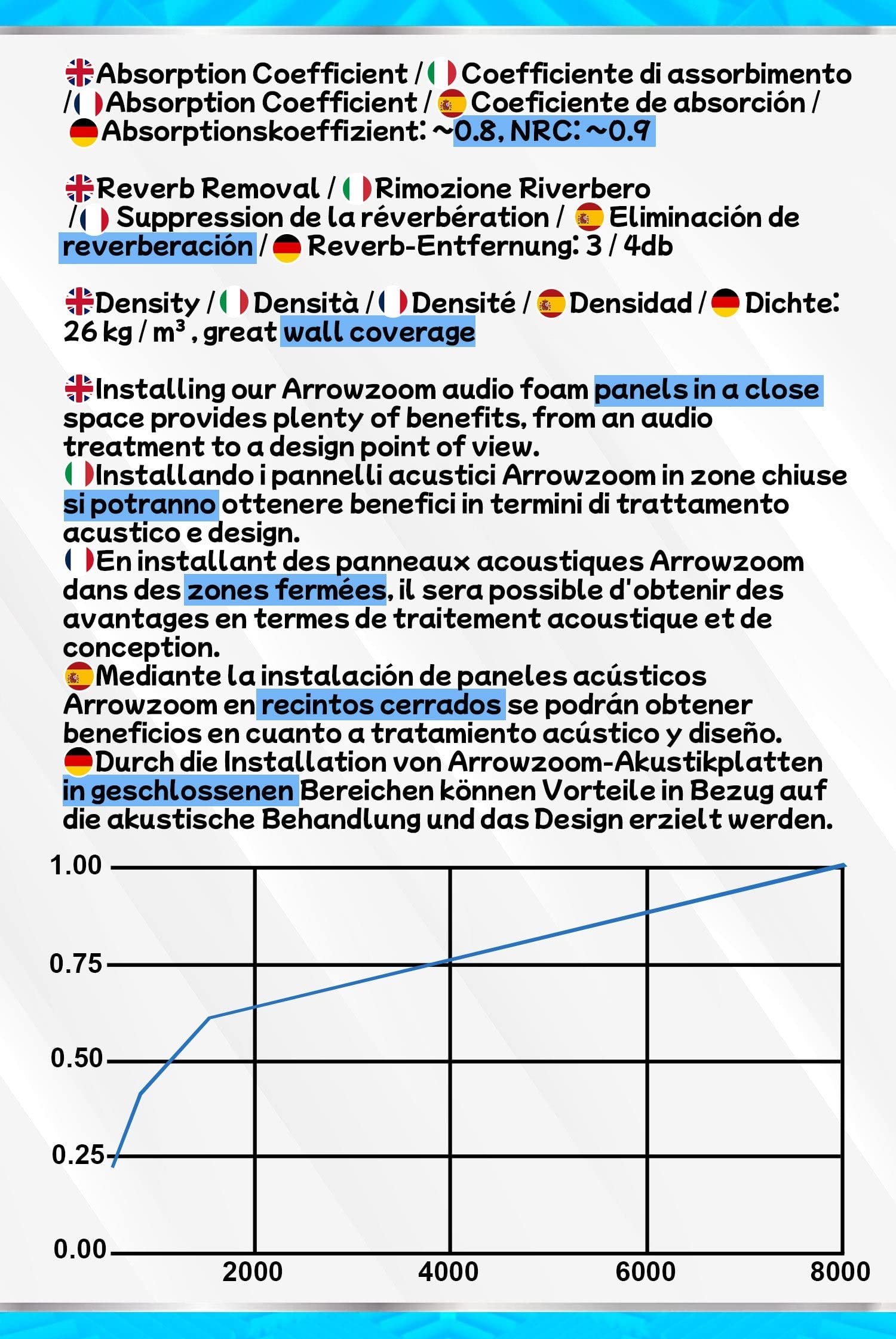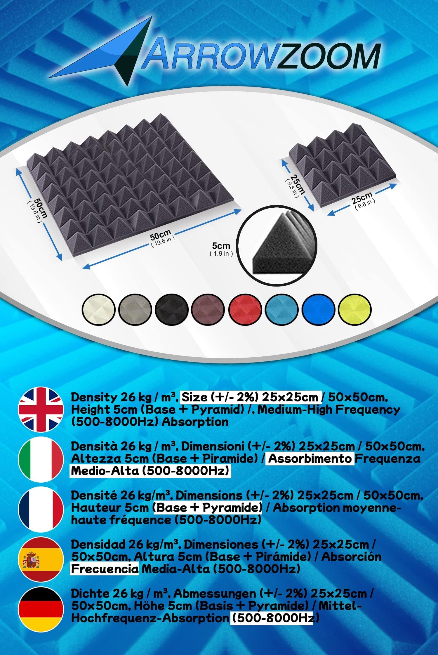 "PROFESSIONAL: Density 26 kg/m³, size (tolerance +/- 2%) 25x25x5cm, hypoallergenic, odorless, fire resistant. Hall reverberation reduction up to approx 3/4 dB. Pyramid structure for optimized flow resistance.",
