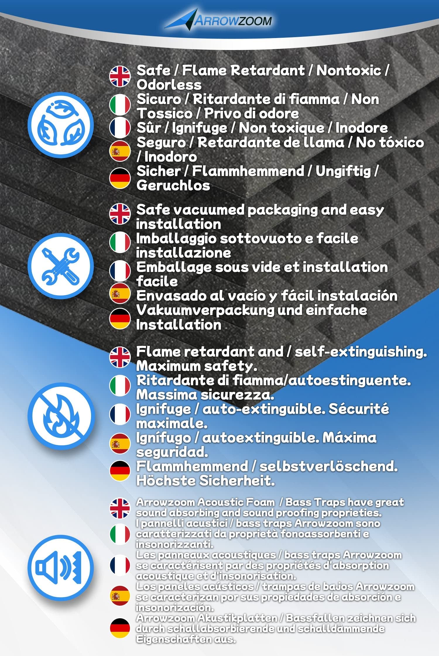"SECURE PACKAGING: To facilitate transport and storage, Arrowzoom sound-absorbing panels are vacuum-packed."]