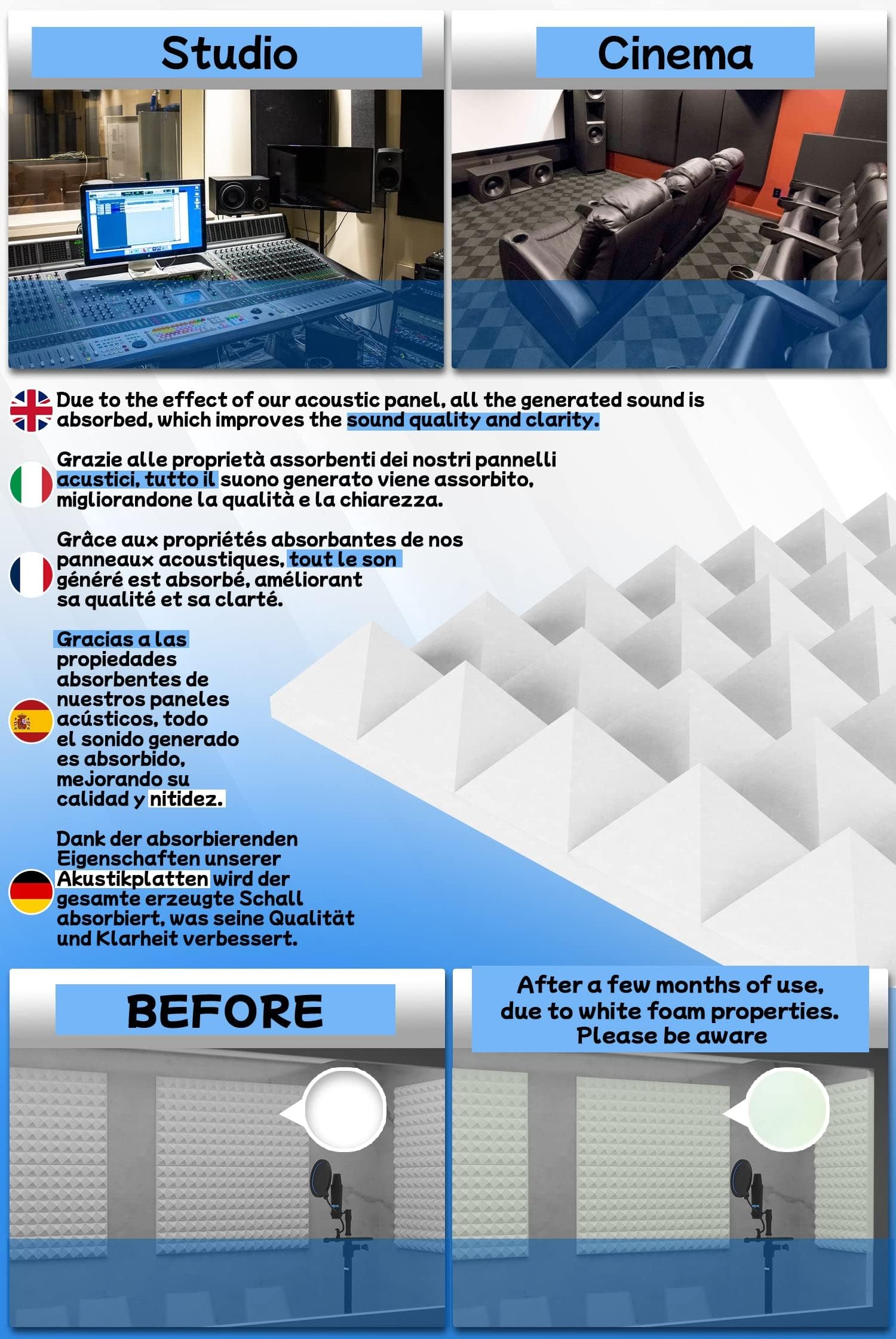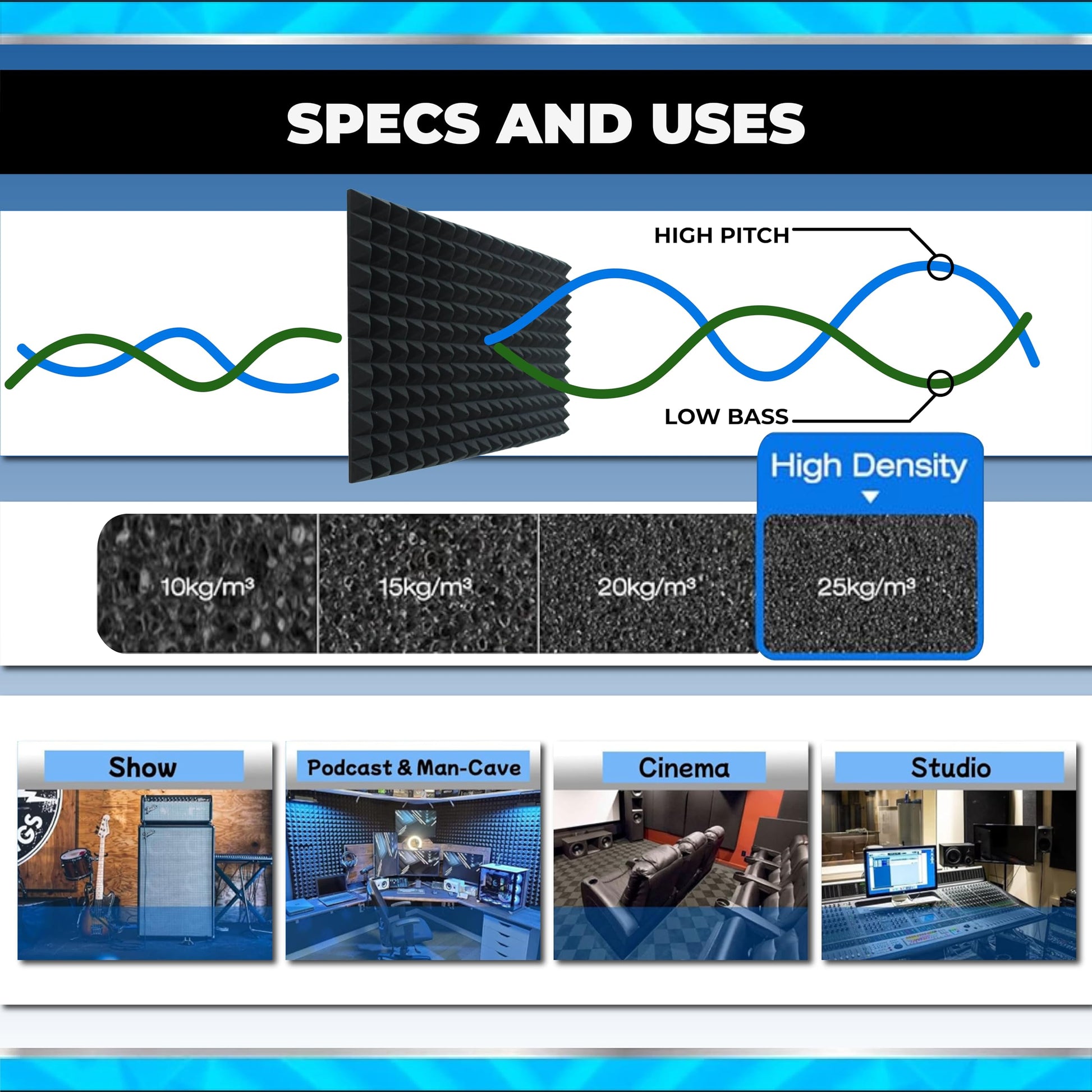 ✅ PROFESSIONAL: Density of 26 kg/m³, size 25x25x5cm, hypoallergenic, odorless, fireproof. Reduces reverberation in the room by approximately 3/4 dB. Pyramid structure for optimized airflow resistance.