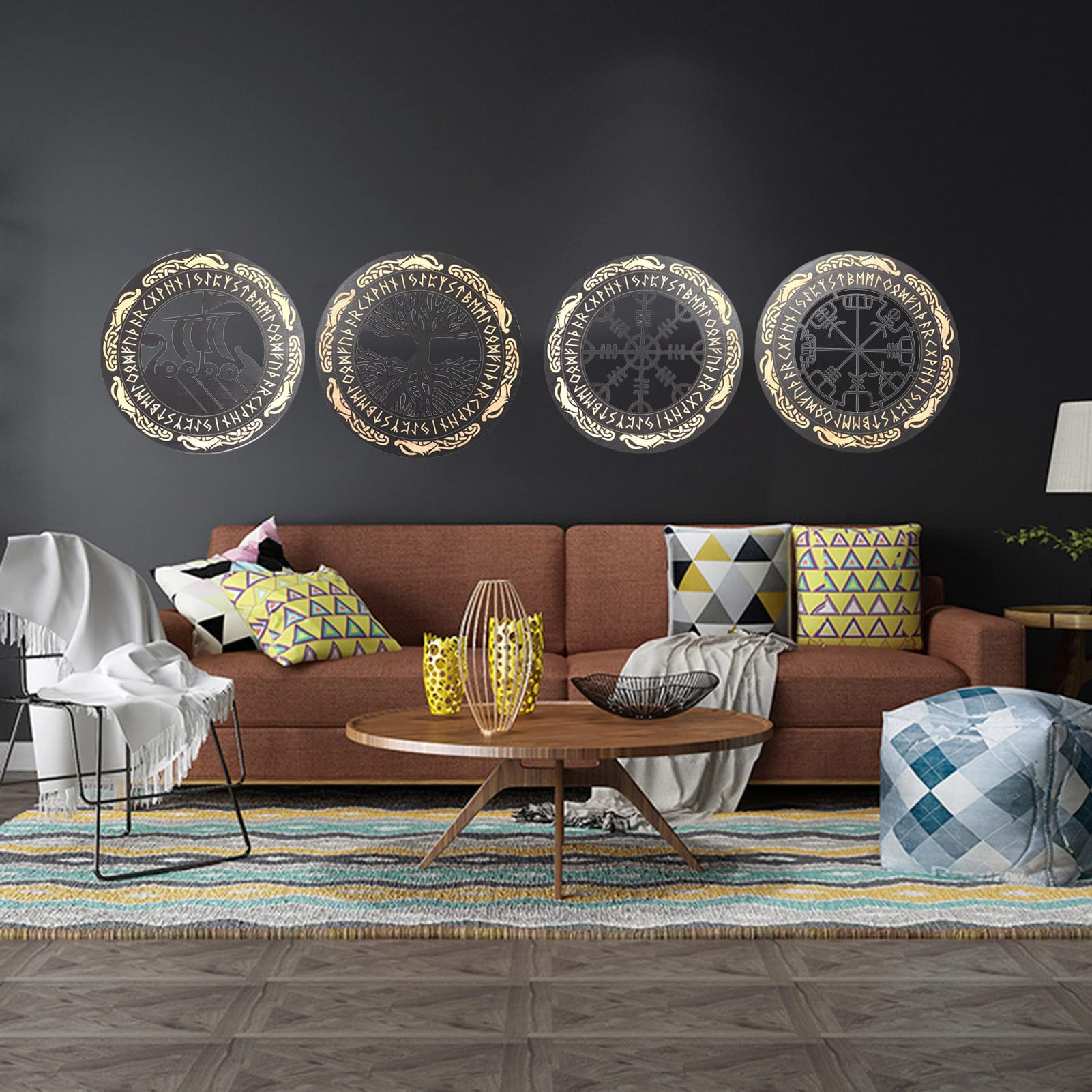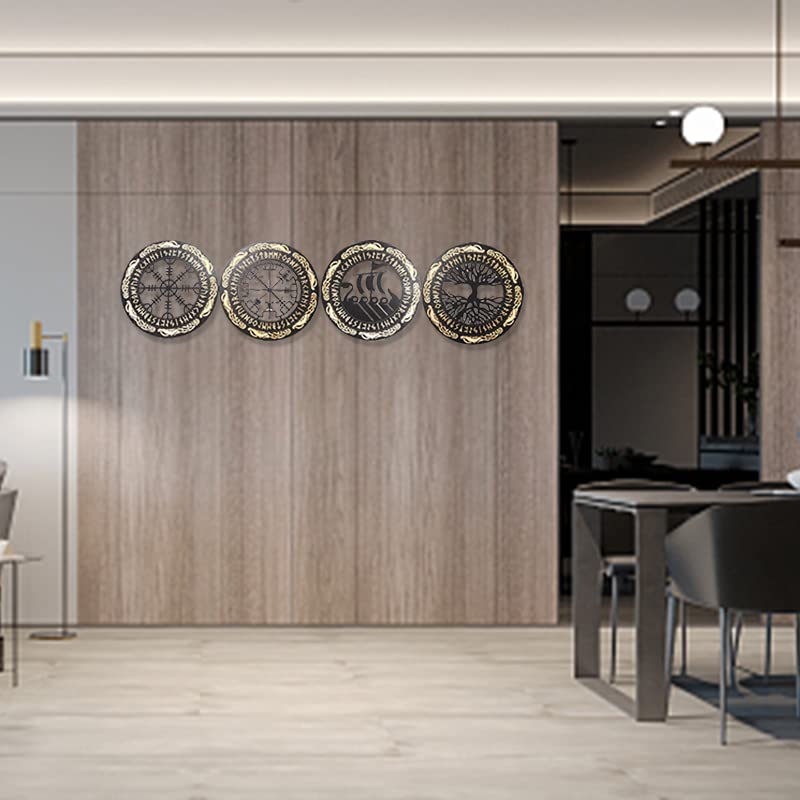 Arsey Vikings Nordic Mythology Runes Wooden Ornaments Medieval Decor Wall Sculptures Wall Ornament Compass Tree of Life Vegvisir Wall Decor Living Room Bedroom Wall Art, Wood, Yellow, 4 Pieces