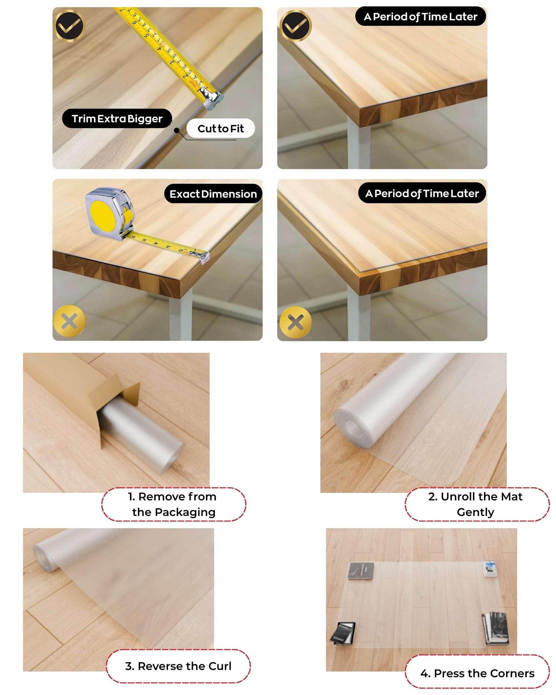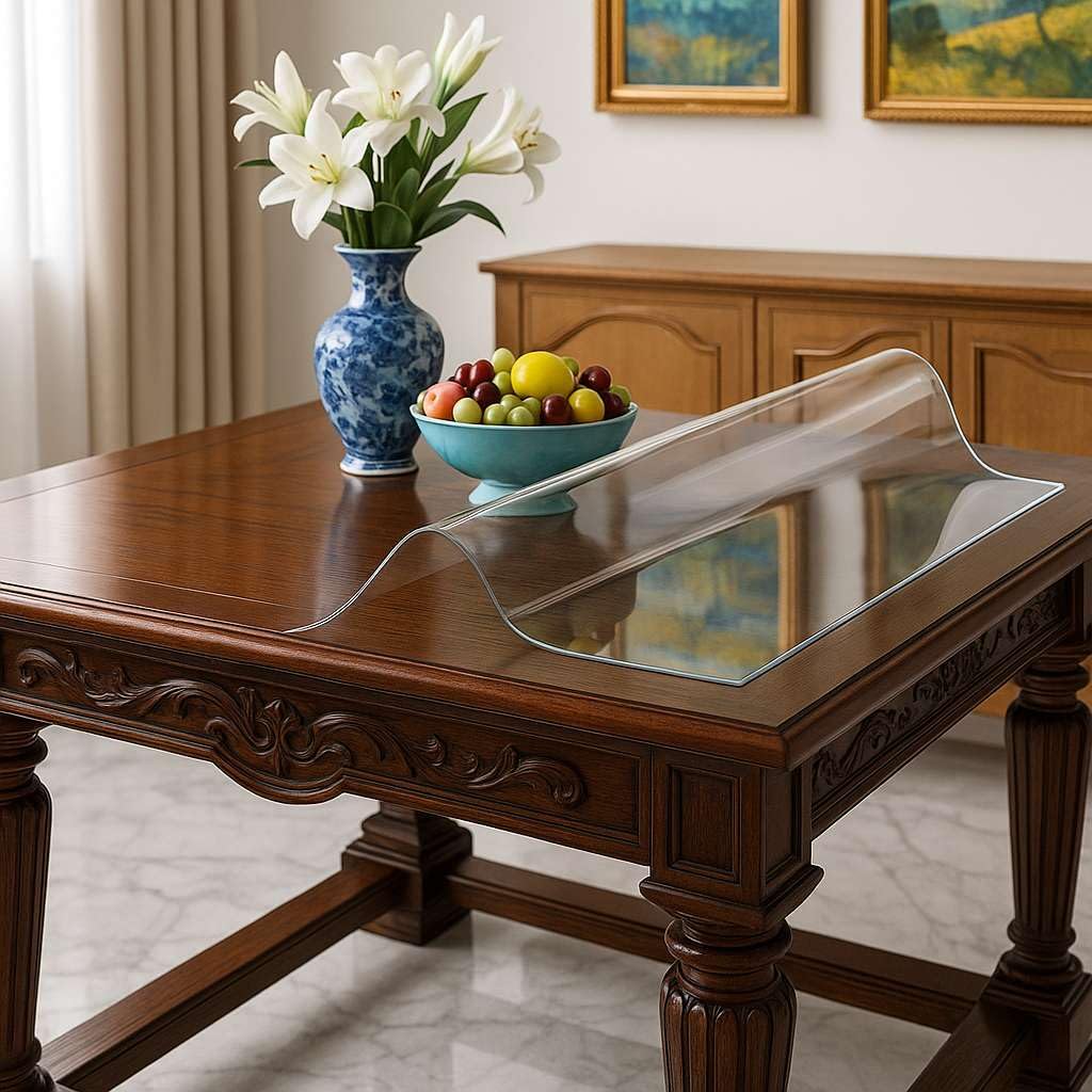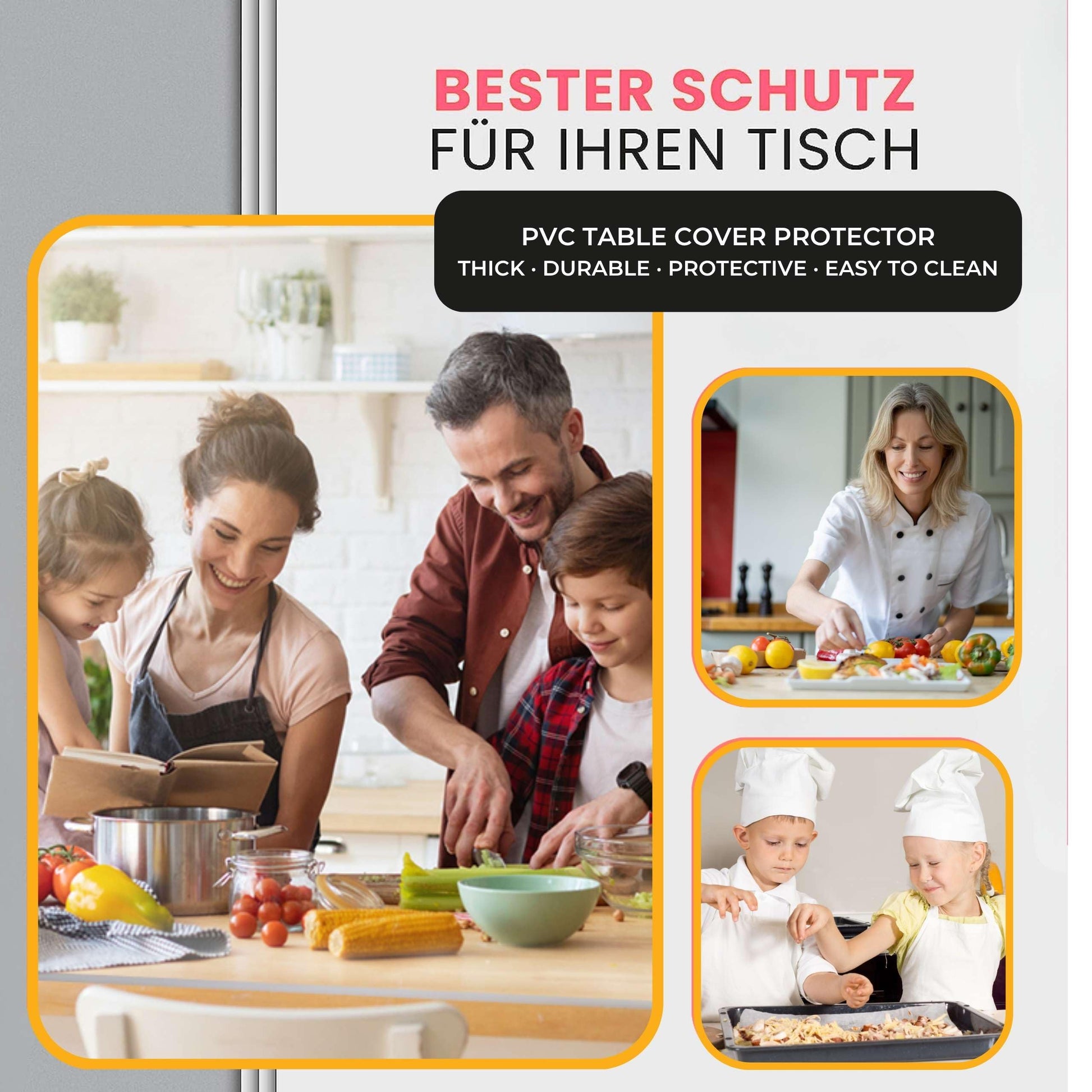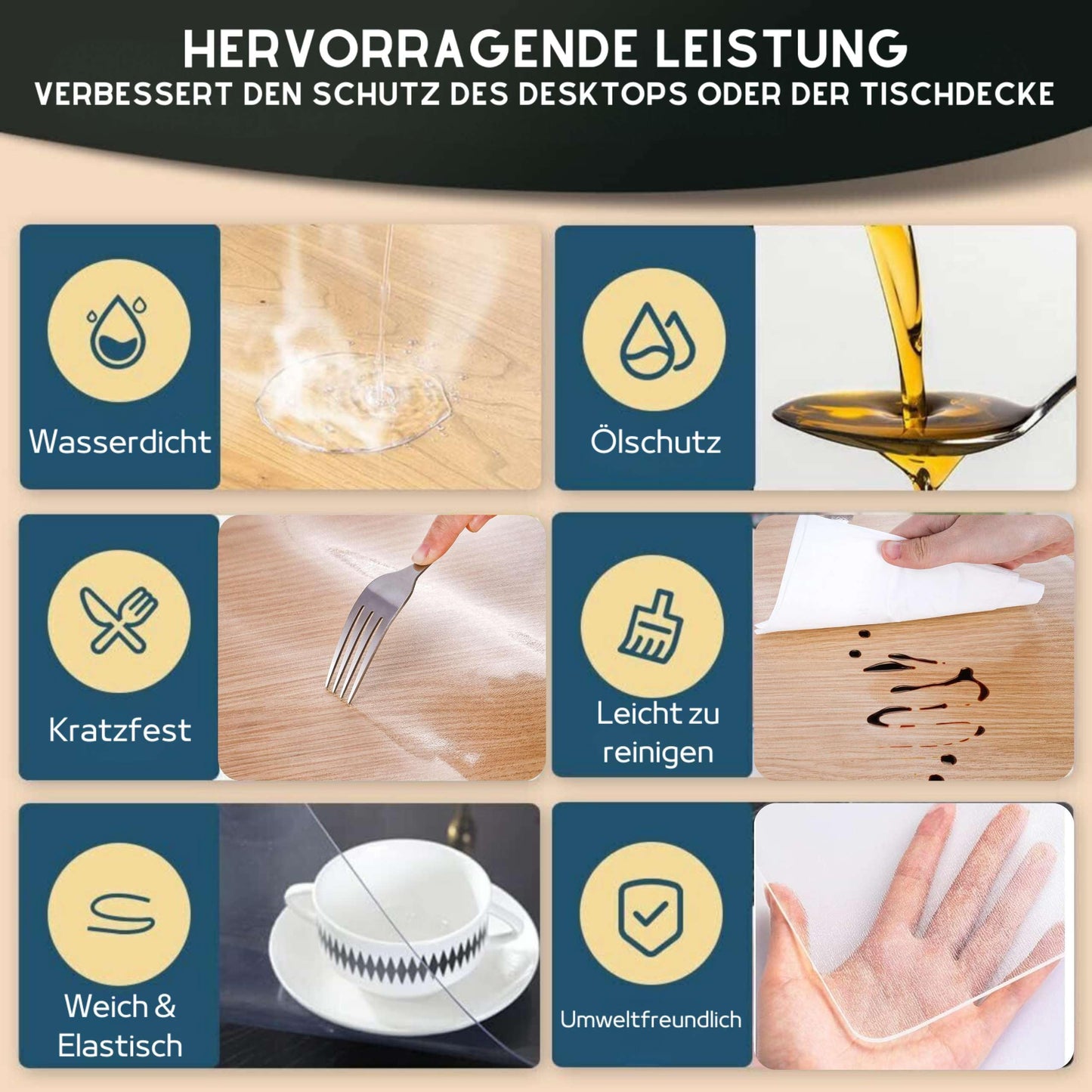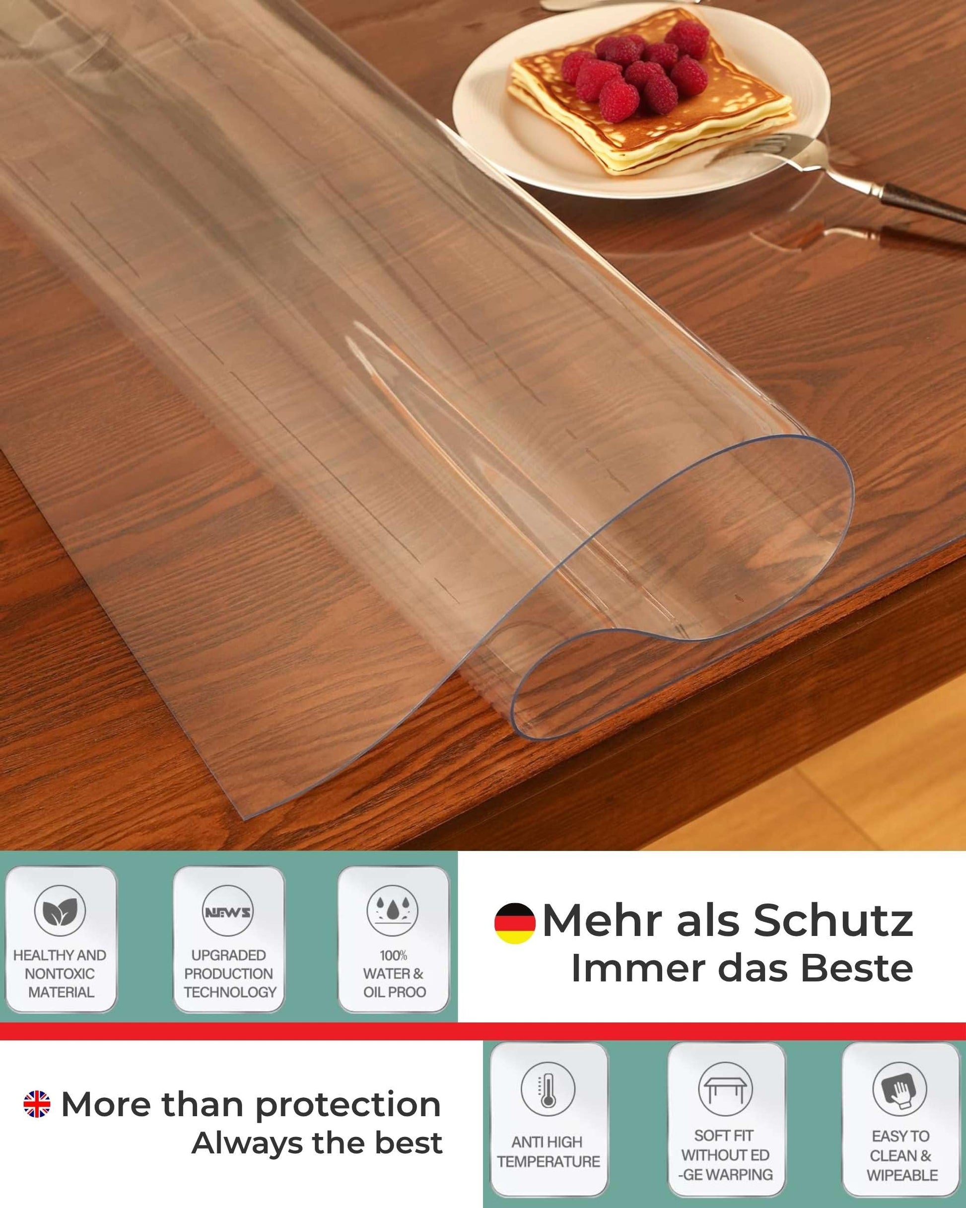 ["Transparent Table Protector Soft Polyvinylchloride Protects the table from scratches 0.08 inch Thickness. Ideal for protecting your tablecloth or valuable table. It also protects your dishes and is simultaneously soundproof. Ideal for table protection and contact with food.","Due to its high-quality appearance, it is very similar to a real glass panel. It is versatile. Non-slip, sound-absorbing, shiny, protective, gentle, transparent. It's like a washable transparent tablecloth.","The polyvinylchloride table film is wipeable. You can simply wipe the transparent polyvinylchloride film with a damp cloth and it will look like new again. Air bubbles can form between the tablecloth and polished surfaces. You can avoid this by placing a cloth between the surfaces.","Material is 100% Polyvinylchloride film. Both sides are the same. If there is a smell, please leave it in a ventilated place for 1-2 days for the smell to dissipate. Please place heavy objects on it completely or apply warm air to flatten it. Keep away from direct sunlight, colors, ink, and chemicals. Also avoid excessive heat.","Roll goods are cut from the roll for you gently. We usually cut slightly larger than the actual size to avoid shrinking. Slight size differences are not a quality problem. You can trim it to change the size. For a perfect cut, a sharp pair of scissors, a pencil, and a ruler are required."]