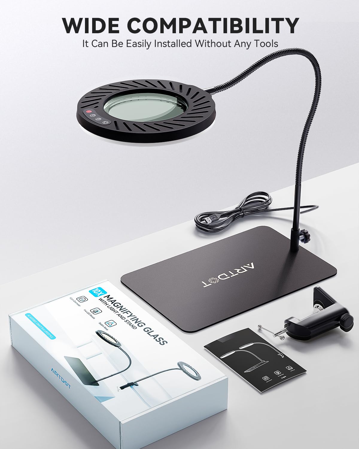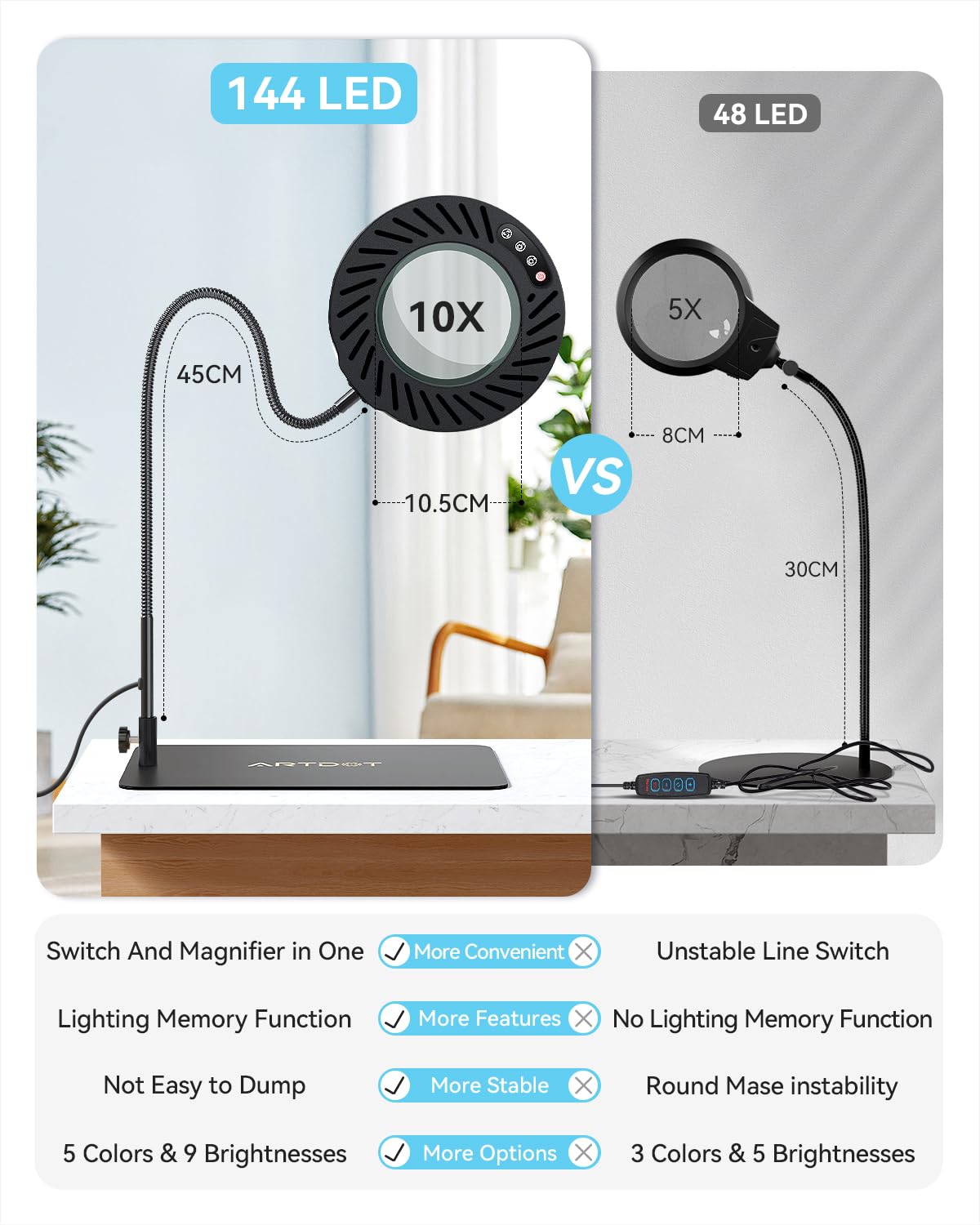 ["MAXIMIZED PRECISION - With 10x magnification and 144 LED lights, the magnifying glass enhances brightness and clarity for close-up work. They tackle visual challenges and fine details, ideal for highly precise tasks","ADJUSTABLE LIGHTING OPTIONS - Magnifying glasses with light offer 5 color temperatures and 9 brightness levels, suitable for different times and environments. Customizable settings reduce eye strain and increase comfort","UNLEASH UNLIMITED POTENTIAL - Magnifying glass with light is not only suitable for crafting and diamond painting, but also for reading and stitching. It supports various art projects and hobbies, increasing flexibility for finer work","ENLARGED NON-SLIP METAL BASE - Design provides more stability through a larger support surface and a stable triangular foundation thanks to the gooseneck. Non-slip foam on the base minimizes tipping risk from vibrations or impacts","LAMP HEAD SWITCH - Provides constant, flicker-free brightness. Easily adjustable at the touch of a button, saving time and increasing efficiency. Memory function preserves consistent lighting after restart and ensures continuity in diamond painting"]