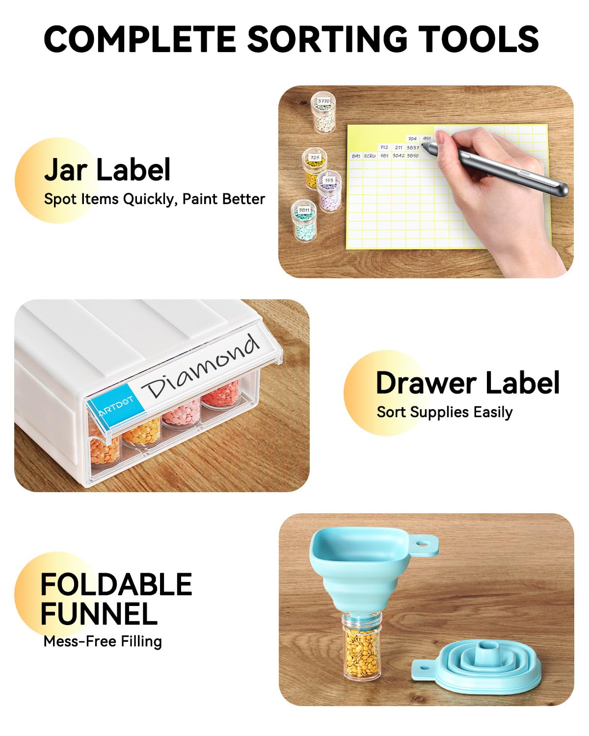 ARTDOT 4 Set Diamond Painting Storage Box, Stackable 128 Pieces 5D Diamond Painting Accessories with Funnel Stickers