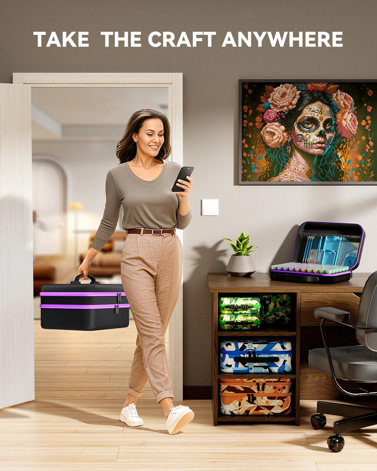 ["Organize 240 bottles with foam base to hold all your drills perfectly. Screw cap can protect drills from spilling when moving. Net bag for storing your diamond painting tools.","Game Changer: Fill diamonds more safely and easily with the foldable silicone funnel. Convenient to use, carry, and store. Say goodbye to messy transfers!","Functional and practical tool: Comes with extra diamond painting pen with 3, 6, 9 drills, ideal for large areas with same-colored diamonds. 196*2(392) label pieces help organize and find your diamond painting with color code easier. Tray and wax included.","Portable, lightweight design: Provides ample space for all your gem art and diamond painting sets while remaining extremely portable for creating diamond painting anywhere.","Large capacity and multipurpose: Each diamond painting storage container holds approximately 10 grams of items. You can turn each jar into a bead organizer or store other small items like jewelry, seeds."]