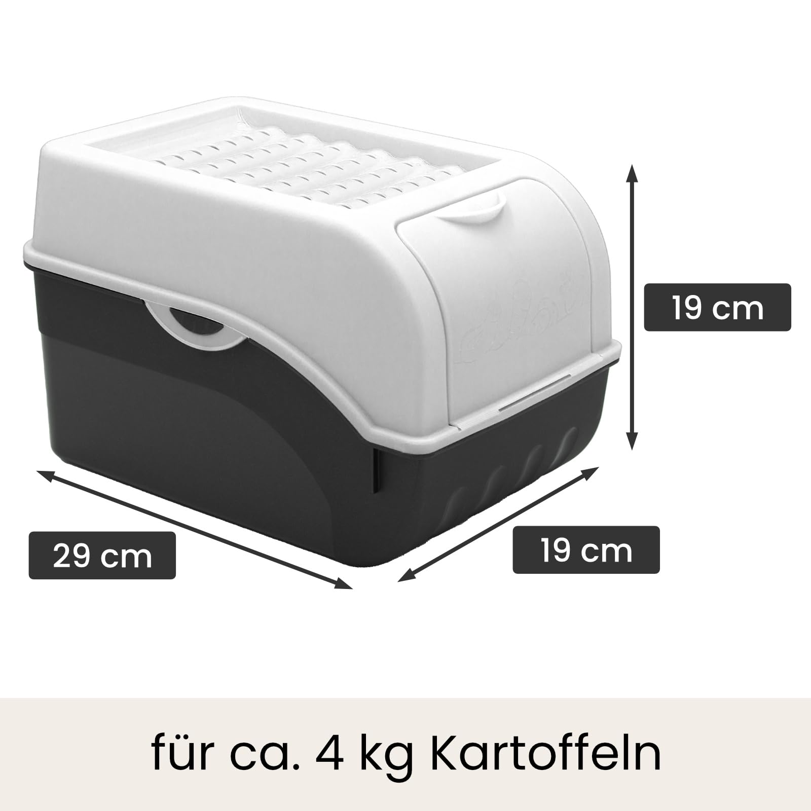 The volume allows storing up to approx. 4 kg of potatoes in a potato container. The size of a vegetable storage box is approx. 29 x 19 x 19 cm (L x H x W).