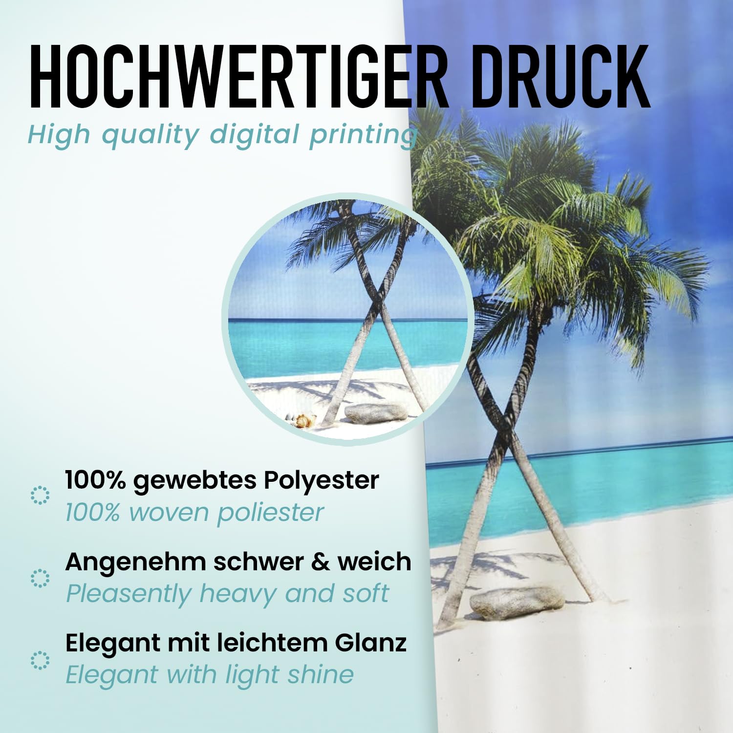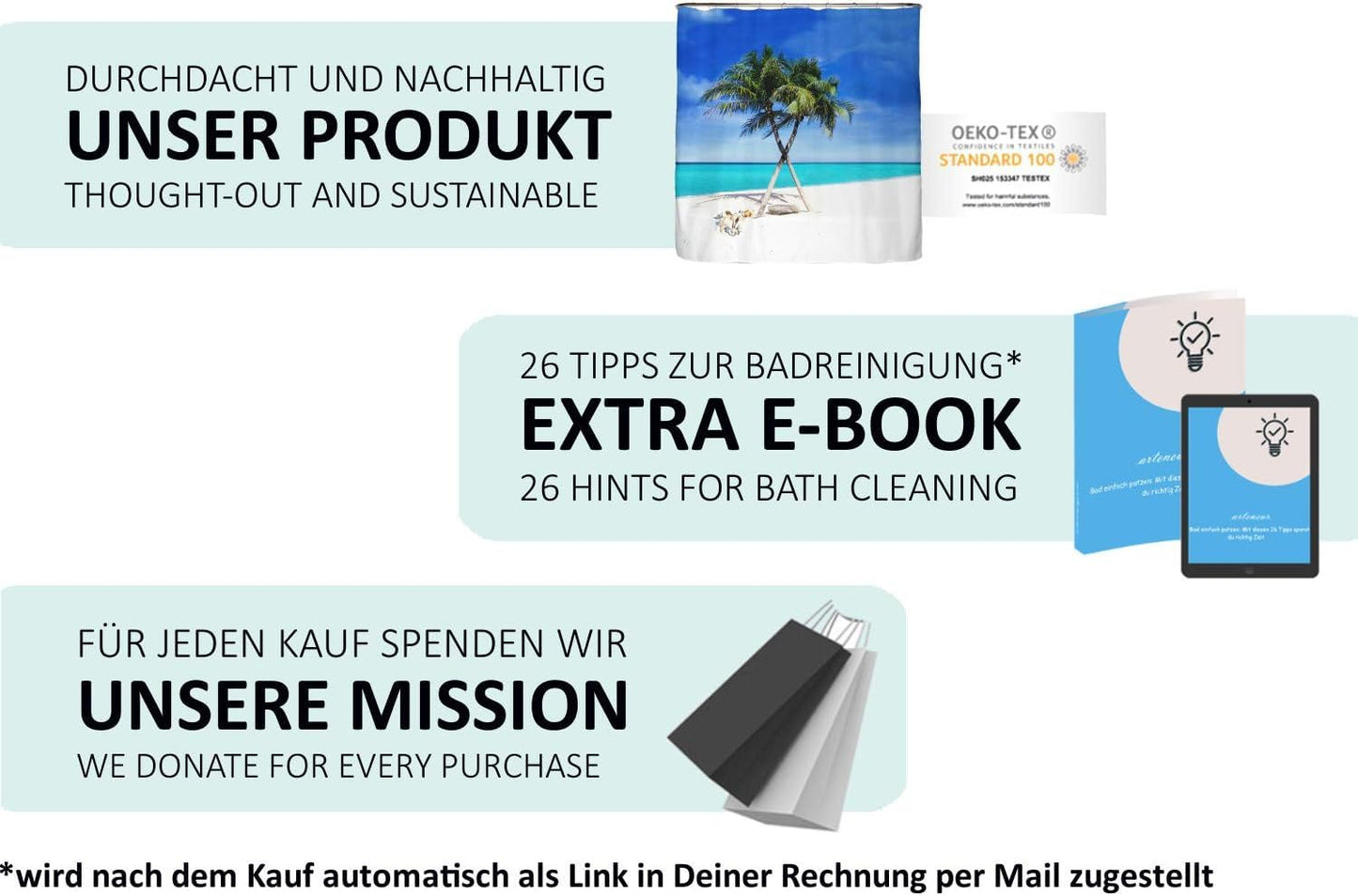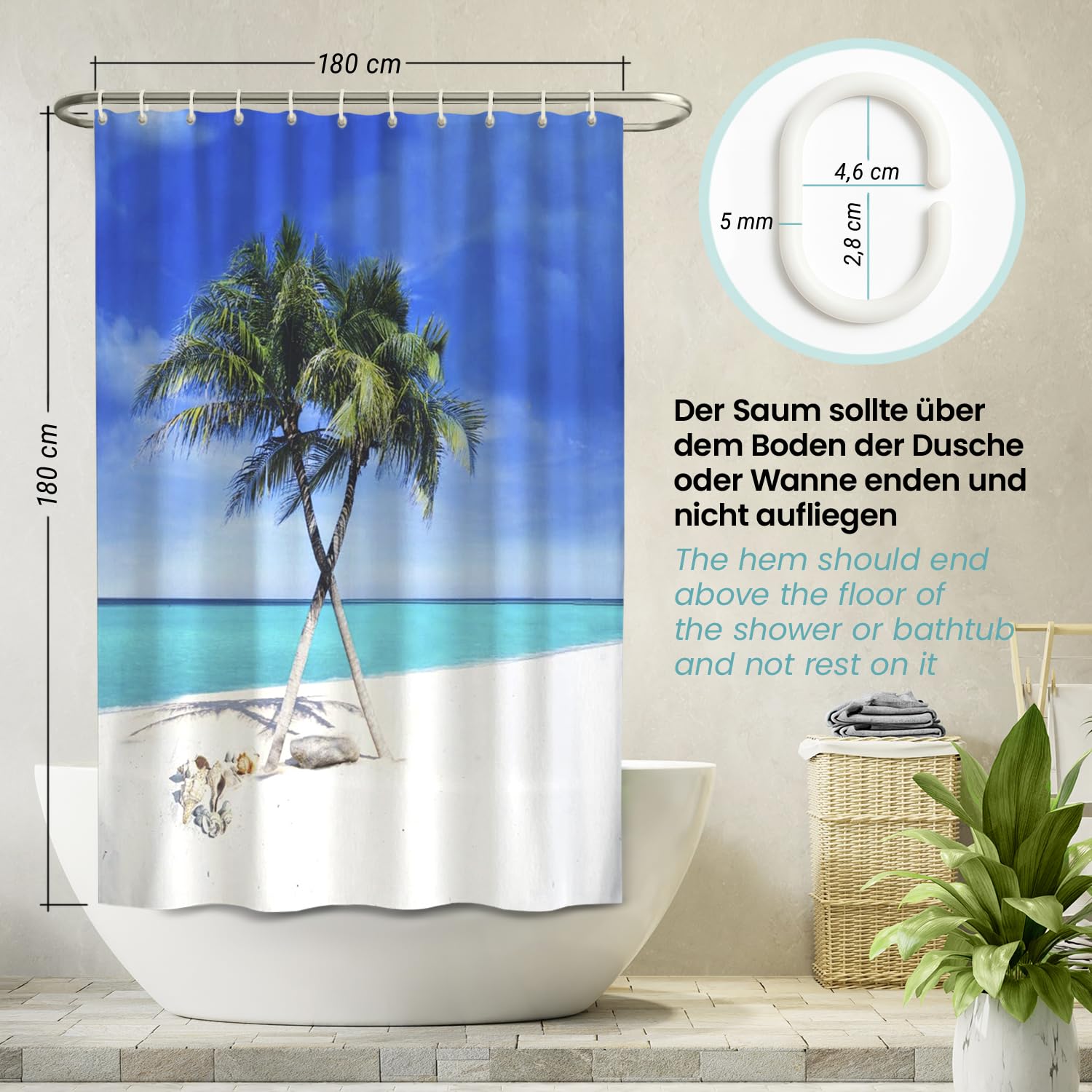 arteneur® - Beach - Anti-mold shower curtain 180x180 - Recycled with Oeko-Tex Standard 100 - Weighted hem, opaque, waterproof, washable, 12 rings & E-book