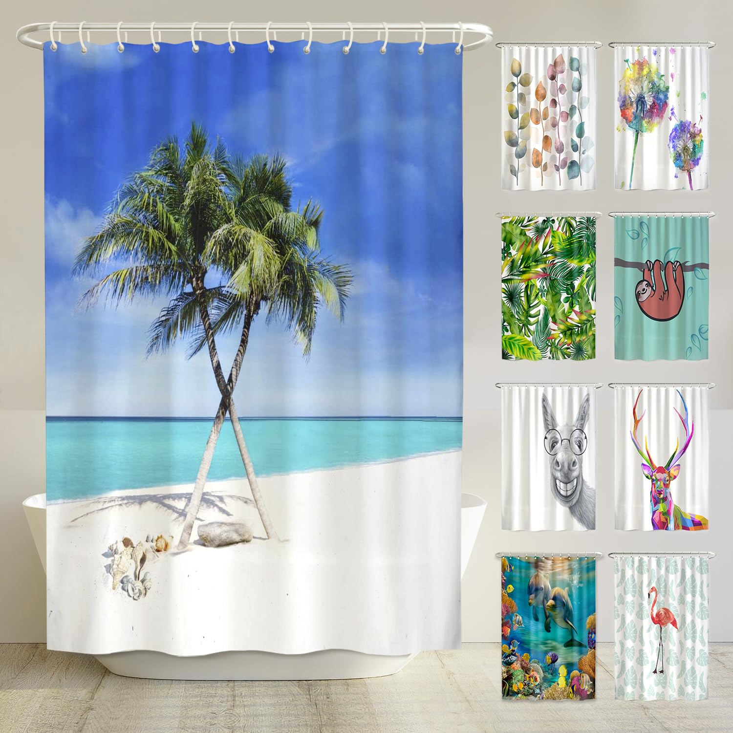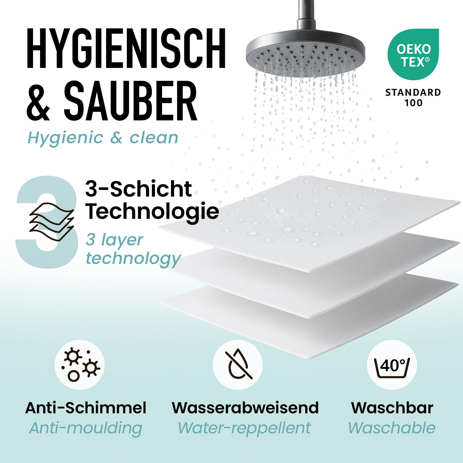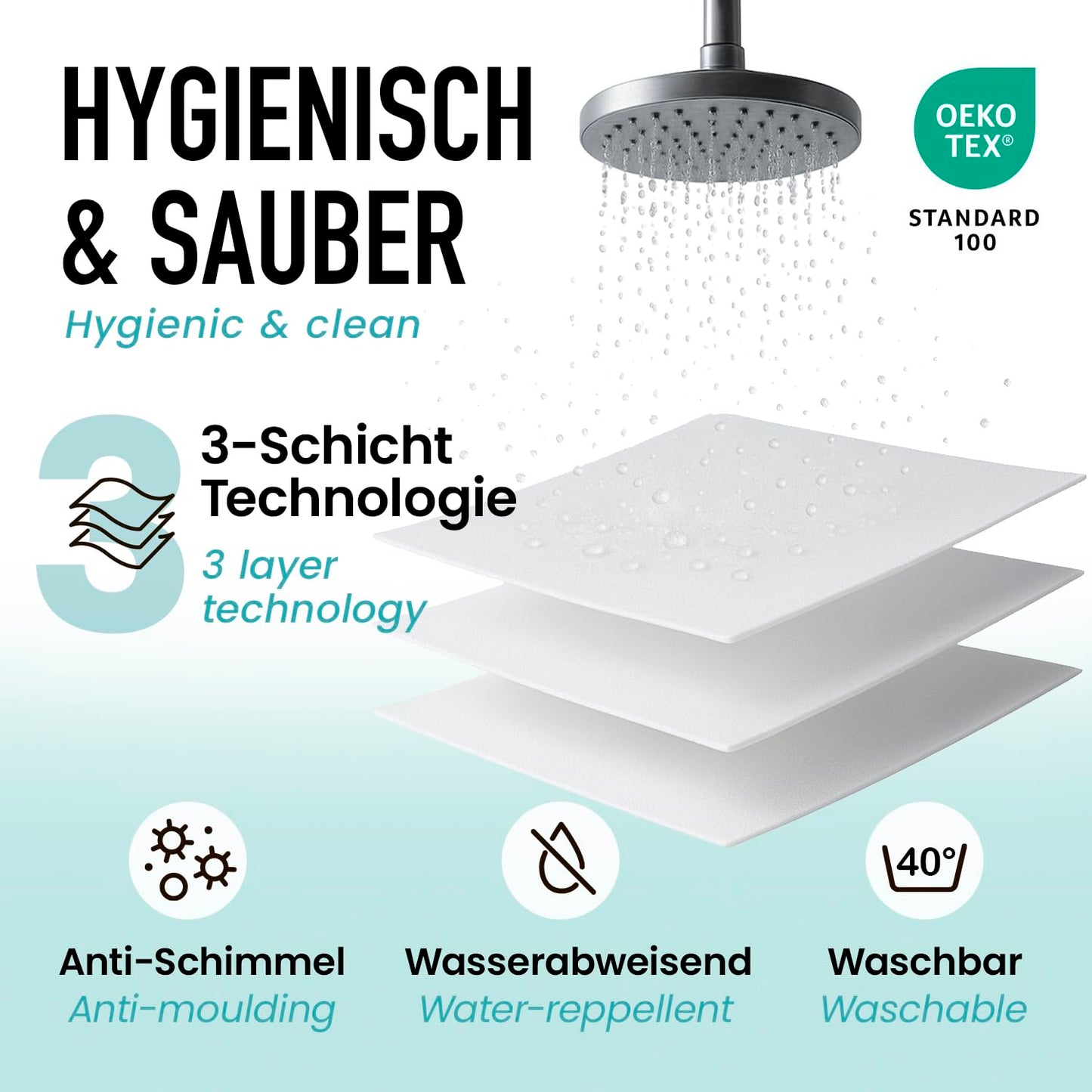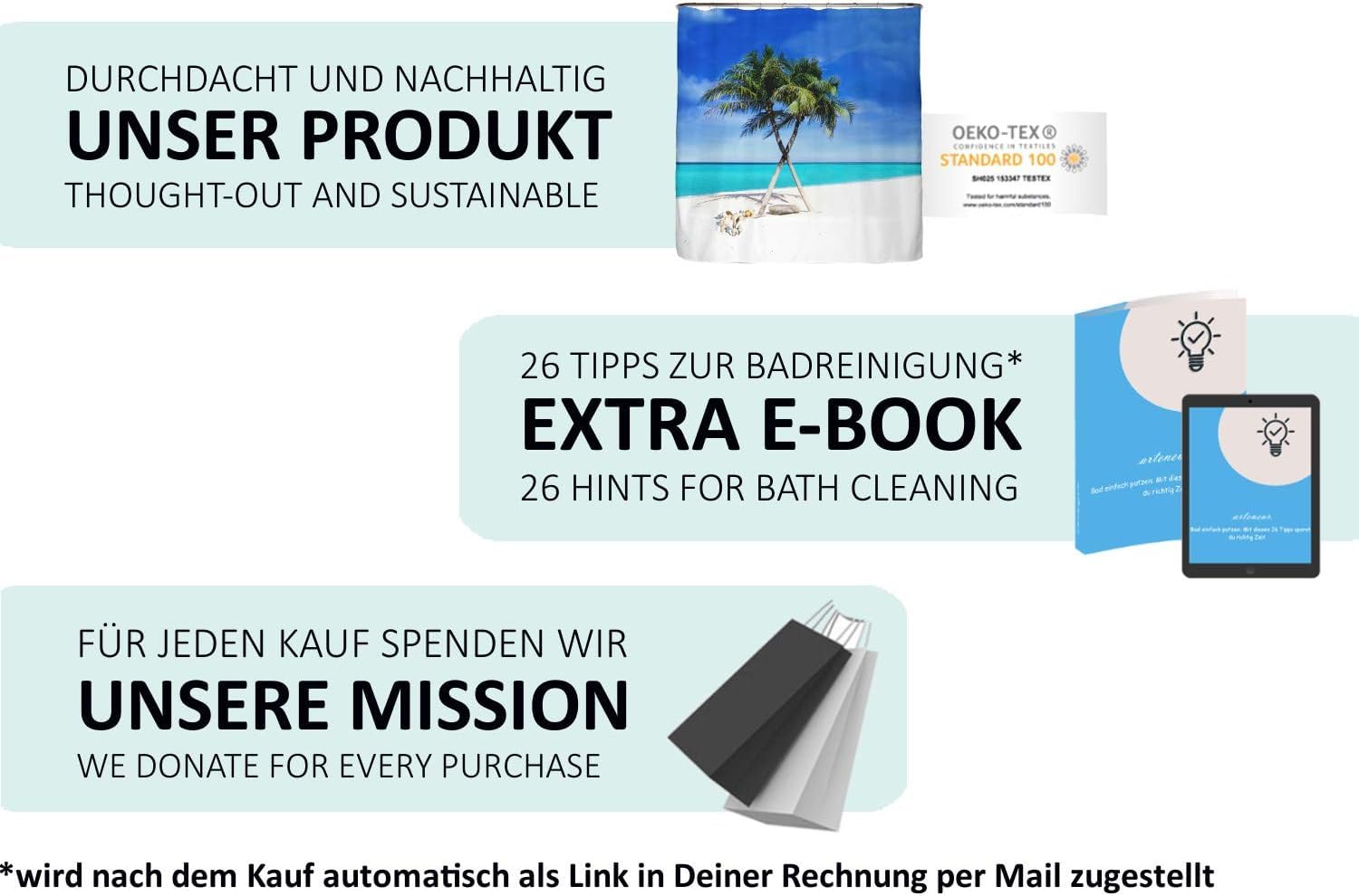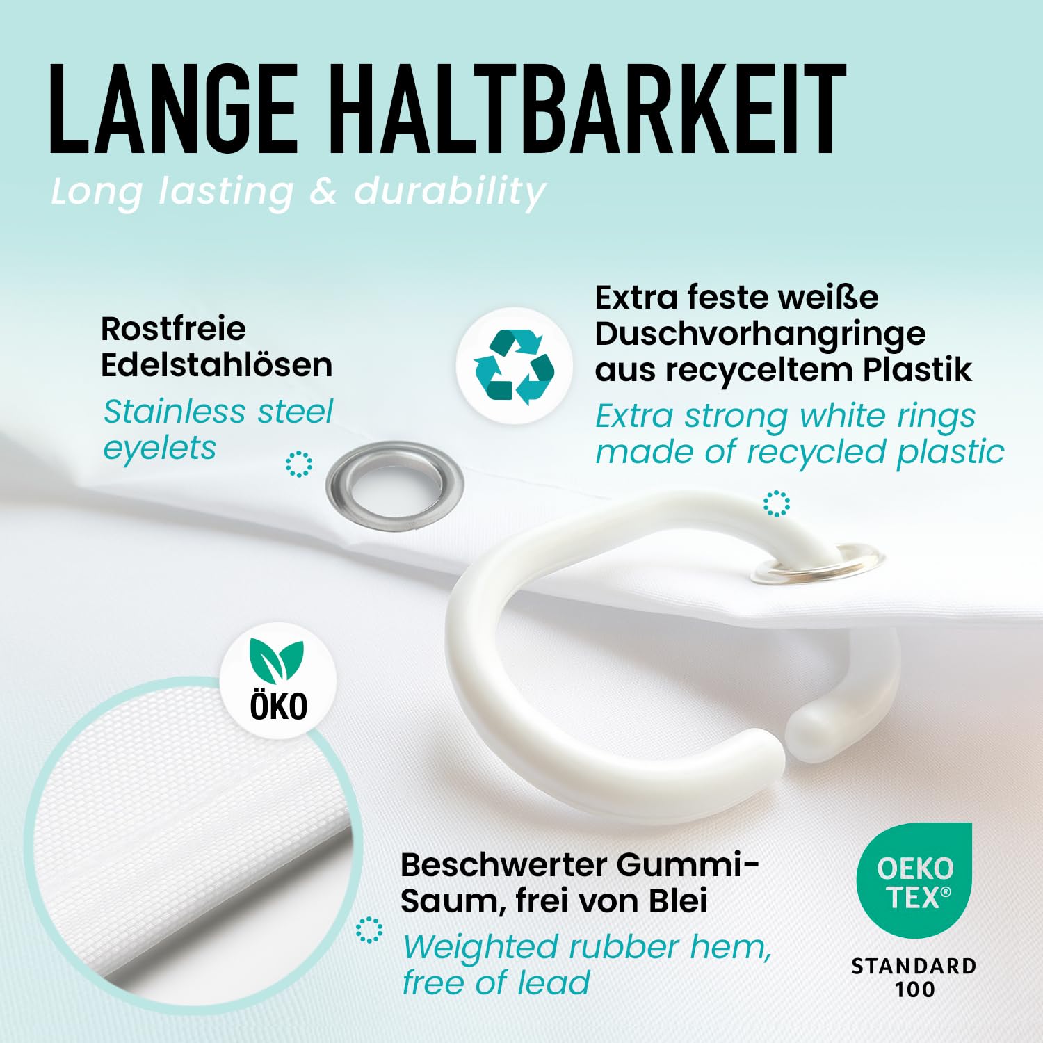 ["✔ EYE-CATCHER IN THE BATHROOM: The colorful flowers with bright watercolors come into your bathroom with high-quality digital printing. A fun shower curtain with a smart design motif including shower curtain hooks for more joy in your bathroom. Modern Shower Curtain!","✔ HYGIENIC AND EASY TO CLEAN: The anti-bacterial and anti-mold coating keeps the shower curtain clean for a long time. The shower curtain is washable at 40°C and can be ironed at low heat. More cleaning tips can be found in the E-Book in the invoice.","✔ RECYCLED QUALITY: The high-quality and durable material made of 100% recycled polyester textile and the rust-free stainless steel eyelets give the curtain a long lifespan and durability.","✔ GOODBYE TO STICKY EFFECT: Thanks to the environmentally friendly, weighted rubber hem (without lead tape), the shower curtain stays in shape and doesn't cling during showers.","✔ PERFECT FOR BATHTUBS WITH LOW CEILING HEIGHT: With dimensions of 180 x 180 cm (width x length/height), you can hang the curtain on any shower and bathtub around the corner. 12 shower curtain rings are included."]