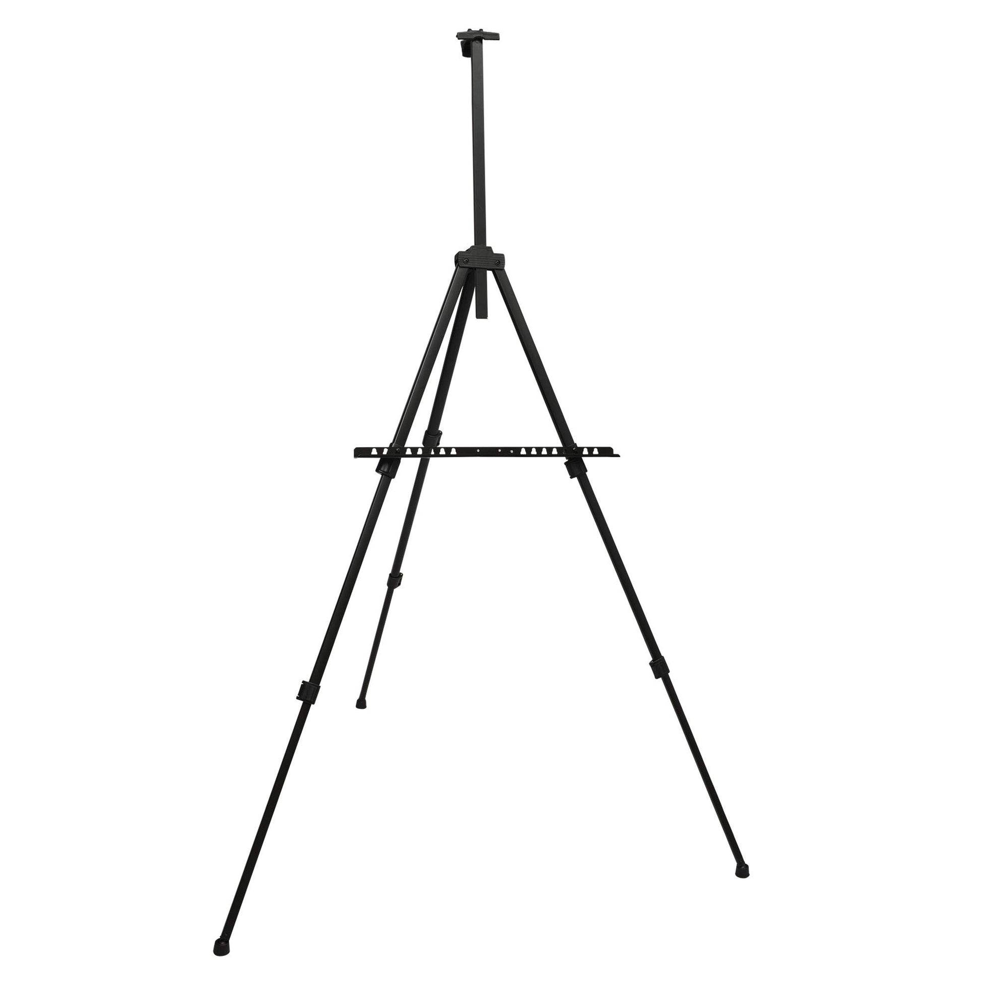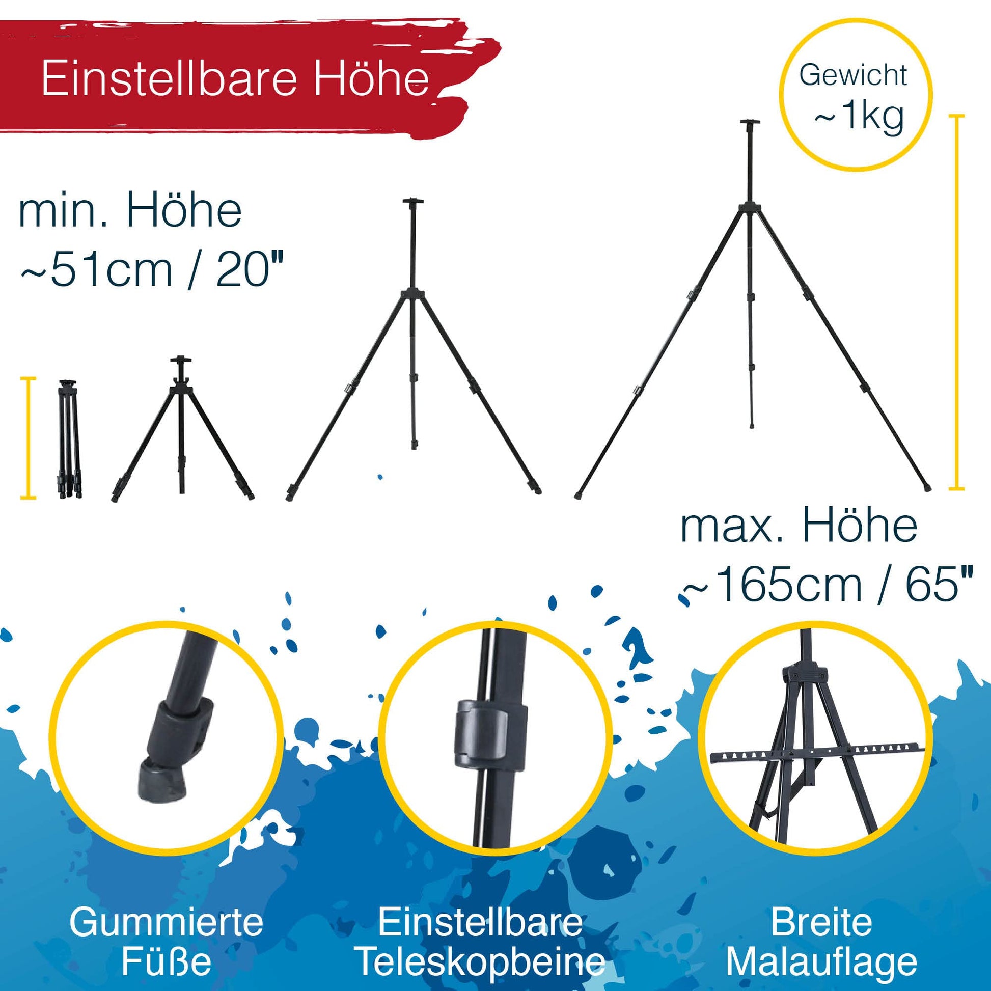 "WITH ALUMINUM EASEL – An aluminum easel is included in this set for painting. The easel can be used as a field easel or table easel thanks to its telescopic legs. Rubberized feet ensure a secure grip.",