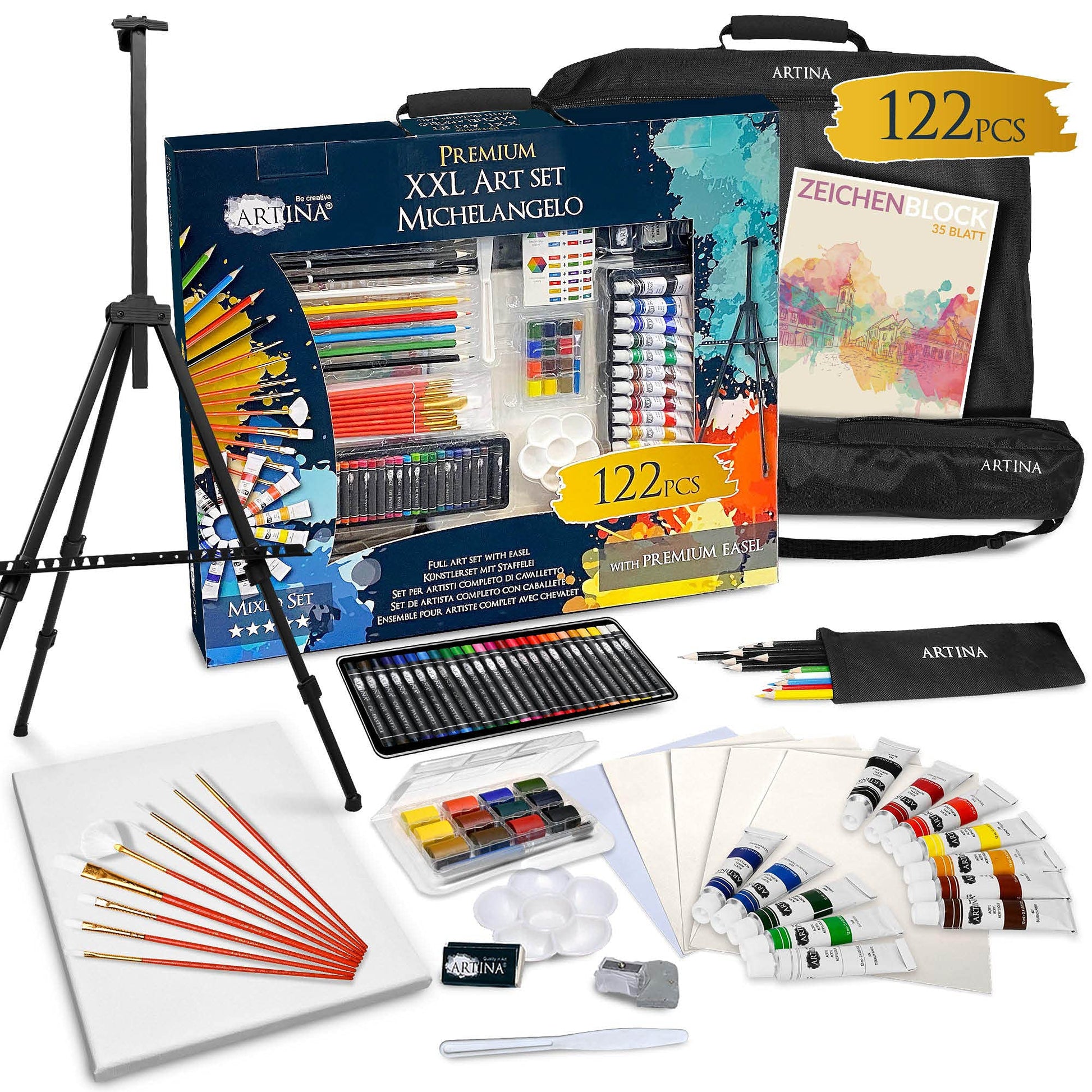 Artina 122tlg XXL Painting Set with Michelangelo Easel - Artist Set Acrylic & Drawing Set - Colored Pencils, Canvas, Brush Set, Watercolors, Pastel Chalk - Great Creative Set for all ages
