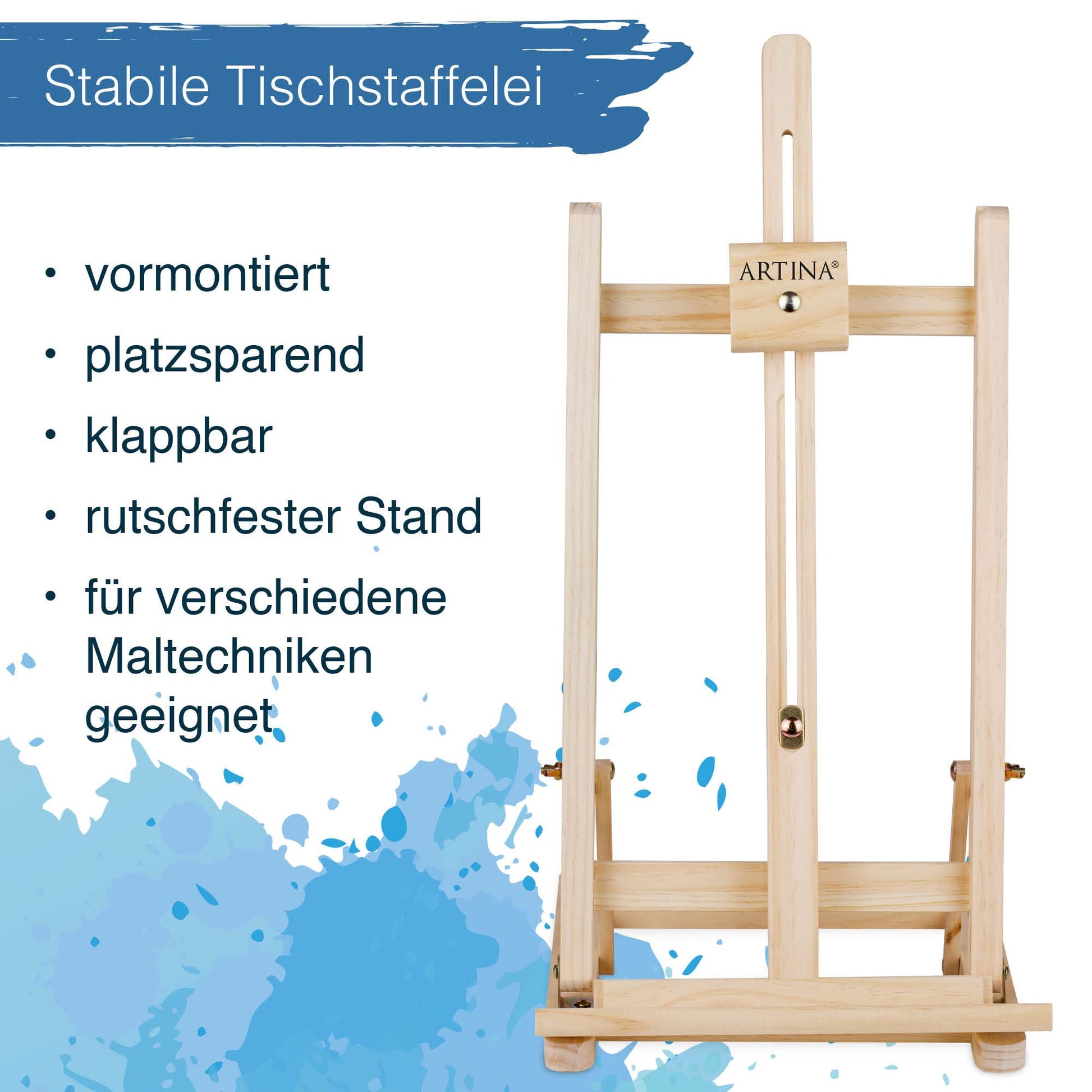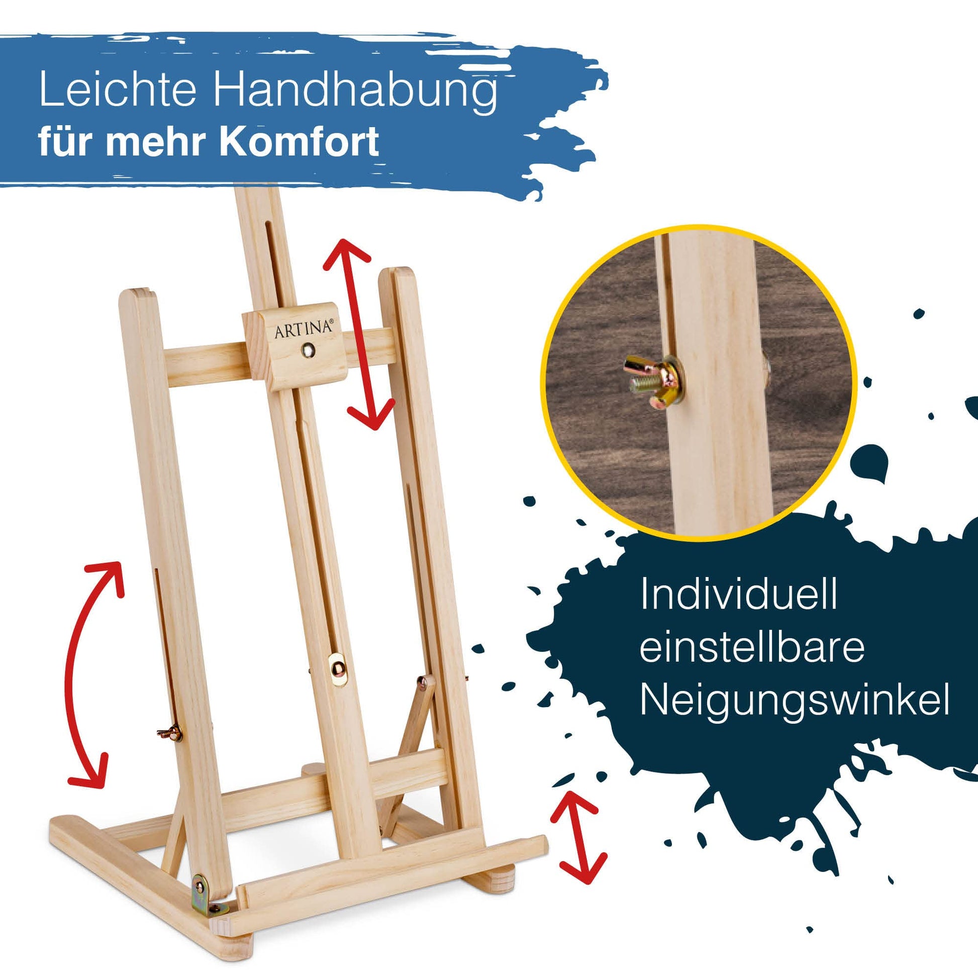 ["๐ฎ๐ฑ๐ง๐๐ ๐ฃ๐ฅ๐๐ ๐๐จ๐ ๐ฆ๐๐ง - The perfect painting and drawing set for adults and kids. The Artina Art Set includes an Acrylic Paint Set in eight different colors, 4 brushes, 5 canvases for painting, and many other painting tools for experimenting.","๐ฆ๐ง๐๐๐๐๐ ๐ฆ๐ง๐๐๐๐๐๐๐ - Sturdy pine wood and 4 rubber feet ensure a stable base for the wooden easel. The painting easel is adjustable in height and can be used for canvases up to 45 cm. The small kids easel for painting is foldable and can be easily stored away after use.","๐๐๐๐ก๐ช๐๐ก๐ ๐ญ๐จ๐ ๐๐๐ ๐๐๐๐ก - The canvas on stretcher frame is extremely durable. The painting canvas of the art set has been triple-primed in white and absorbs colors very well due to the light structuring of the surface. The stretcher frames have been produced as environmentally and resource-friendly as possible and carry an FSC certification (FSC N002767).","๐๐ข๐๐๐ช๐๐ฅ๐ง๐๐๐ ๐๐๐ฅ๐ฌ๐๐๐ ๐๐๐ฅ๐๐๐ฆ - The drawing set and acrylic paint set offer endless artistic possibilities. Thanks to the 8 different colors of the acrylic paint set, you or your children can unleash your creativity and let your imagination run wild.","๐ฉ๐๐ฅ๐ฆ๐๐ง๐๐๐ ๐ฃ๐๐๐ก๐ง๐๐ก๐ ๐๐ฆ๐ฆ๐๐ก๐ง๐๐๐๐ฆ โ With four paintbrushes, getting started with painting is easy. Large-scale and detailed paintings are no problem with the two round brushes and two flat brushes in different sizes. Adult painting set."]