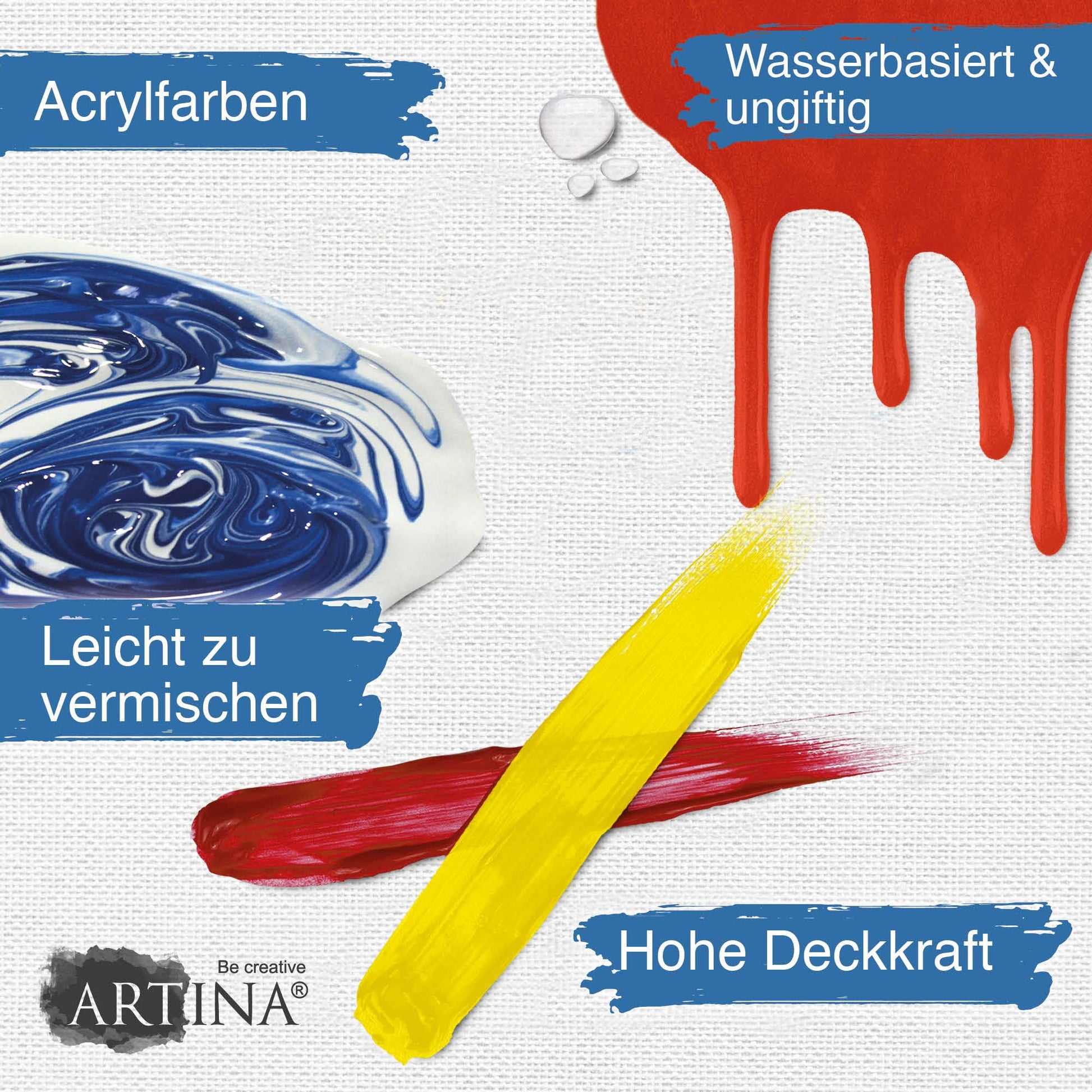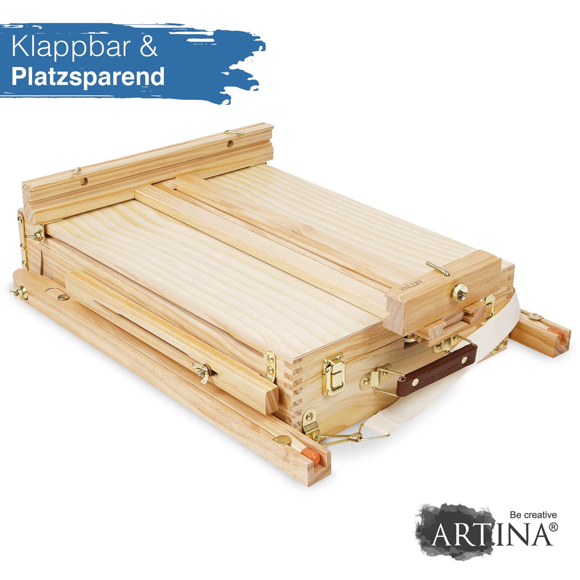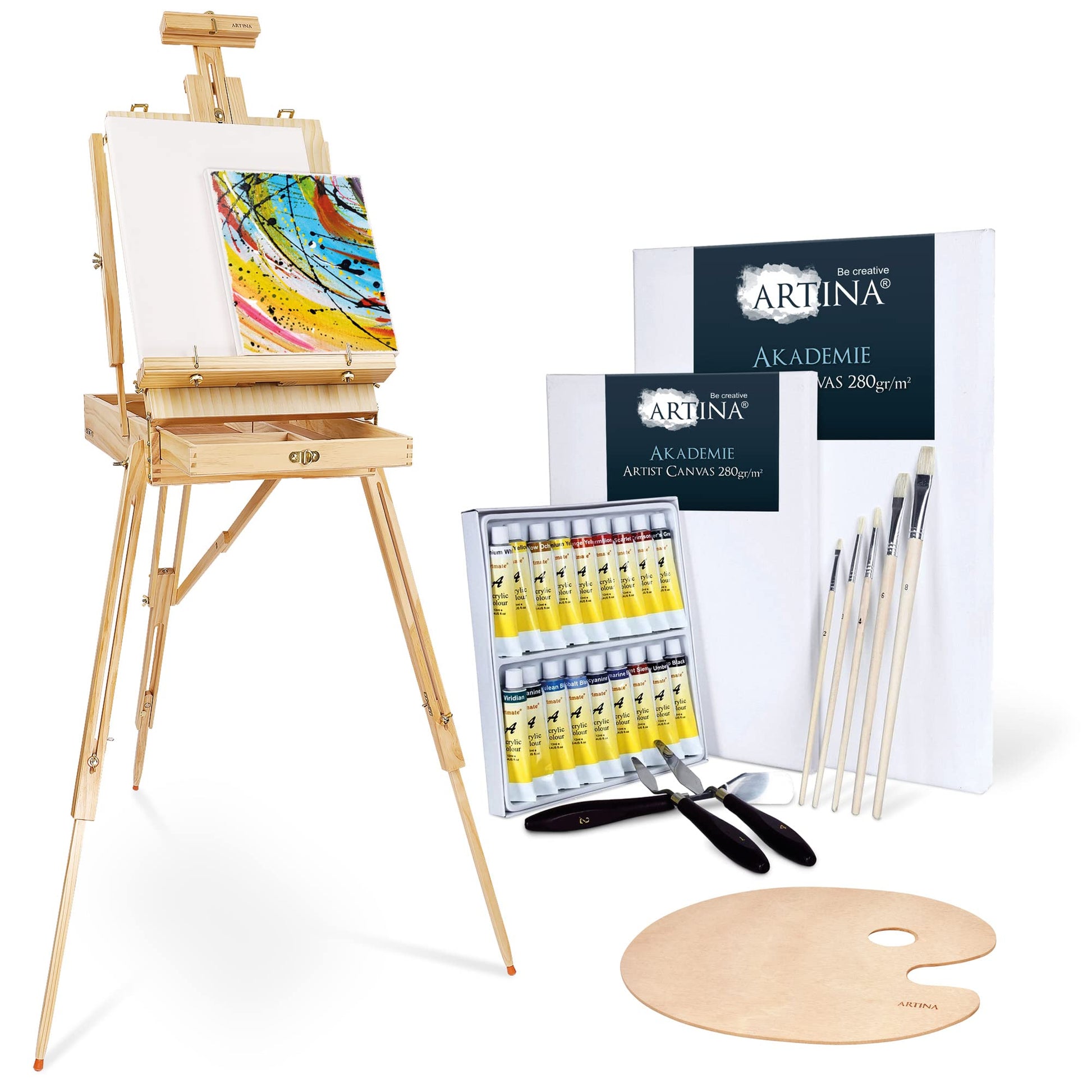 Artina 30-piece easel set Madrid - portable easel with XXL acrylic canvas painting set - field easel with 90ยฐ tilt - wooden easel set with 18 acrylic paints, 2 stretcher frames, brushes, and painting spatulas.