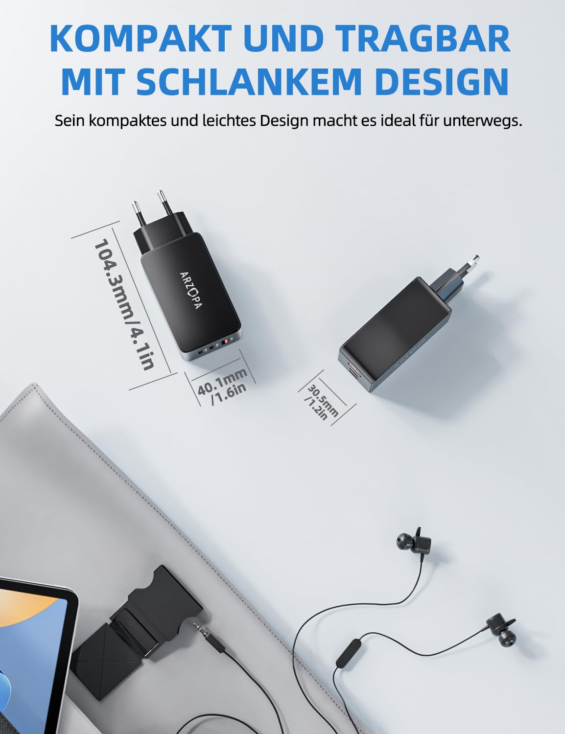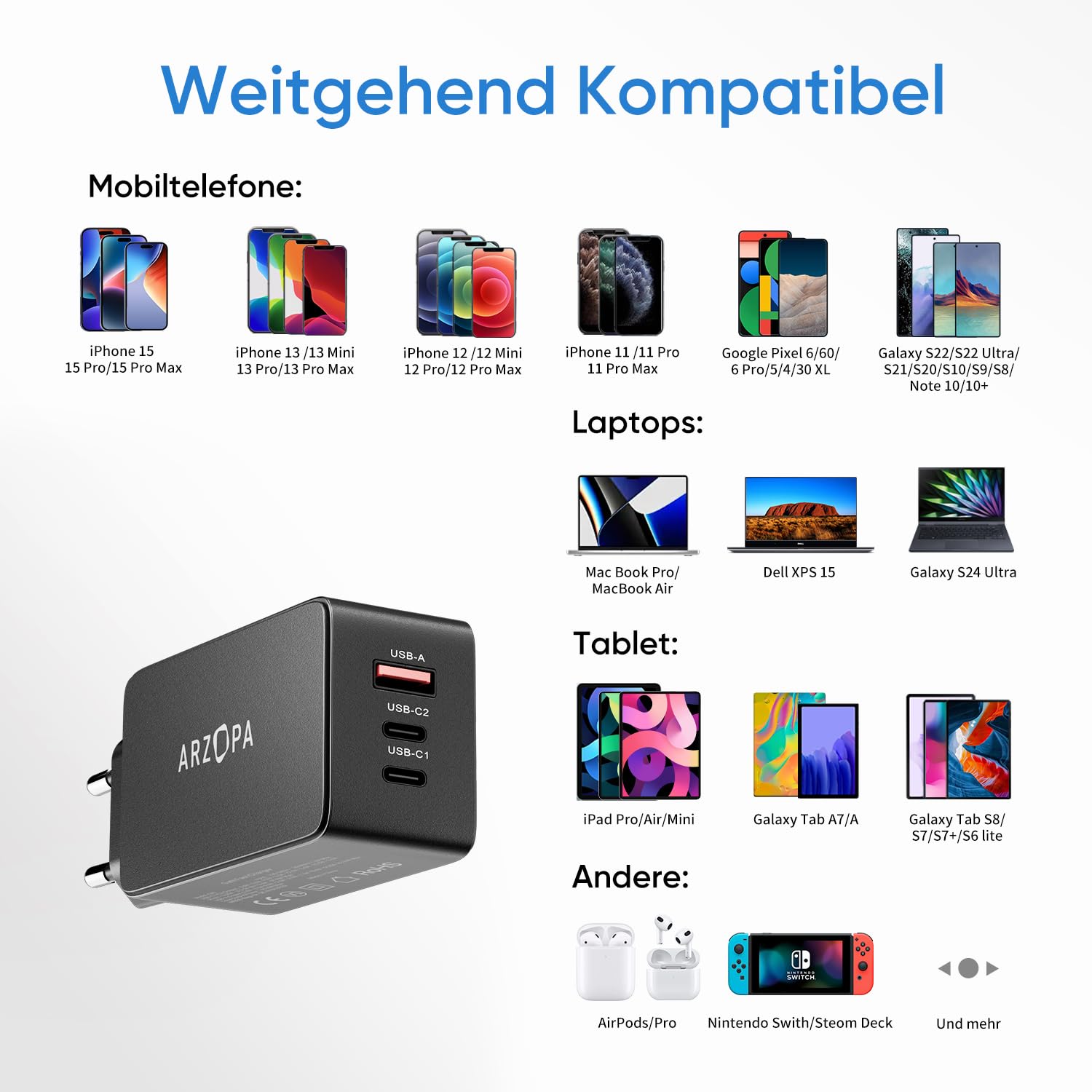 ["SUPER FAST CHARGING: ARZOPA USB C charger with PD 3.0 and PPS technology delivers impressive 65W to ports C1 and C2, while port A1 still provides fast 22.5W. It only takes 1.5 hours to fully charge a MacBook Pro! This fast and efficient charging solution is ready to power up your devices","3-IN-1 MULTI-PORT EFFICIENT CHARGING: ARZOPA 65w usb c power adapter can charge three devices simultaneously with just one adapter. Intelligent power distribution ensures optimal performance for each device and significantly improves charging efficiency. Allows for easy and convenient charging at home, on the go, or in the office","NEW GAN TECHNOLOGY: USB C Quick Charger plug features advanced Gallium Nitride (GaN) technology, built-in intelligent chip, automatically regulates output voltage, provides 8 layers of safety protection against electrical overload, overvoltage, and overheating, to bid farewell to overheating issues, ensuring your devices are charged safely and quickly","PORTABLE & CONVENIENT: The usb c adapter is compact and portable, easy to store, especially suitable for travel. The ARZOPA 65W Quick Charger delivers higher power in a smaller form factor, so no matter where you are, you can experience the convenience of a compact and portable charging solution without the hassle! No more frustration of missing an adapter while traveling","VERSATILE CHARGING SOLUTION: ARZOPA usb c charger can fast charge almost any mobile device, including tablets, laptops, portable monitors, smartphones, and more. With its wide compatibility range, this charger is the ideal all-in-one solution for all your charging needs. Stay easily connected to the world with this versatile charger"]