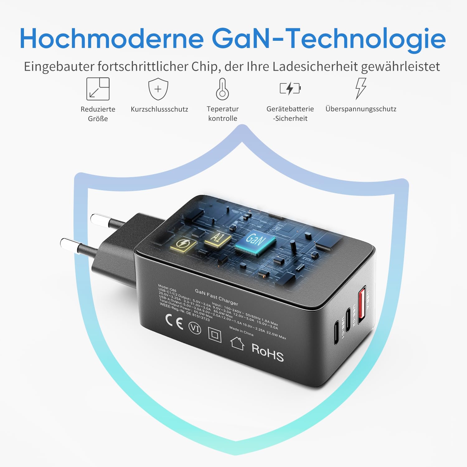 ARZOPA USB C Charger 65W USB-C Power Adapter GaN Charger 3-Port Fast Charger PPS Multiple Charger Compatible with MacBook Pro/Air, iPad Pro, iPhone 16, Samsung Galaxy S24 Ultra, Dell XPS 13, Pixel
