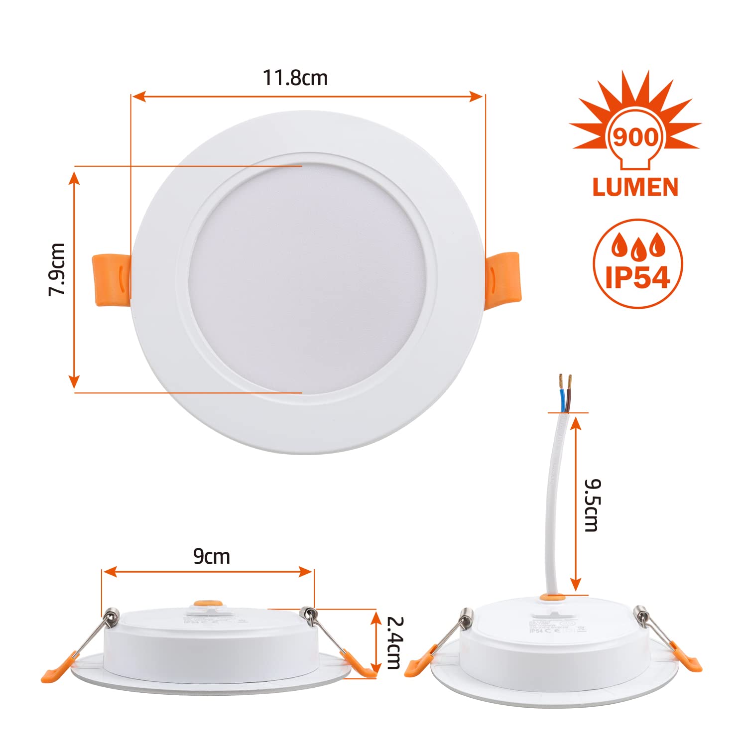 ["The LED recessed lights with three color temperatures, 3000/4000/6000K (warm white / natural white / cool white), which can be adjusted with the slide switch on the back of the light to meet your different needs for warm and cool light tones.", "High-quality 6-piece set of durable 9W LED recessed lights, brightness 900 lumens. High-quality LED beads with homogeneous and efficient PC-translucent cover, providing you with energy-saving and bright LED spotlights. The white color is also very stylish and matches most common interior styles.", "The waterproof class IP54 enhances the ability of the light to survive in non-dry environments, so you don't have to worry about the environment with LED spots, ideal for use in moist environments such as bathrooms, kitchens, hallways, basements, etc.", "The ceiling spots measures 120 x 26mm (diameter x thickness) and fits in 90-110mm cutout holes, with 110mm connecting cable for access to 230V circuits, making installation very simple.", "We value the experience of our customers and offer a 2-year warranty on the LED ceiling lights. If you encounter any problems, you can contact us at any time and we will replace it for free or give you a full refund, please buy with peace of mind."]