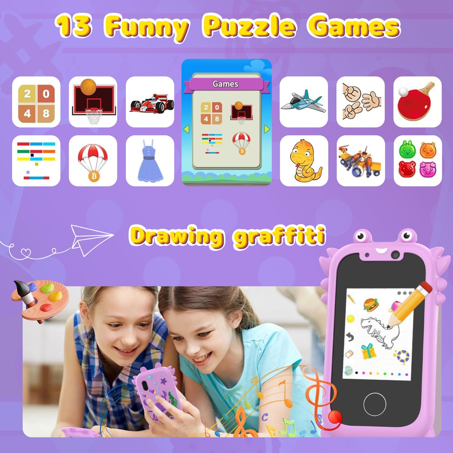 "Perfect gifts for girls and boys: The toy phone for ages 3 and up includes a unicorn pattern silicone case for aesthetic appeal and enhanced durability. A gift for birthdays, Christmas, and special occasions for children aged 3 to 10 years. The 800mAh battery allows for 5-6 hours of continuous use after a full charge. Ideal for travel and daily use, with a carrying strap for easy carrying"