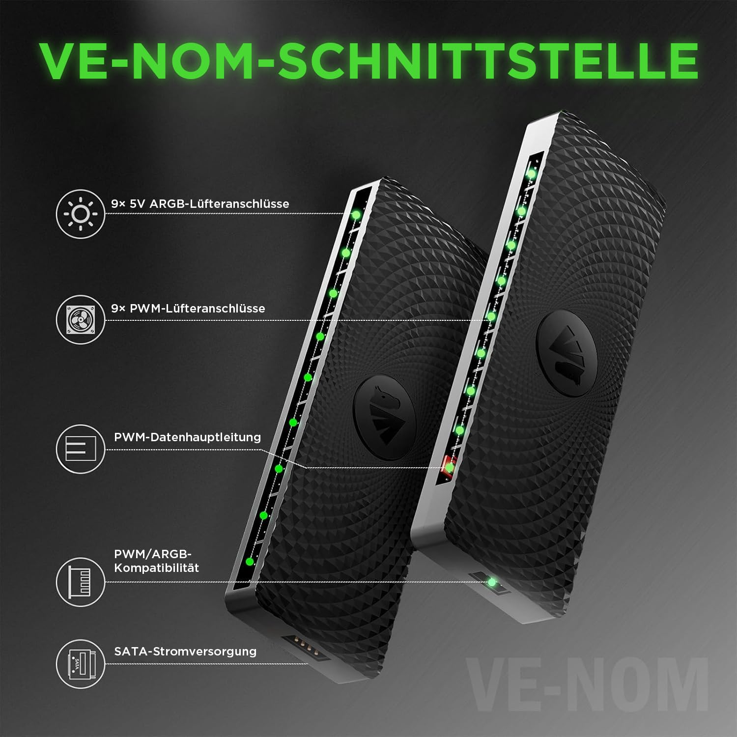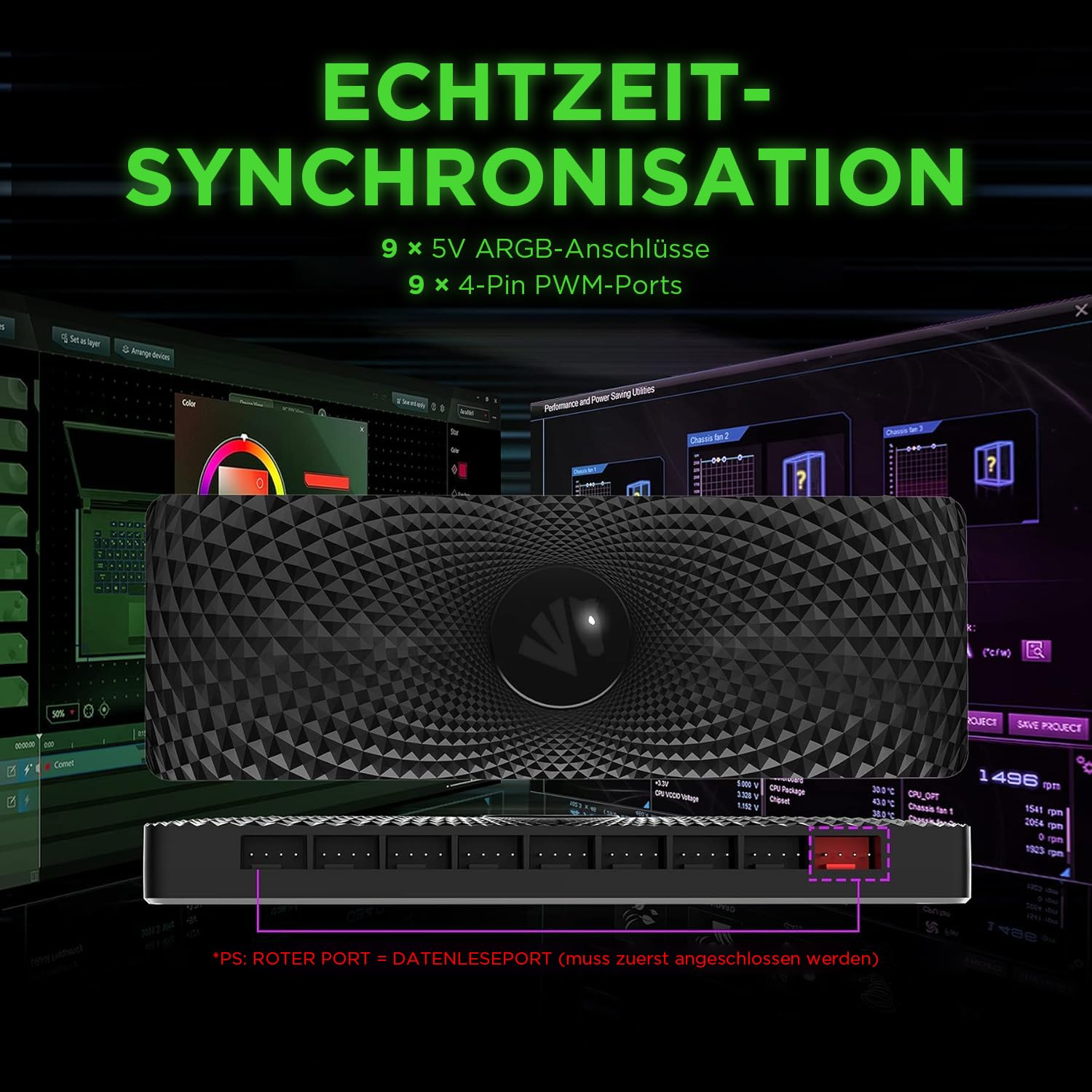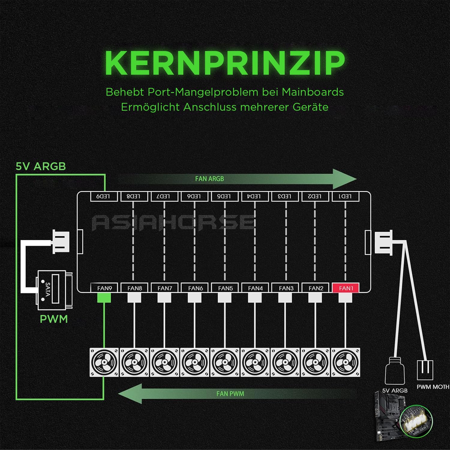 AsiaHorse 2 IN 1 ARGB/PWM 9 Ports Fan Hub, Distributor with SATA Power, PWM Function Fan Adapter, 12V4PIN-PWM and 5V3PIN-ARGB connectors, Motherboard control hub, Cable Management.