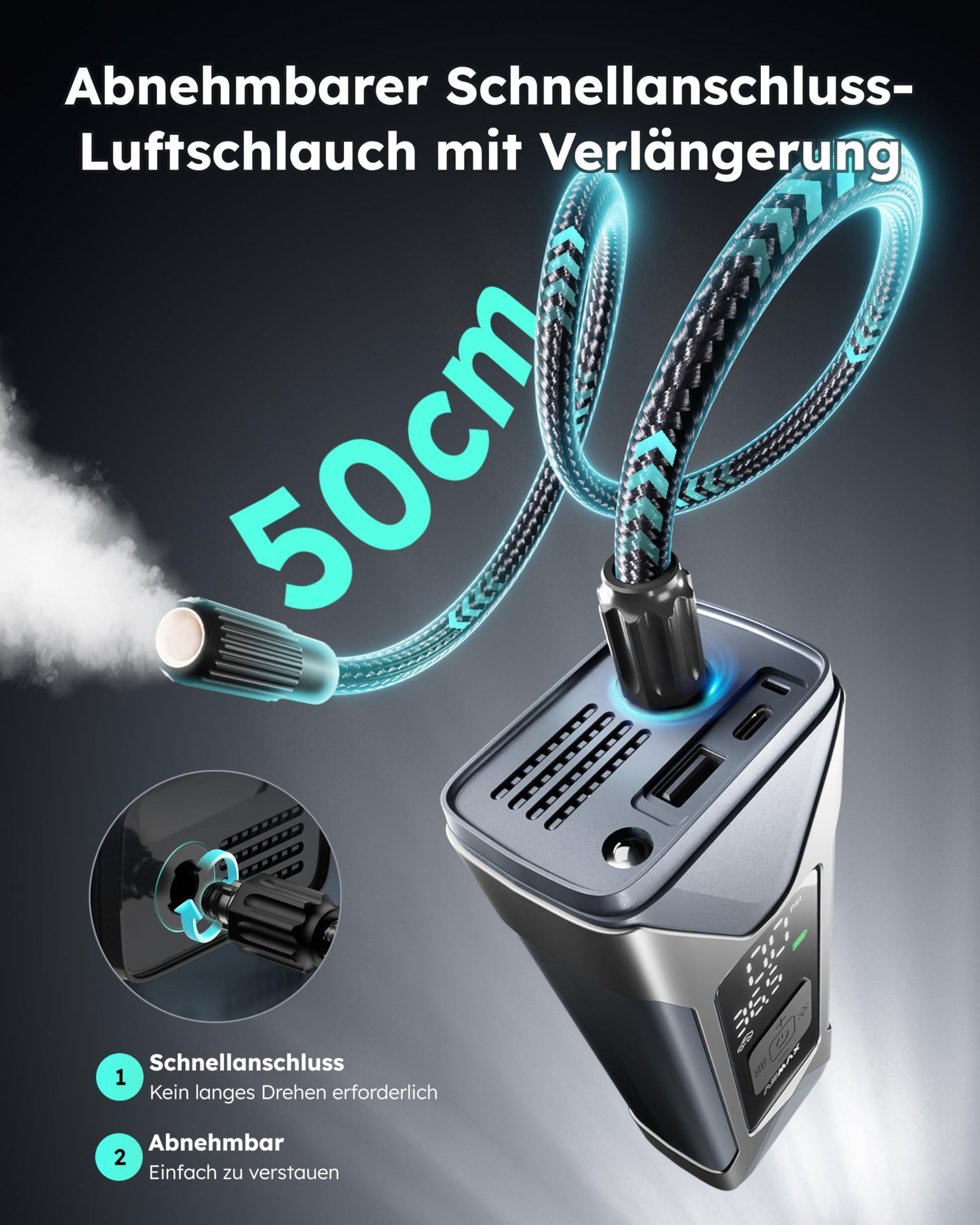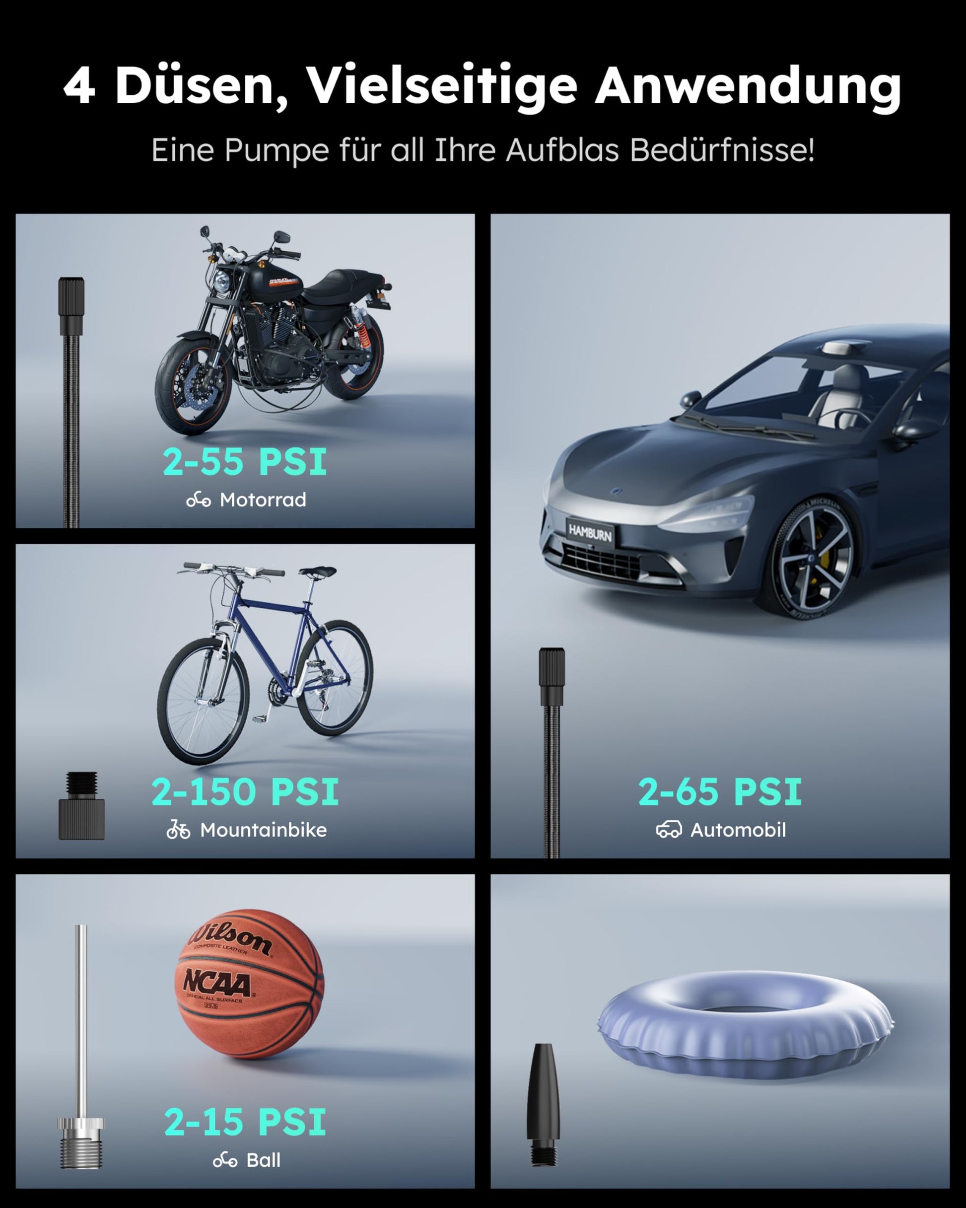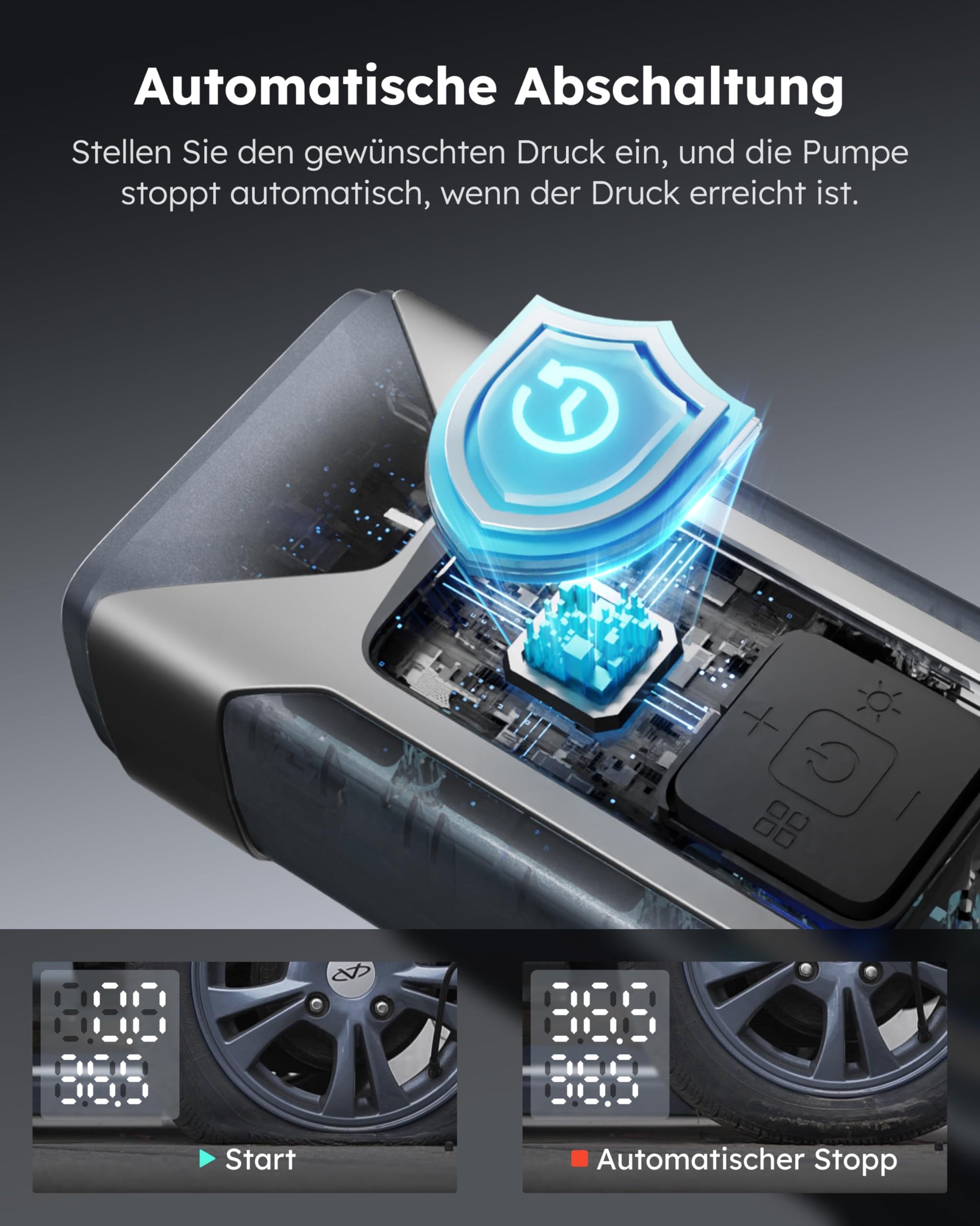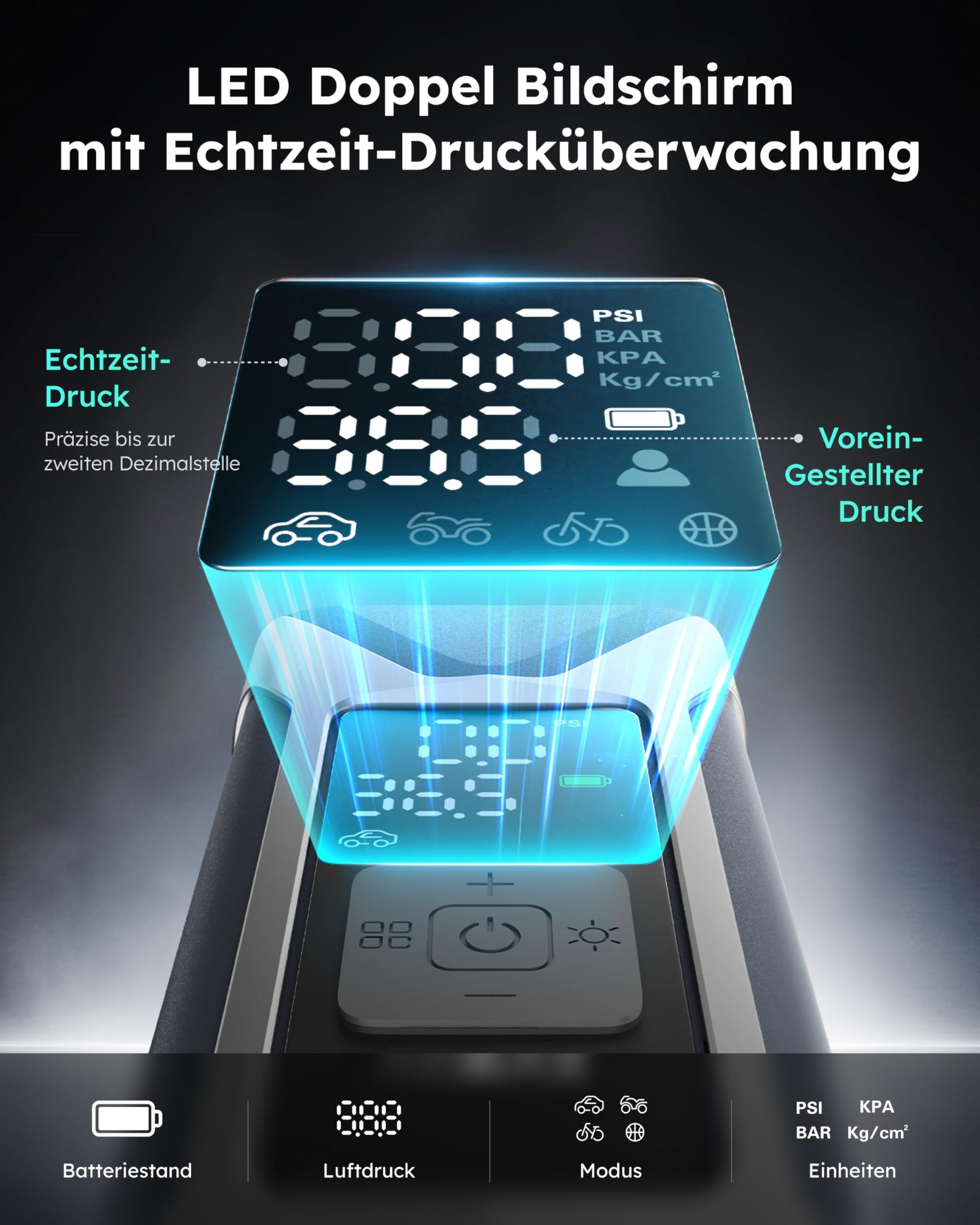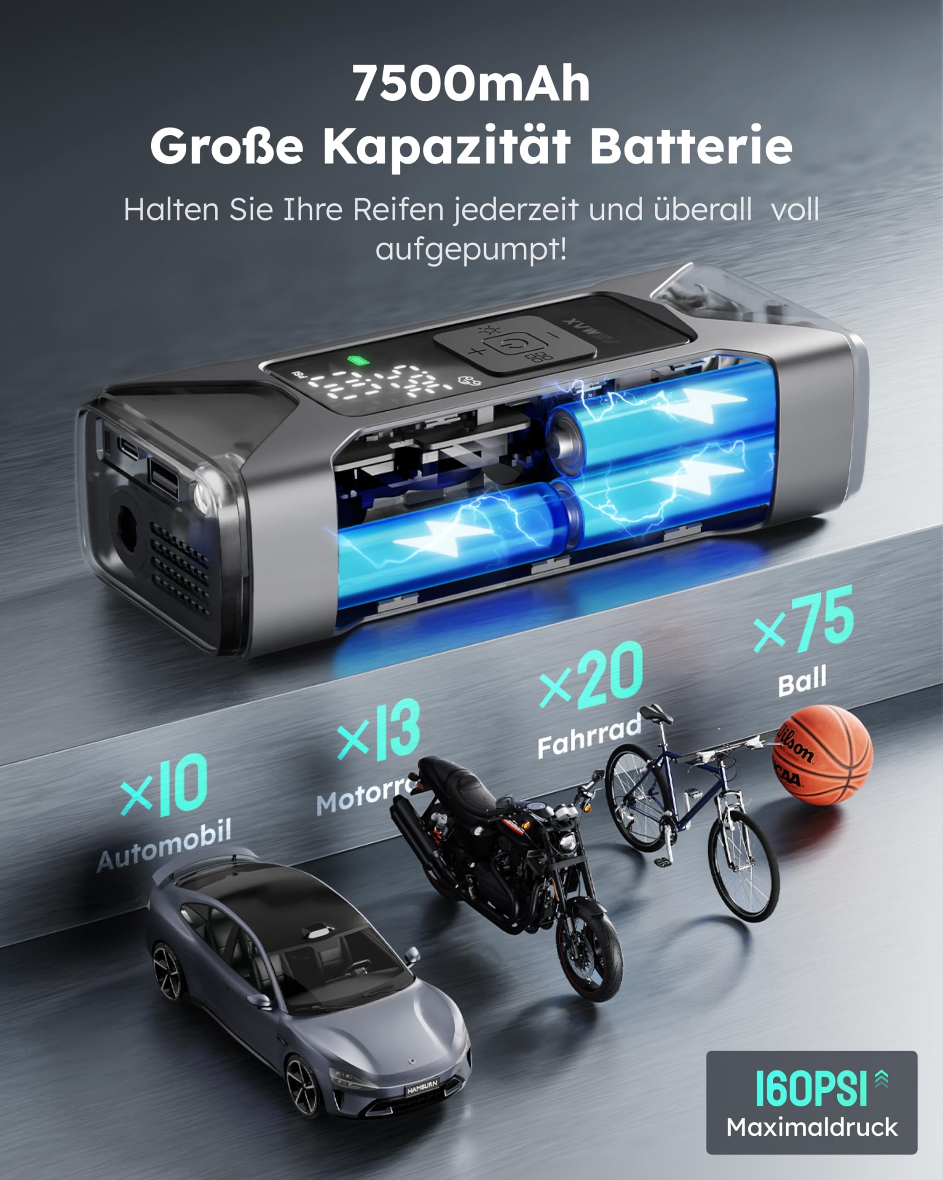 ["Efficient inflation: The ASMAX electric air pump offers an impressive inflation speed of 26 L/min and fills tires quickly - with a maximum pressure of 160 PSI. Once the preset pressure is reached, the pump stops automatically to prevent overfilling. Equipped with a powerful motor and intelligent cooling system, the pump protects against overheating and ensures long-lasting and reliable performance - even with regular use for more than three years.","Real-time tire pressure monitoring: With this cordless air pump, you can monitor tire pressure in real-time - down to 0.01 bar. The dual LED display shows not only the current pressure and selected pressure unit, but also the battery status and preset pressure value. Switch between units PSI, kPa, BAR, and KG/CM with just a press of a button.","Versatile application: The electric air pump offers five different inflation modes suitable for cars, motorcycles, bicycles, balls, RVs (trailers, campers), and other individual applications. In custom mode, the pressure can be set up to 10.8 bar. The accessories include various valves (Schrader, Presta, needle adapter, and swim ring adapter) making this pump a practical all-rounder for any situation.","7500mAh high-capacity battery: The ASMAX air pump is equipped with a 7500mAh battery that not only ensures tire inflation but also serves as a power bank. The integrated LED lamp lights up in darkness and helps with tire changes or as a warning light for vehicles. So you have the necessary support at all times, both during the day and at night.","Compact and portable: The pump is lightweight and compact, with a convenient storage bag that allows you to easily store it in the trunk or toolbox - perfect for on-the-go in the RV. The quick-release, insulated air hose can be installed within seconds. Easy to use, the air pump is suitable for all ages and is the ideal gift for friends and family."]