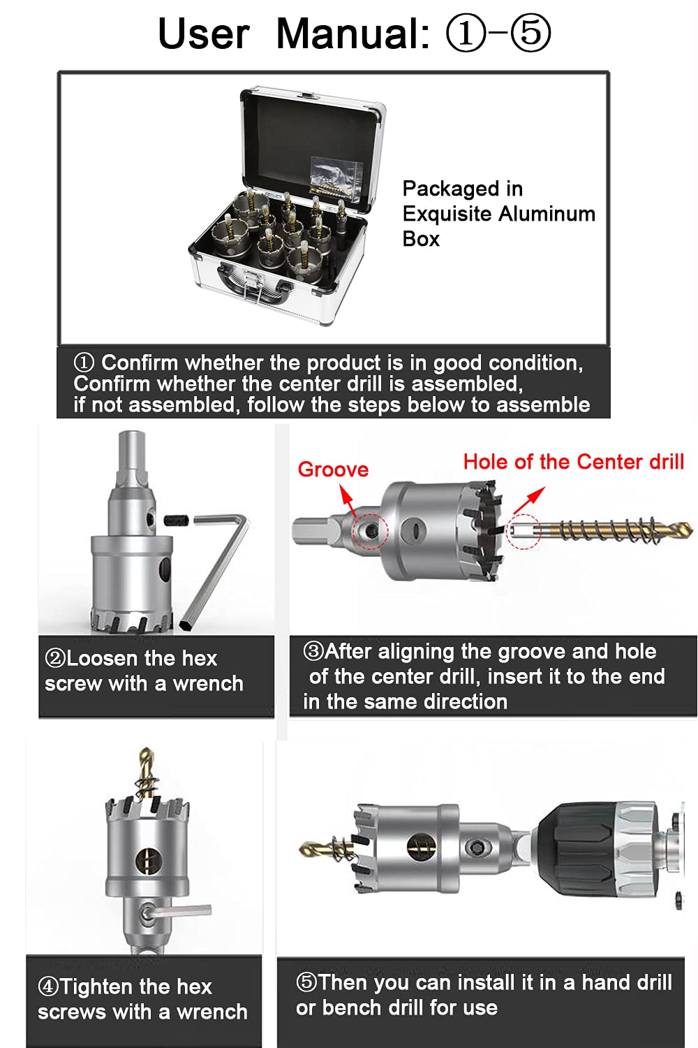 【Package】 Includes a 10-piece TCT hole saw set and 2 additional titanium-coated M2(6542) steel centering drills, 2 hex keys. All drills are packed in an exquisite aluminum box with each drill also oiled (rust protection)."