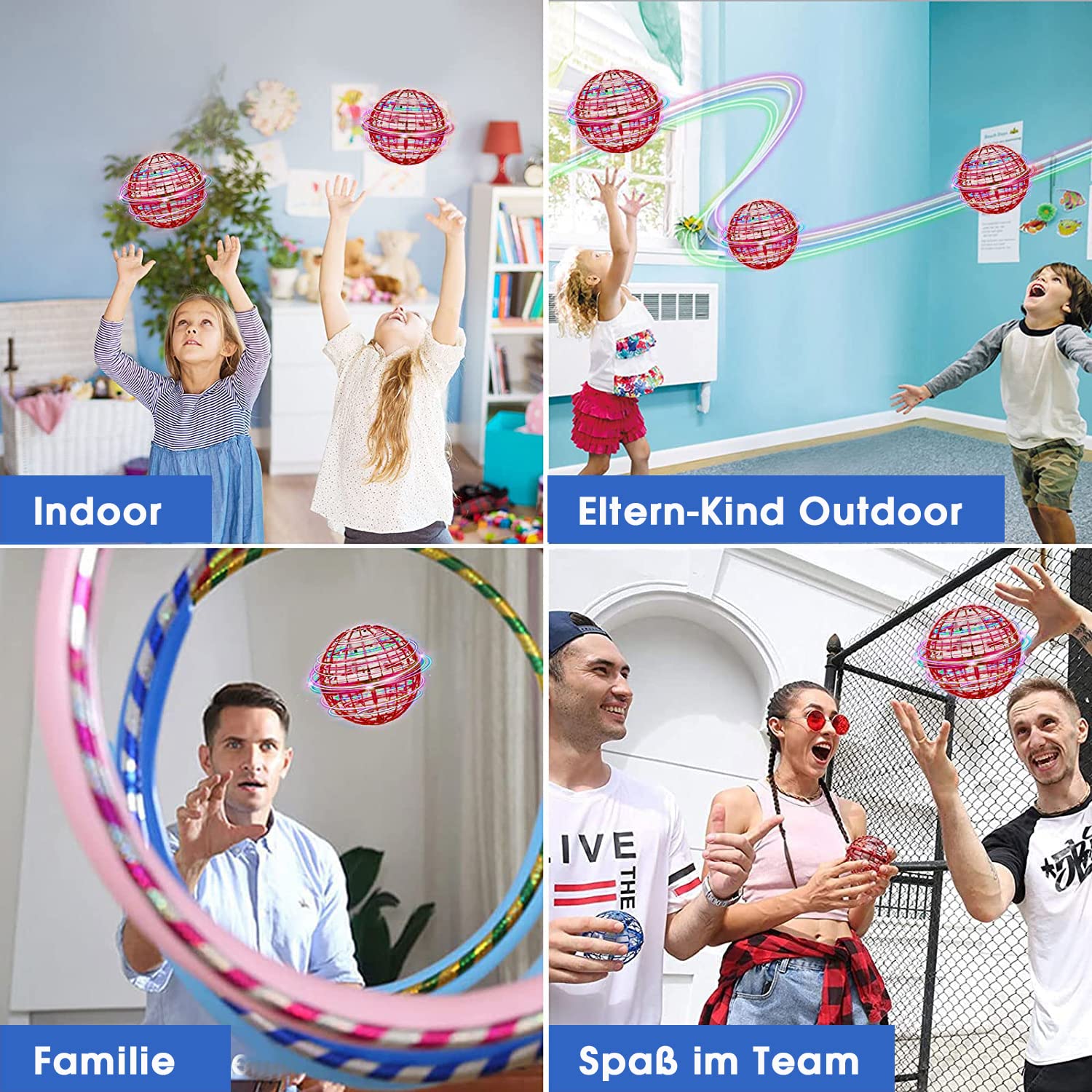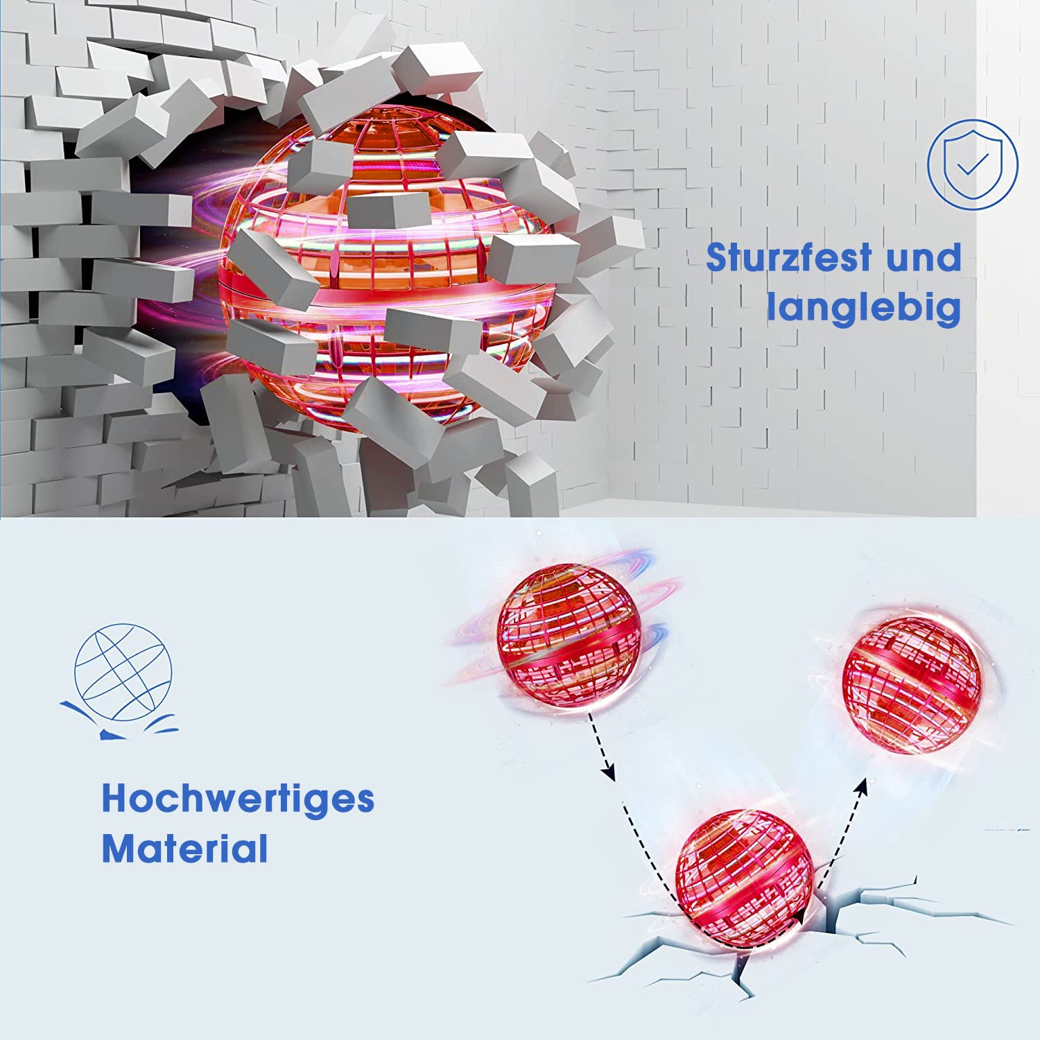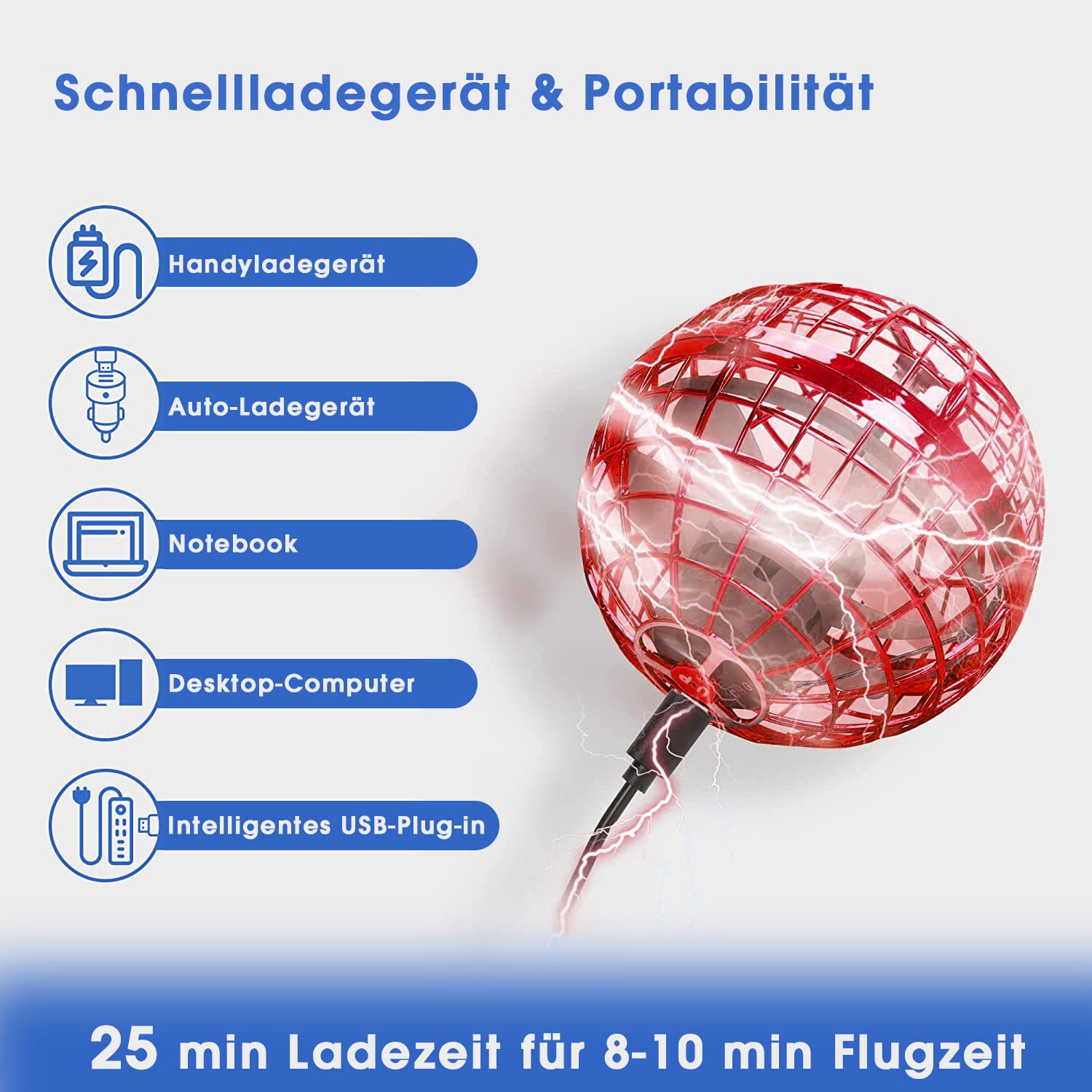 ["【Upgrade of the Hover Flying Ball】 The upgraded ball shape and more powerful motor of the Flying Ball. Magic spinner ball climbs at your command through the air and then returns to your hand like a boomerang. With RGB light, the mini drone shines brightly and colorfully when flying at night. In the age of social distancing, this is the perfect way to keep kids moving so they don't turn into couch potatoes during lockdown.","【Safe and Durable】 Flying Ball is a hand-controlled high-tech drone flying toy that has been tested for use with children. Thanks to its ball-shaped design and protective cover, it is absolutely safe to grab with your hands. And use environmentally friendly material, which is surprisingly soft and light and has good impact resistance. When it hits an obstacle, it slows down and stops naturally.","【Easy to Use】 First, turn on the switch, the "Up" logo is on top, and then shake lightly to make the aircraft spin. Throw it up 30° to fly. It spins and returns to you like a boomerang. Throw it down 30° to be able to fly. It flies steadily in a straight line. It's perfect for playing with friends. If you want to stop playing, just shake it and stop spinning.","【Rechargeable Design & Portable】 Charging for 25 minutes is enough to give hoverball flying ball 15-20 minutes of pure flight time. This allows you to keep them flying, go further, and keep the good times rolling. The included USB charging cable can be used with a power bank, notebook, phone adapter, car charger, etc.","【Fun Anytime, Anywhere】 Hand-operated Mini Drone Flying Ball for kids (over 6 years) and adults makes even more fun with friends. Perfect for a back and forth catching game or team tricks with friends. It is designed to work indoors and outdoors with a consistent flight pattern and boomerang effect. Use it at home, school, party, or office. It makes great travel toys, birthday gifts, and fun party activities."]