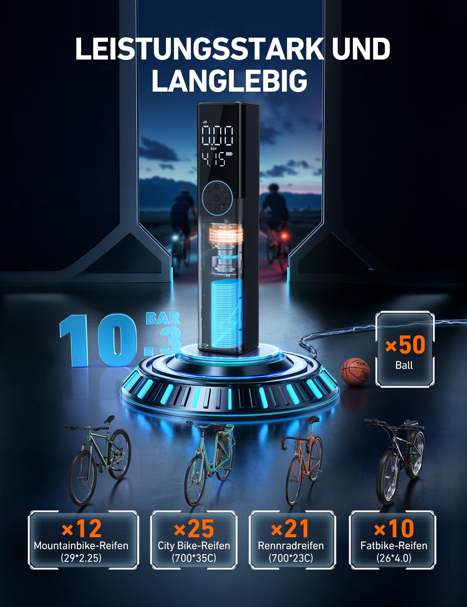["【LONGER LIFESPAN THANKS TO SPECIALLY DEVELOPED MOTOR】The cordless electric bike pump features a specially developed motor that not only provides high inflation speed, but also reaches a maximum pressure of 10.3 bar. It pumps bike tires from 4.2 to 5.5 BAR within 35S (tested with 700*35C City Bike), suitable for almost all types of bikes and ensures a longer lifespan.","【COMPACT & PORTABLE】This cordless bike pump also stands out for its compact size – measuring only 20 x 4.2 x 4.3 cm and weighing just 380 g. Thanks to its portable design, it fits easily into your backpack or bike bag, making it the perfect companion for commuting or outdoor adventures.","【EASY TO USE】You can easily switch between 5 preset modes: City bike, Mountain bike, Road bike, Fat bike, and custom mode. With a single button press, you can also switch between PSI and BAR units; set the pressure value according to the object to be inflated (up to 150 PSI/10.3 bar) to achieve the right pressure at all times.","【LARGE LED DISPLAY WITH DUAL DISPLAY】The large LED display shows both the preset and real-time pressure values. You can adjust the mode and pressure value according to your requirements, after which the pump automatically shuts off once the preset pressure value is reached, ensuring hassle-free inflation. Thanks to the memory function, you don't have to set the pressure each time you use it.","【UNIVERSALLY COMPATIBLE】AstroAI's Mobile Bike Pump is compatible with Presta, Schrader, and Dunlop valves, making it suitable for almost all bikes, e-bikes, and motorcycles. The LED lamp with 3 modes (flashlight, slow and fast blinking) provides visibility and safety even during nighttime operations."]