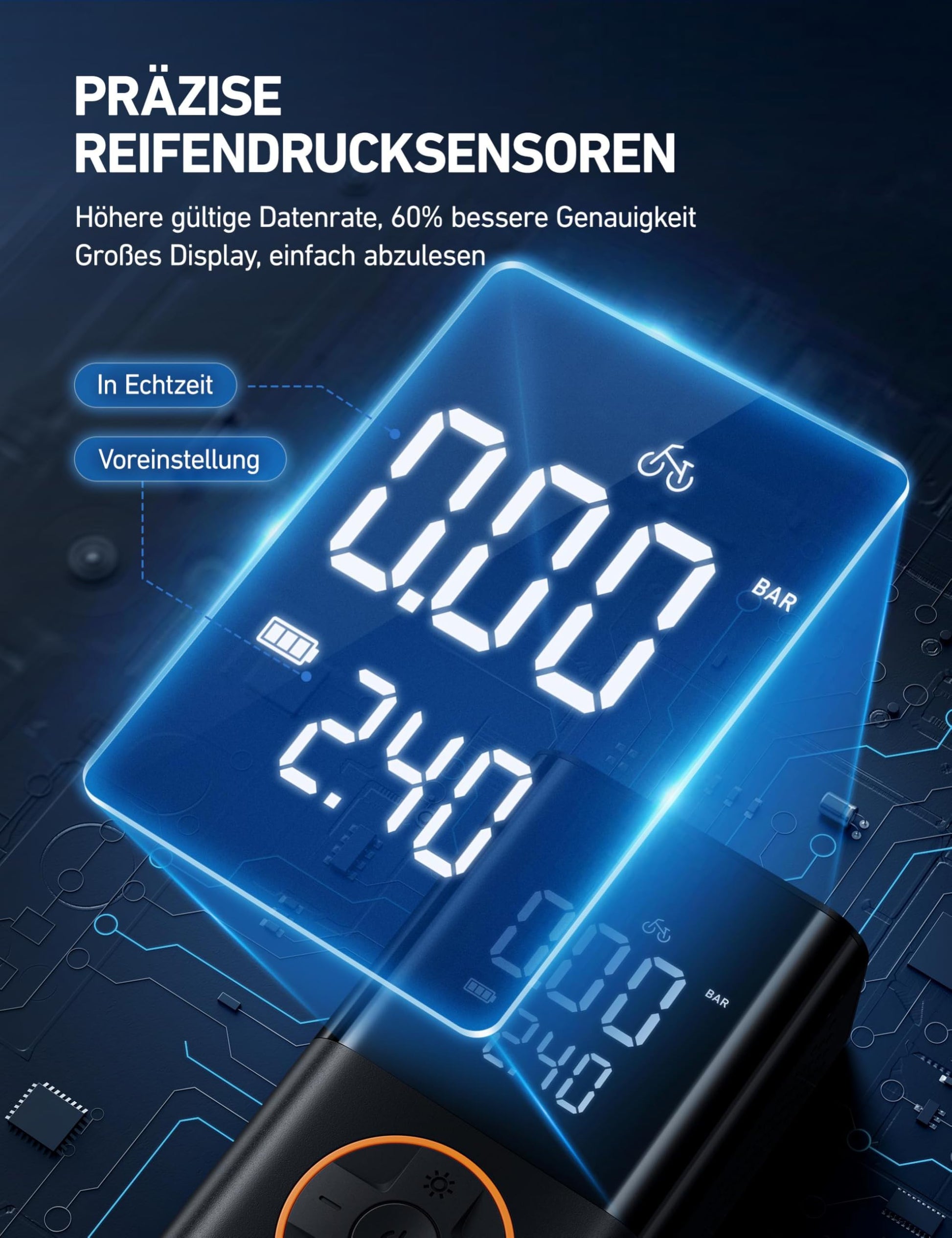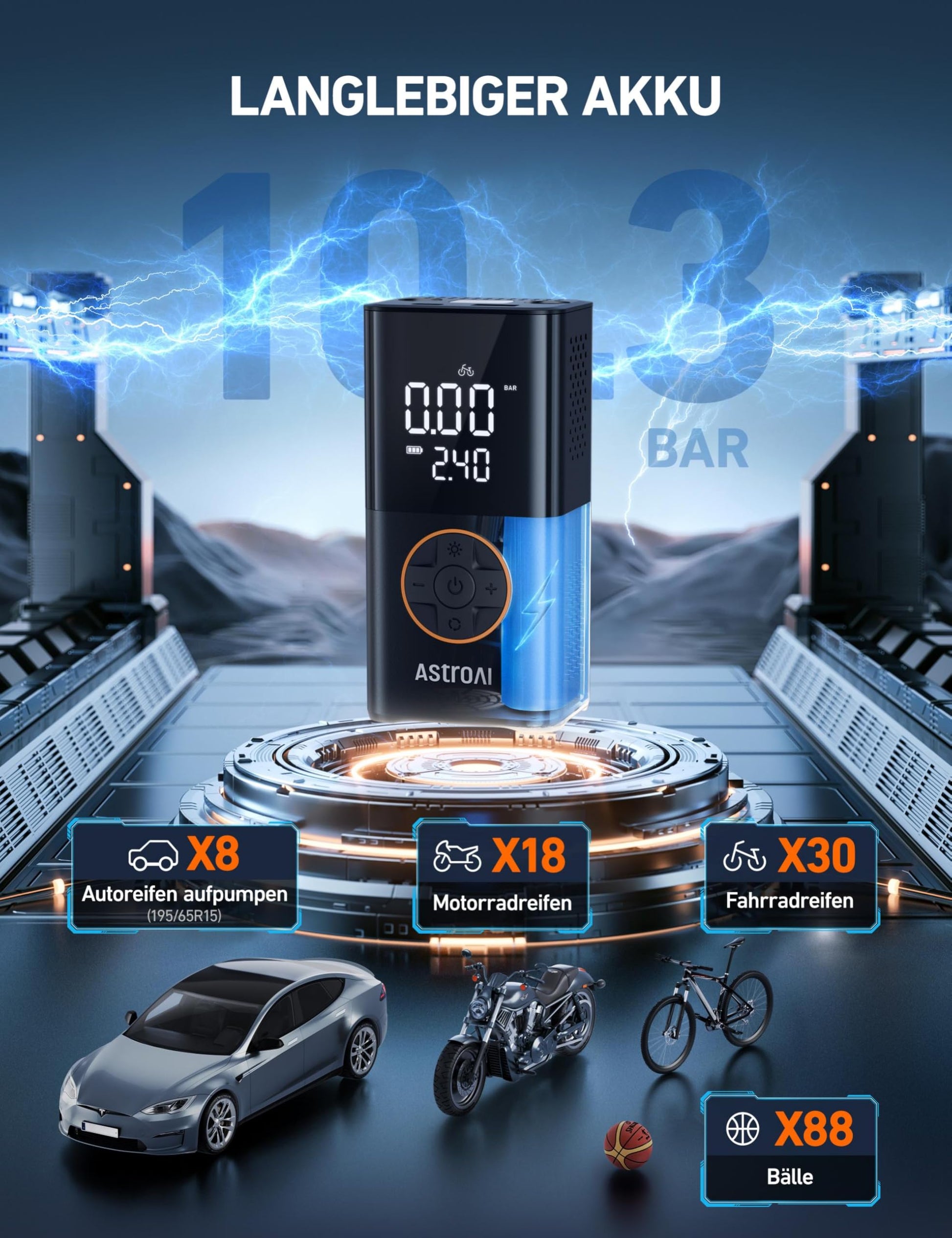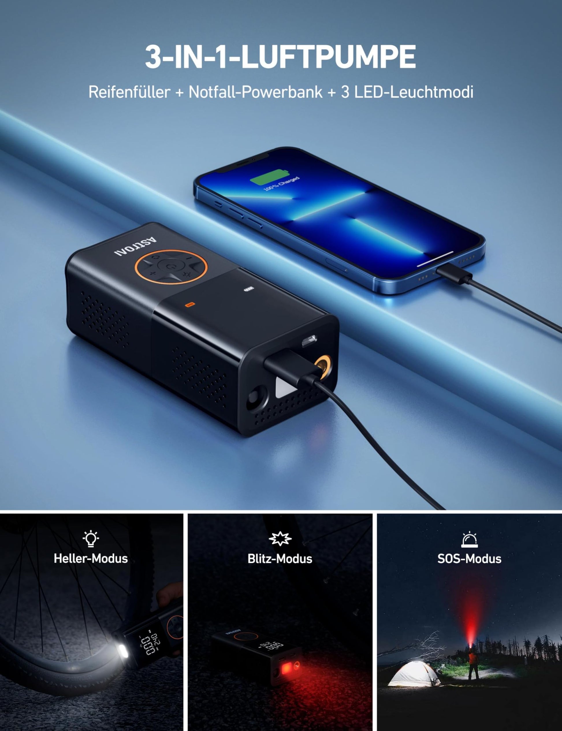 ["【ADVANCED 'TRUEGAUGE' DISPLAY】 This tire inflator features improved sensor technology that can capture pressure data from tire inflators at a frequency of 200 times per second. The valid data rate is over 80%, which is 60% better than the market average. Wherever you are going, with precise measurements, you will drive more safely.","【2X FASTER INFLATION & COMPACTNESS】 Weighing only 528g, this portable bike pump can be easily carried and stored in tight spaces, such as cars, bike racks, or backpacks. With a maximum pressure of 150 PSI and an air flow rate of 17 L/min, the air compressor inflates twice as fast. It can inflate a 195/65R15 tire from 30 to 36 PSI in 1.5 minutes.","【LONG BATTERY LIFE & AUTO SHUTOFF】 When the 4000mAh battery is fully charged, the tire inflator can inflate up to 8 tires (195/65R15) from 30 to 36 PSI. With presets and auto shutoff, you can even inflate hands-free after connecting. With just one button press, the tire inflator can inflate car, motorcycle, and bicycle tires, as well as balls and more. (Note: Not suitable for heavy-duty tires on off-road vehicles, RVs, trucks, and trailers.)","【USER-FRIENDLY】 Depending on your needs, you can choose from 4+N smart modes (auto, motorcycle, bicycle, ball, and manual). You can also select from 4 pressure units (PSI, bar, kPa, kg/cm²) as desired. In manual mode, you can adjust the desired pressure value (3-150 PSI) to suit the object being inflated.","【VERSATILE EMERGENCY TOOL】 The air compressor not only serves as a tire pump, but also as a multifunctional emergency tool. The top flashlight has 3 modes (flashlight, SOS, and strobe) so you can work with the device even at night. The air compressor is equipped with USB-C and USB inputs/outputs, allowing you to charge your smartphone or other devices in emergencies."]
