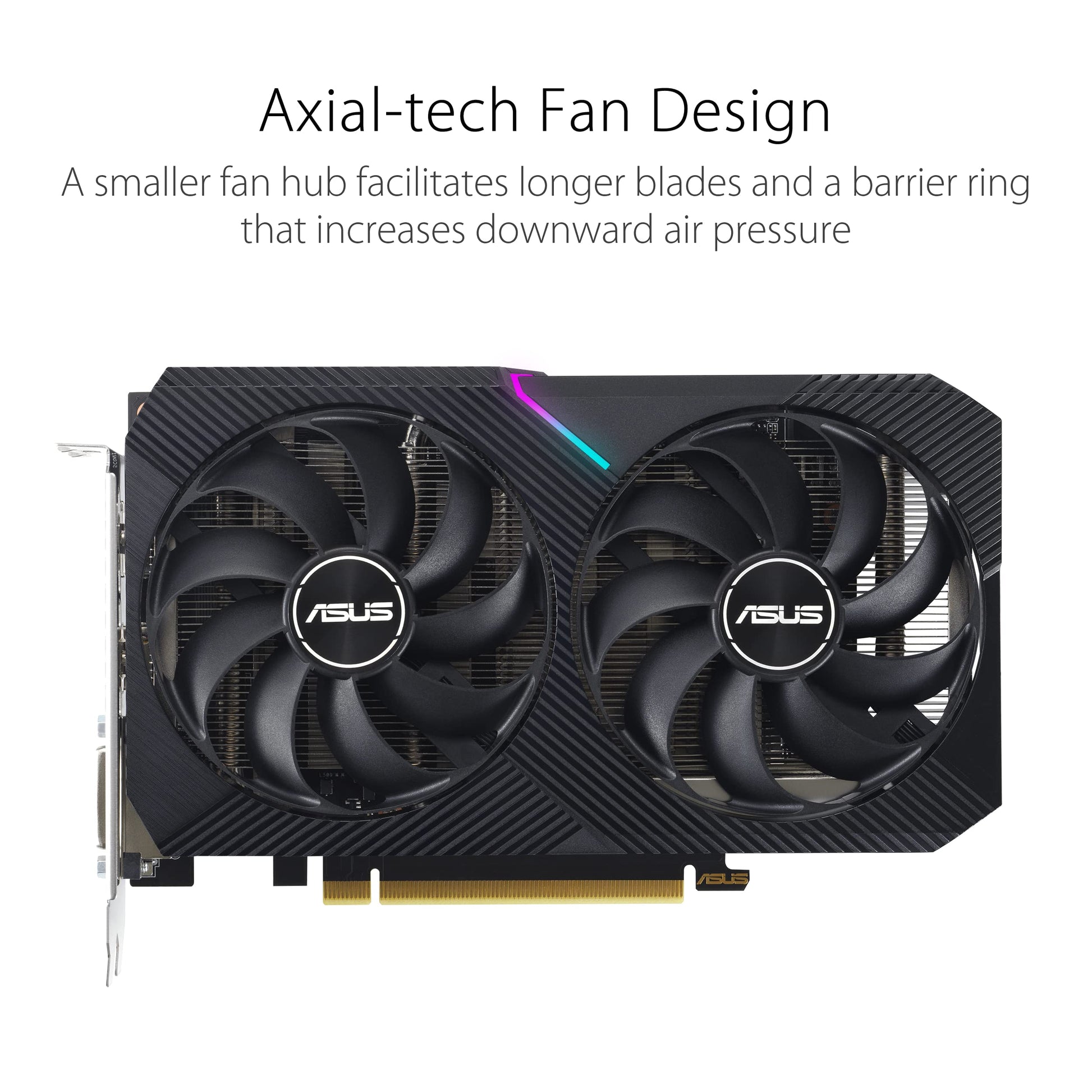 ["NVIDIA Ampere streaming multiprocessors: The ASUS RTX 3050 utilizes Ampere SM to provide 2x FP32 throughput and improved efficiency","2nd generation RT Cores: Experience 2x throughput in ray tracing with 2nd gen RT Cores and simultaneous RT and shading throughput for stunning visual effects","3rd generation Tensor Cores: With advanced AI algorithms and DLSS, the RTX 3050 8GB boosts throughput for significant performance in gaming and AI applications","OC mode (1852 MHz): The ASUS GeForce RTX 3050 offers a boost clock of up to 1852 MHz in OC mode, for maximum performance","Axial-Tech fan design: The Axial-Tech fan design with longer blades and a barrier ring ensures better air pressure and cool, stable performance, even in compact cases"]