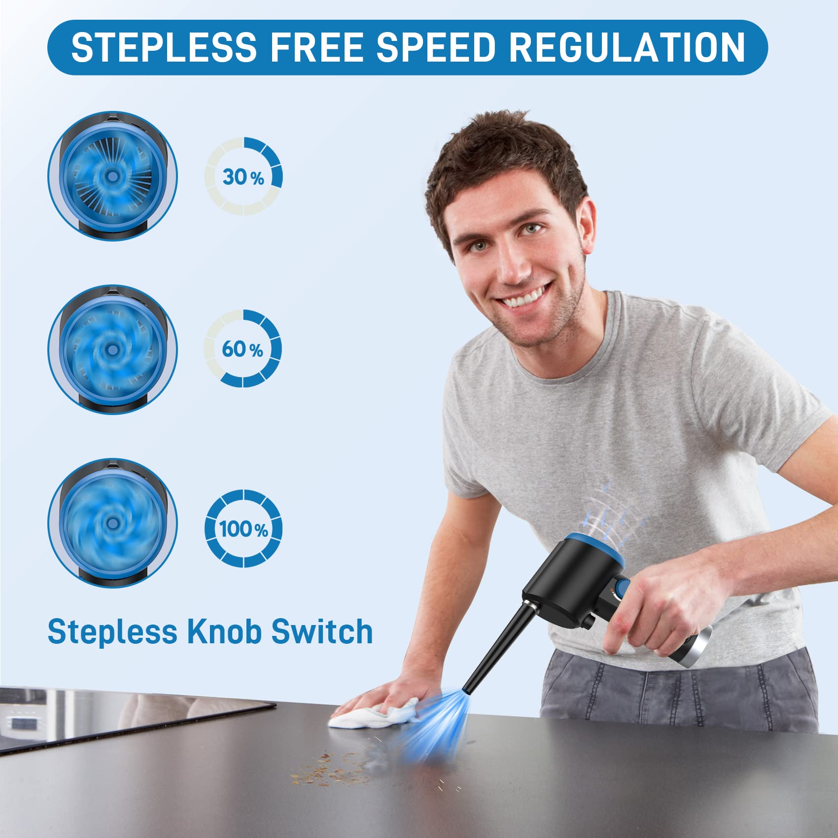 ["Air Duster Brushless Motor The electric air duster features a brushless DC motor, stable performance, and long service life. The powerful motor allows the air duster to achieve higher speed and stronger wind. Air Duster has improved one-button quick start and stop function, equipped with stepless speed regulation, easy to operate. Vacuum Cleaner Stepless Button Originated from the unique button speed control design. Unlike the fixed wind of the Air Duster, you no longer need to press the button multiple times to change the wind speed. You can adjust the wind speed continuously by simply rotating. The electric air duster is no longer fixed to a certain speed. Don't worry that the fixed wind power is too strong to damage objects. PC Cleaning Kit: Improved keyboard cleaning air spray, accessories include 5 nozzles, 3 brushes, 1 keyboard puller, and storage bag. With brushes and nozzles, the air duster can perform thorough cleaning, for example, of hard-to-reach dust such as computer cases, keyboards, windows, etc., and you can also use the air blowing nozzle as an air pump for inflating swim rings and air mattresses. Easy storage with storage bag. Cordless Air Duster Fast Charging The rechargeable air duster is equipped with a Type-C charging cable. The PC Air Duster can be used continuously for 18 to 30 minutes on a full charge. The duration of use depends on the wind speed. The power of the keyboard cleaning air spray with 6000 mAh is sufficient for daily cleaning and can be charged via a mobile power supply, a car charger, or an adapter. Air Pressure Spray Environmentally friendly Electric air duster can be charged and reused, no chemical gas, no constant purchase of canned air required, saves money and is more cost-effective, environmentally friendly compared to canned air, stronger wind, can clean dust thoroughly. If you have any questions about the product usage, please contact us."]