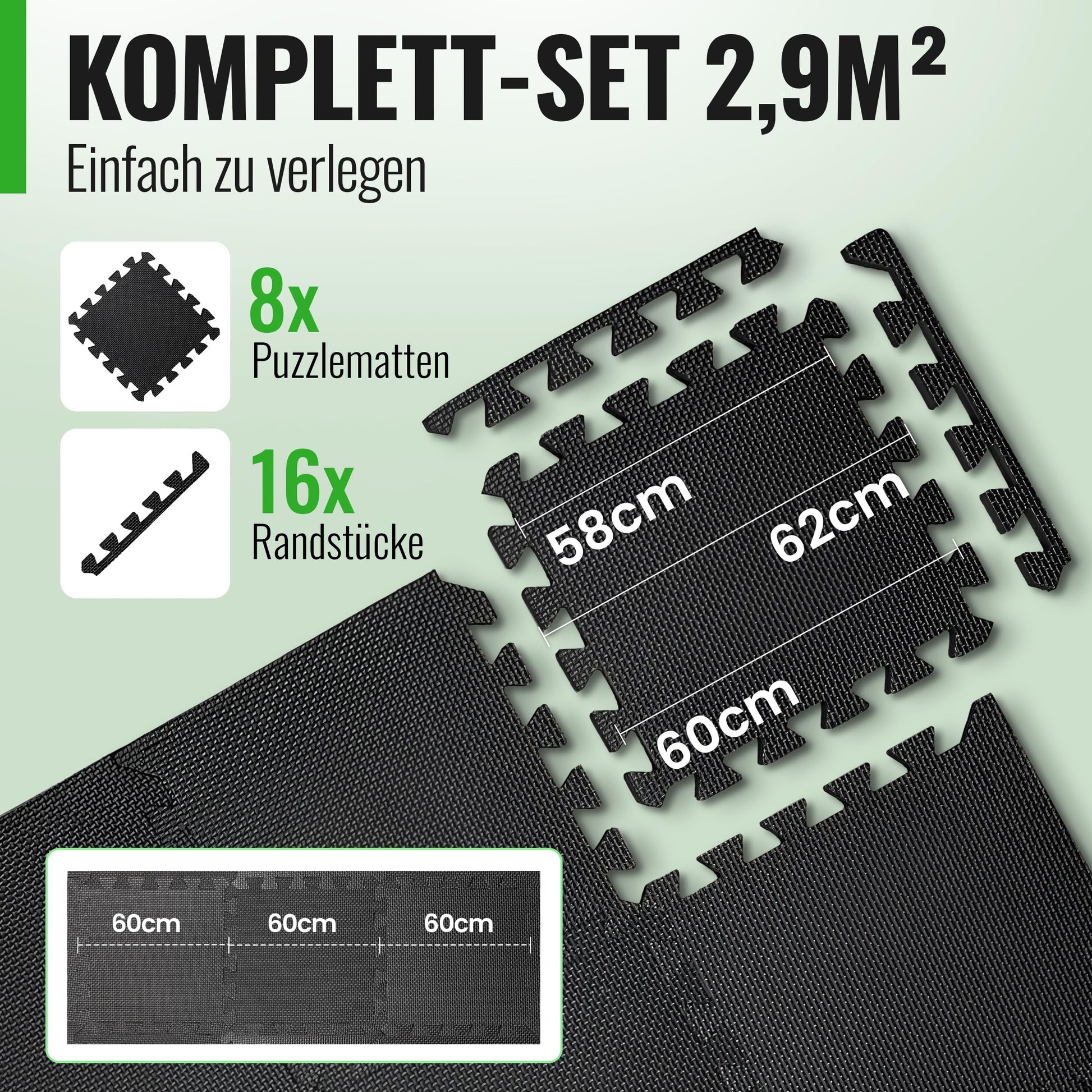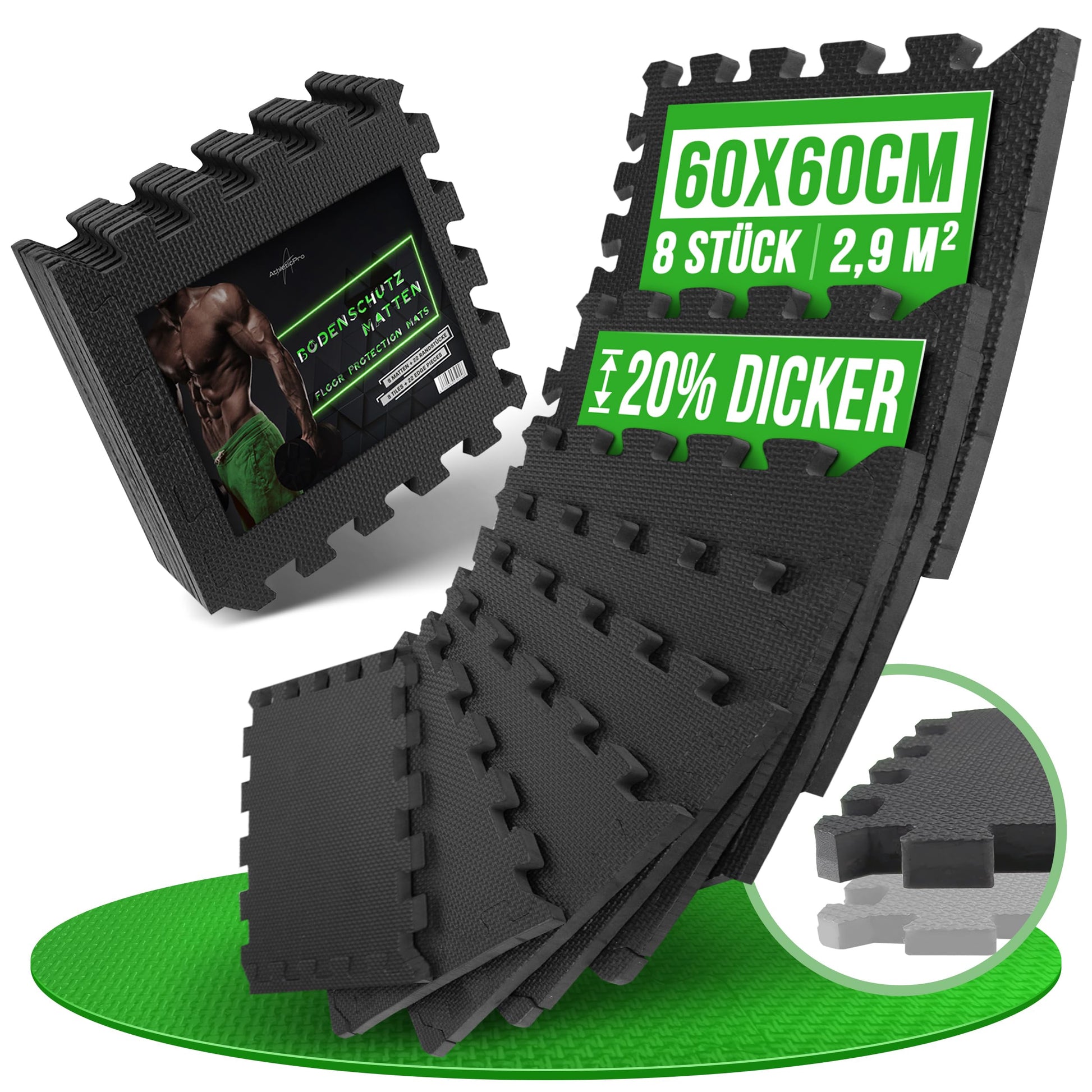 Γπ πππππ ππππ - Our individually interlocking pool mats are suitable for any space. The excellent floor protection consists of 8 mats each measuring 60x60cm. With the 16 practical end pieces, any interlocking shape is easily achievable!","πͺ πππππππππππππ πππππππππ - Thanks to the moisture-resistant material, cleaning the fitness floor is a breeze: Simply clean the sports floor with soap & water. Sweaty workouts are therefore warmly welcomed!","πͺ ππΓπππππππππππππ πππππ - The beautiful floor should remain 100% intact. For this reason, we have made our innovative impact protection mats 20% thicker than the competition. Dropping dumbbells at home is no longer a problem!","πͺ πππππππ
