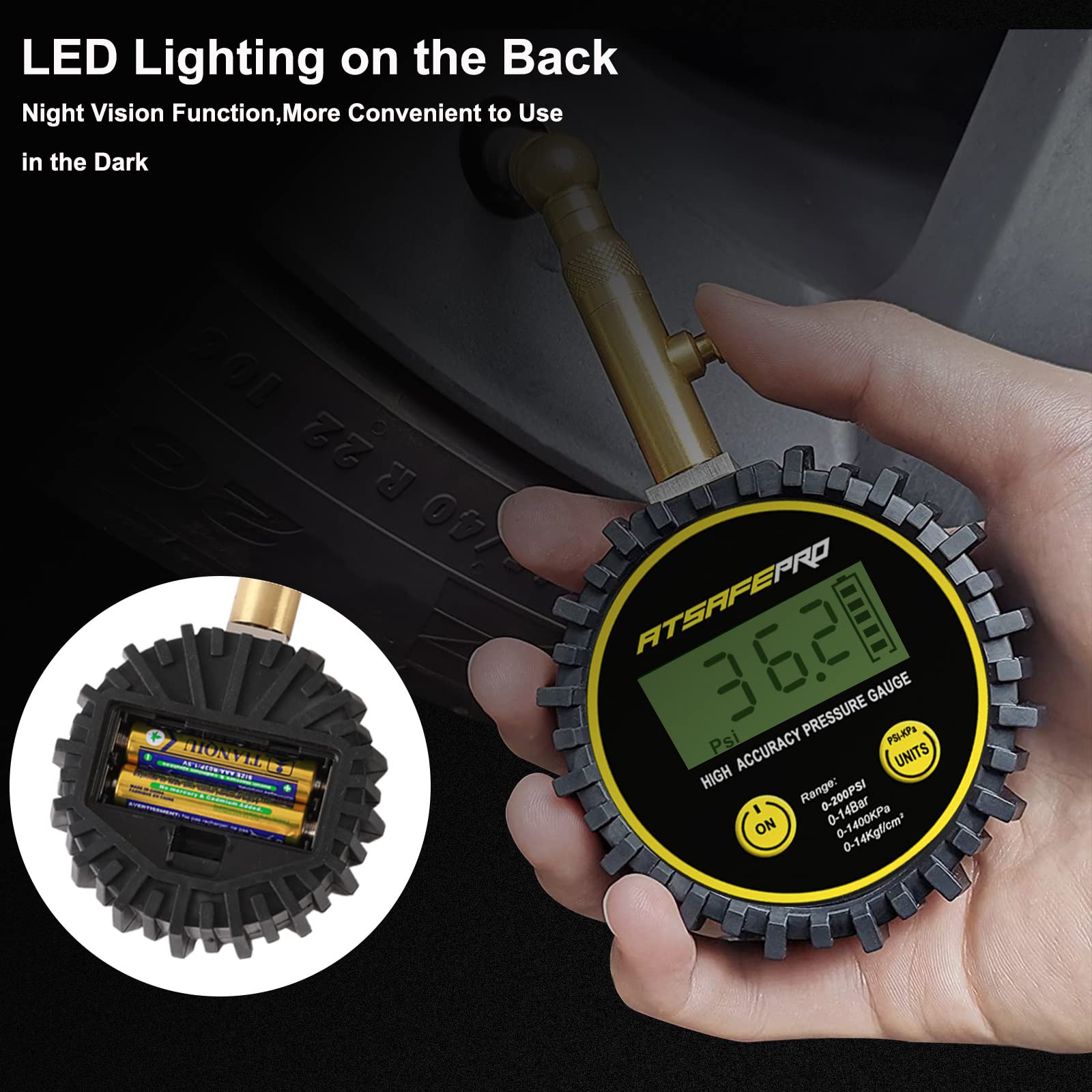 ATsafepro Digital Tire Pressure Gauge, Air Pressure Gauge 200 PSI for car, truck, SUV, motorcycle, digital tire pressure gauge certified ANSI B40.1, accurate and LCD with backlight.
