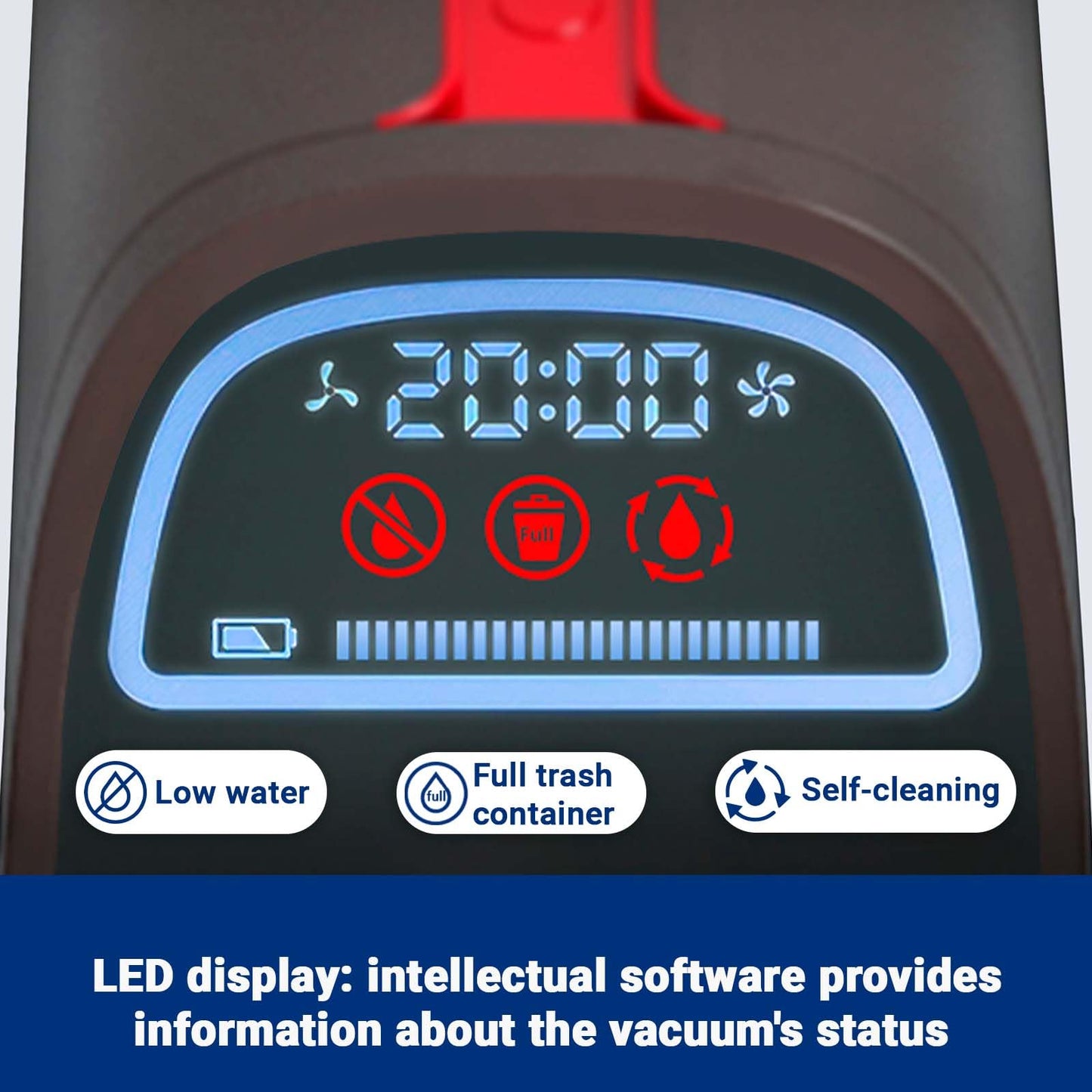 LED DISPLAY: The vacuum cleaner's intelligent software works with the user through the LED display to provide information about the status of the vacuum cleaner. This way, you won't forget to clean the dirt container, refill water, charge the device, or turn on the self-cleaning function. The LED display control is easy to use."