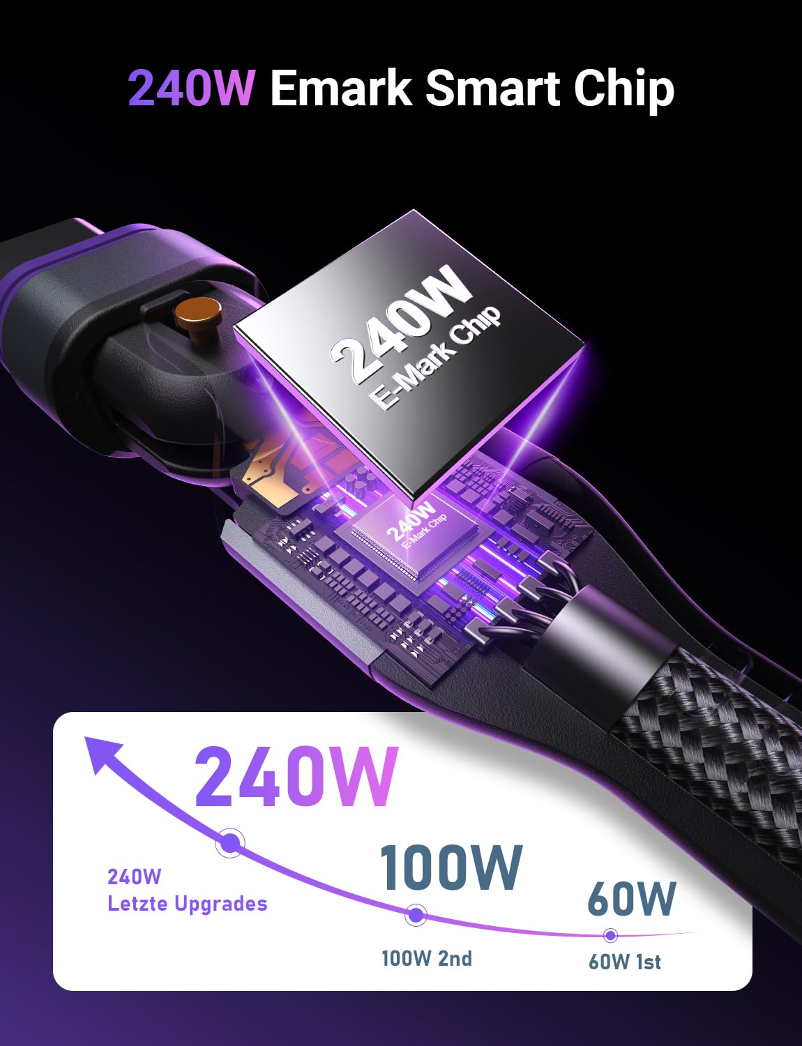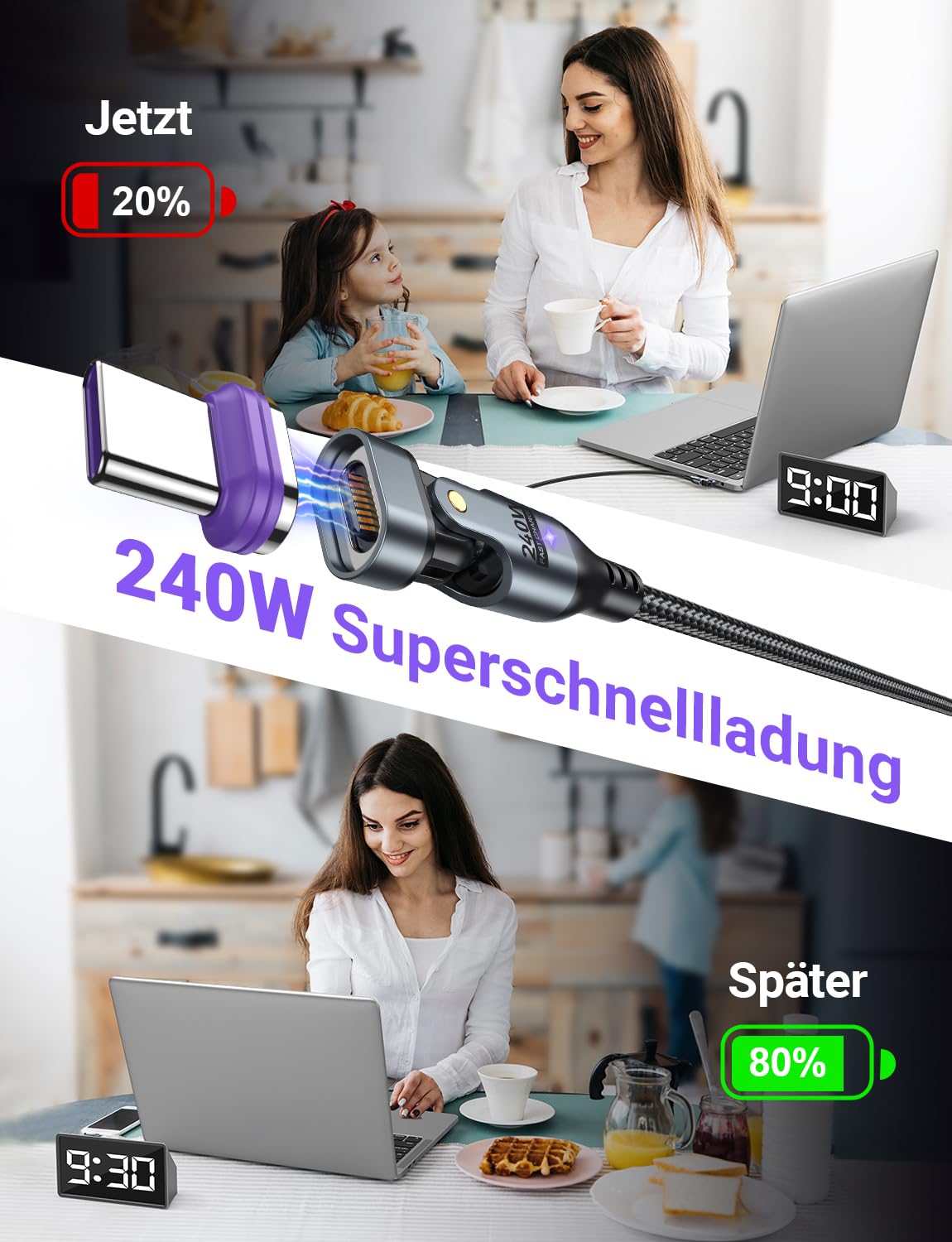 ["Craft Production - reliable quality usb c Magnetic Charging Cable"] Our goal is to provide every consumer with a diverse and interesting charging experience. We have our own research and development team to update and improve our products. ["240W Super Fast Charge Magnetic Charging Cable"] The unparalleled Super Fast Charge technology drastically reduces charging waiting times. According to experimental test results, it can charge a Samsung Galaxy S22 to 90% in 35 minutes or a MacBook Pro to 100% in 1.9 hours. ["Charge the latest phone15 devices"] With our 240W C-to-C Magnetic Fast Charging Cable, your Phone 15 can reach an amazing capacity of 71% in just 30 minutes. A more efficient choice for a new generation. ["Latest E-Marker 2.0 Smart Chip"] Compared to other magnetic fast charging cables without an E-Marker chip, AUFU's 240W usb c magnetic cable is equipped with an E-Marker 2.0 chip. 56 Kilo-Ohm resistance for seamless connection and smooth charging that effectively protects your device from potential damage. ["480 Mbps Magnetic Data Cable"] This is both a Magnetic Fast Charging Cable and a Magnetic USB C Data Cable with 480Mbps data transfer, 2-3 times faster than normal WIFI transfer. (This product does not support video transfer) ["Universal Compatibility"] The USB-C connector works with most USB-C sockets for all USB-C devices. For example, for Phone 15, Phone 15 Plus, Phone 15 Pro, Phone 15 Pro Max, for Galaxy S24/S23/S22/S21/S20 series, Z Fold5, Z Flip5, Note20, A54, A34, A14, A53, A52, A33, A32, A13, Pixel 7, for iPad Pro 12.9 2021/2020/2018, for iPad Pro 11 2021/2020/2018, for iPad Mini 6, for iPad Air 5, for MacBook Air M2. ["Robust and Durable"] The process uses nylon braided material, the magnetic wire is very durable and wear-resistant. It can withstand bending more than 50,000 times. Additionally, thanks to the tinned copper wire, your device will not overheat during charging, and the multiple shielding prevents loose connections, extending the lifespan of the charging cable. ["Flat Head Design"] Compared to the round magnetic usb c charging cable, the exclusive flat head design can be better embedded in the phone case. The magnetic head can be fully inserted into the phone port to ensure the stability of the charging process. Moreover, when the device is not being charged, the magnetic head can be used as a dust cover to prevent dust from entering the device and affecting the product's performance.
