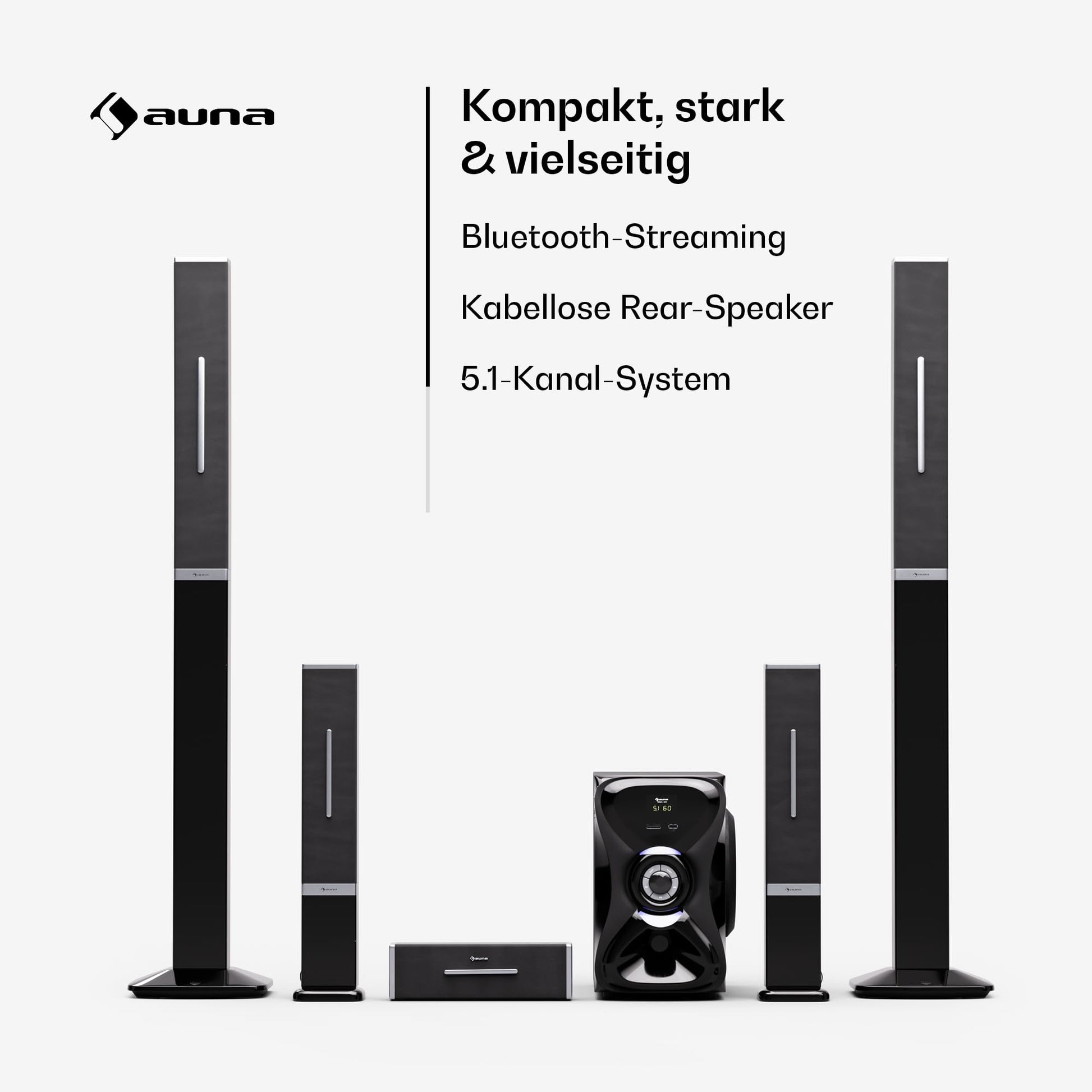 ["AT THE HEART OF THE SOUND: Powerful 5.1 channel speaker system with optical input for an impressive home theater experience with wireless surround sound.","WIRELESS AND CONVENIENT: Bring the cinema feeling to your home and enjoy wireless audio streaming with the 5.1 sound system via Bluetooth directly from your smartphone or tablet.","POWERFUL SOUND: With a 6.5-inch subwoofer and five 3-inch satellites, this wireless 5.1 sound system provides a total RMS power of 200 watts for impressive surround sound.","EASY OPERATION: Convenient control of your wireless 5.1 home theater sound system with a practical remote control.","CONNECTION OPTIONS: USB port and SD slot for MP3s as well as AUX input offer versatile connections for your wireless 5.1 sound system."]
