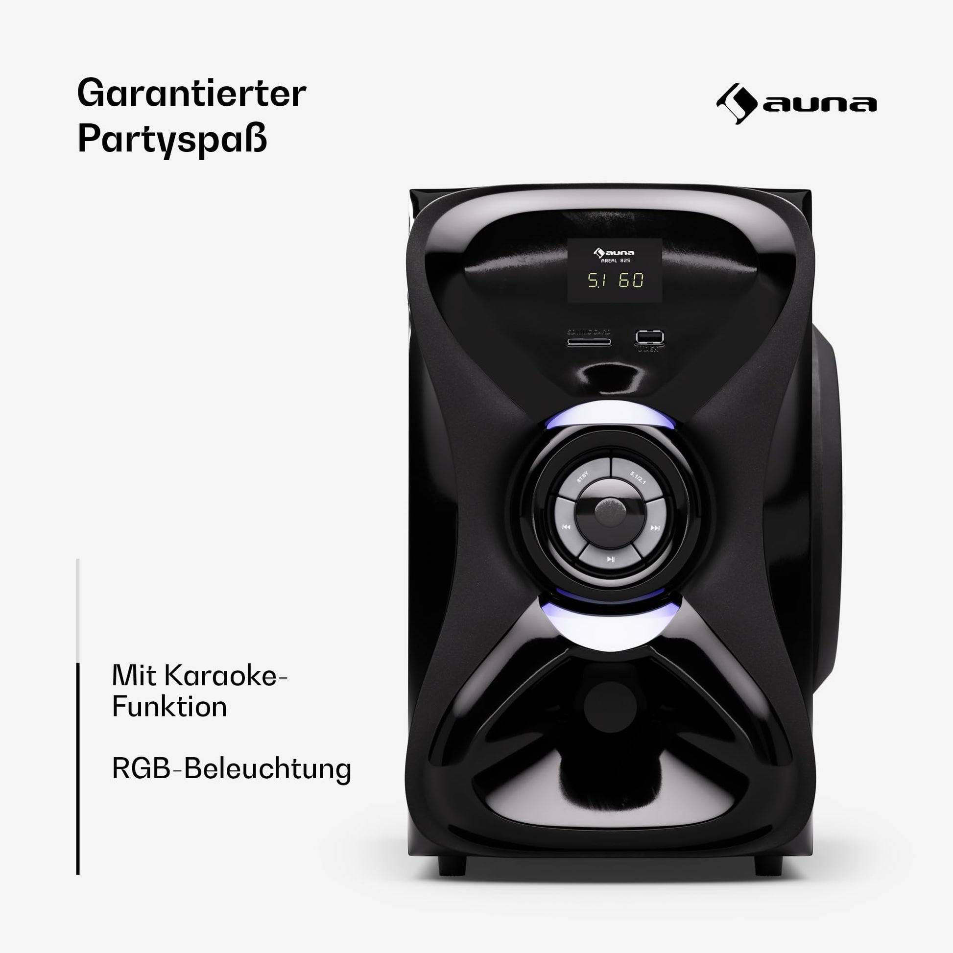 auna Areal 825 5.1 wireless sound system with Bluetooth, 100W subwoofer, and RGB lighting - USB/SD ports, AUX and optical input, home theater speakers with remote control.