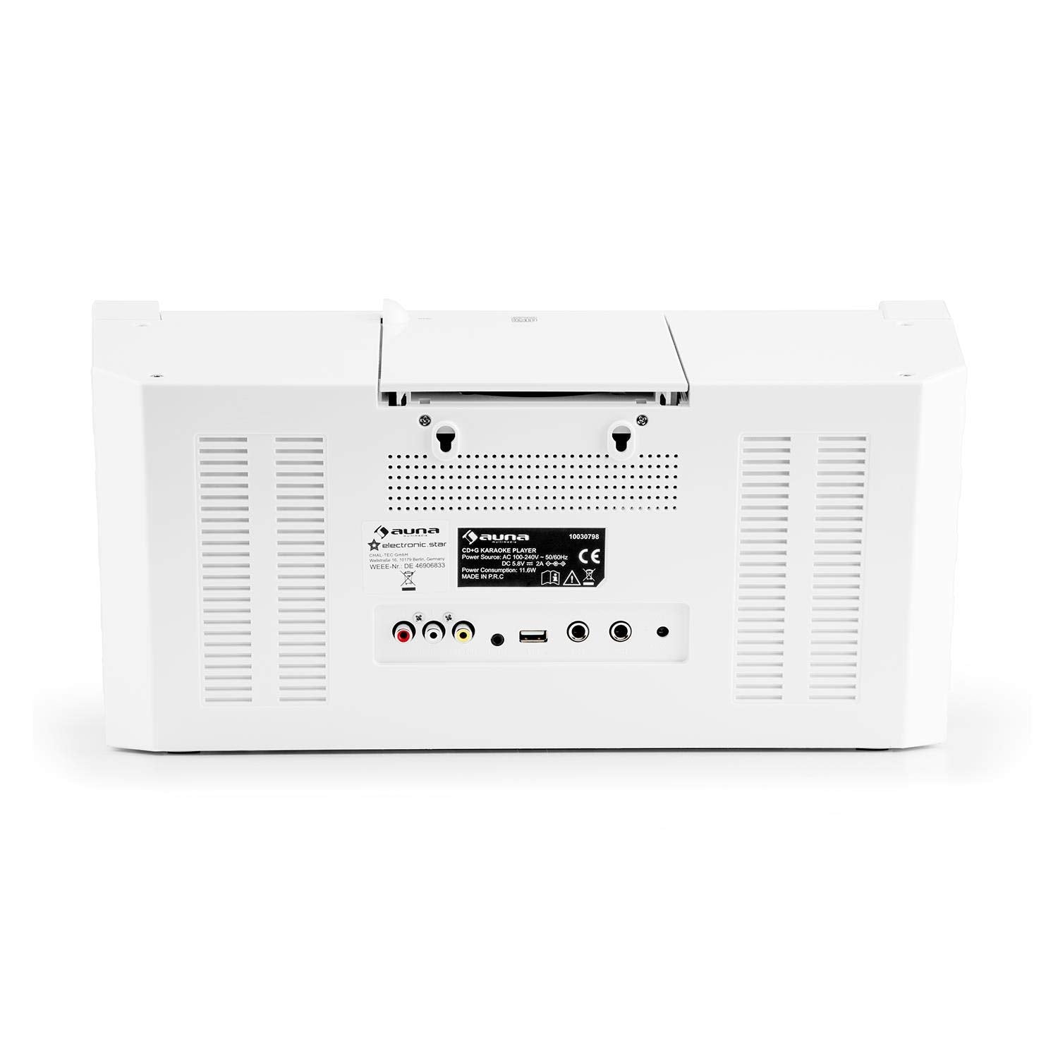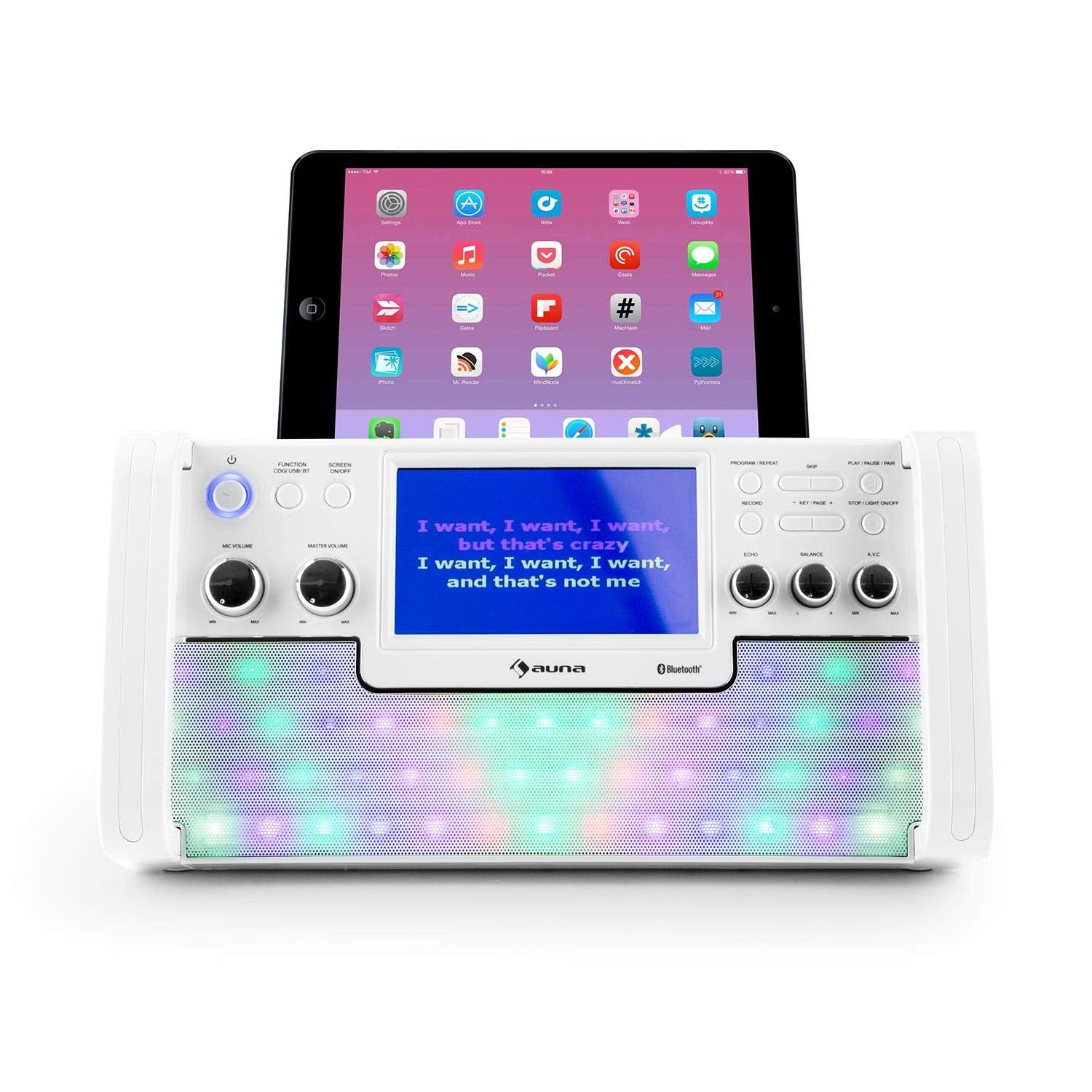 AUNA DiscoFever LED Edition - Karaoke system, machine with Bluetooth, 7" TFT screen, recording function, CD player, USB port, MP3 support, microphone, and karaoke CD, white.